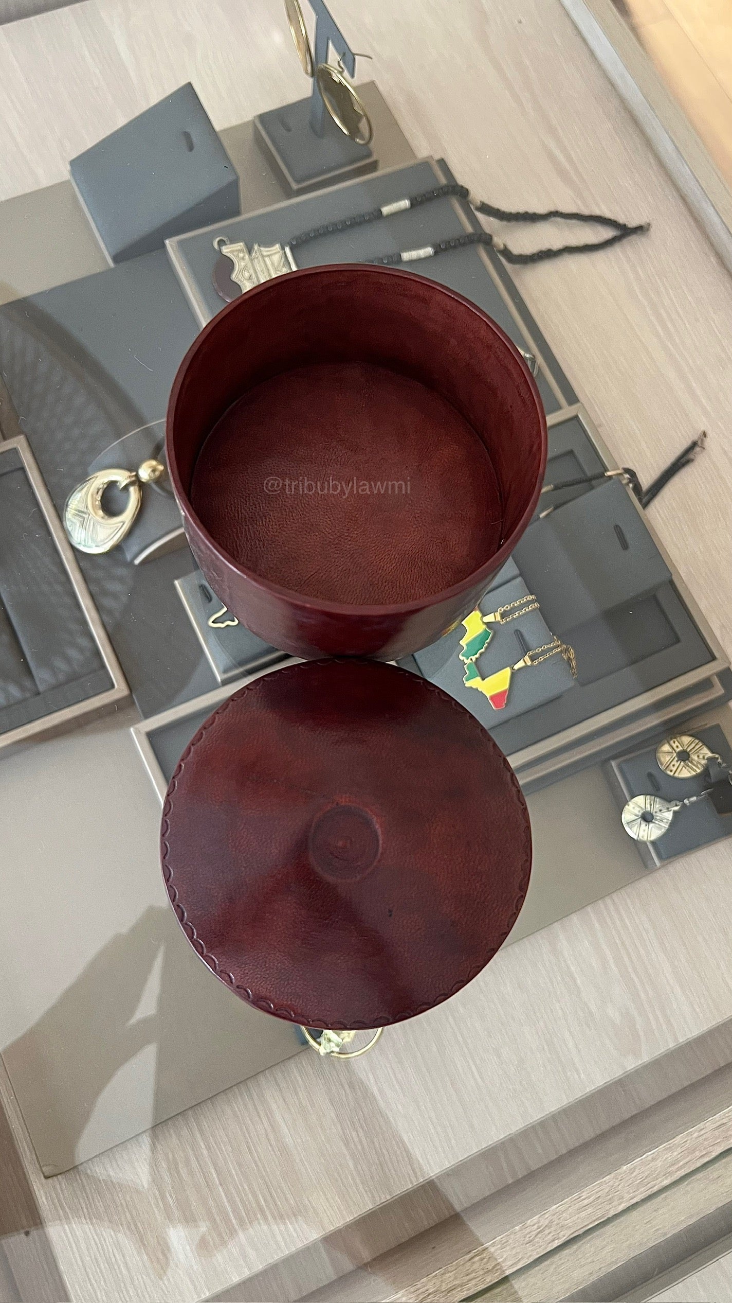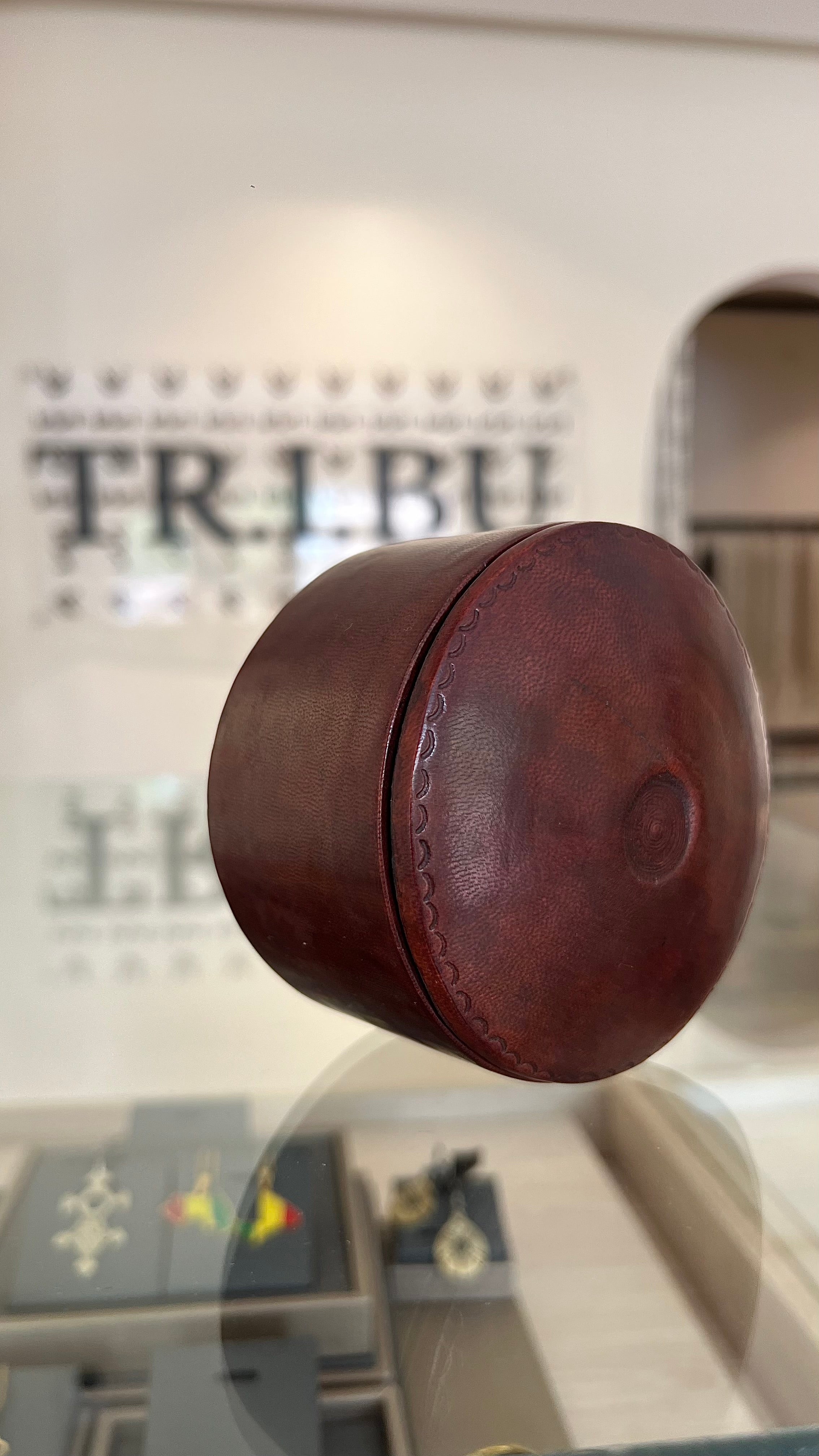 Cette boîte à bijoux ronde est réalisée en cuir marron foncé, avec un couvercle assorti délicatement bordé de coutures apparentes. Son intérieur lisse et épuré en fait un écrin raffiné, idéal pour préserver bijoux et petits trésors avec élégance et sobriété.