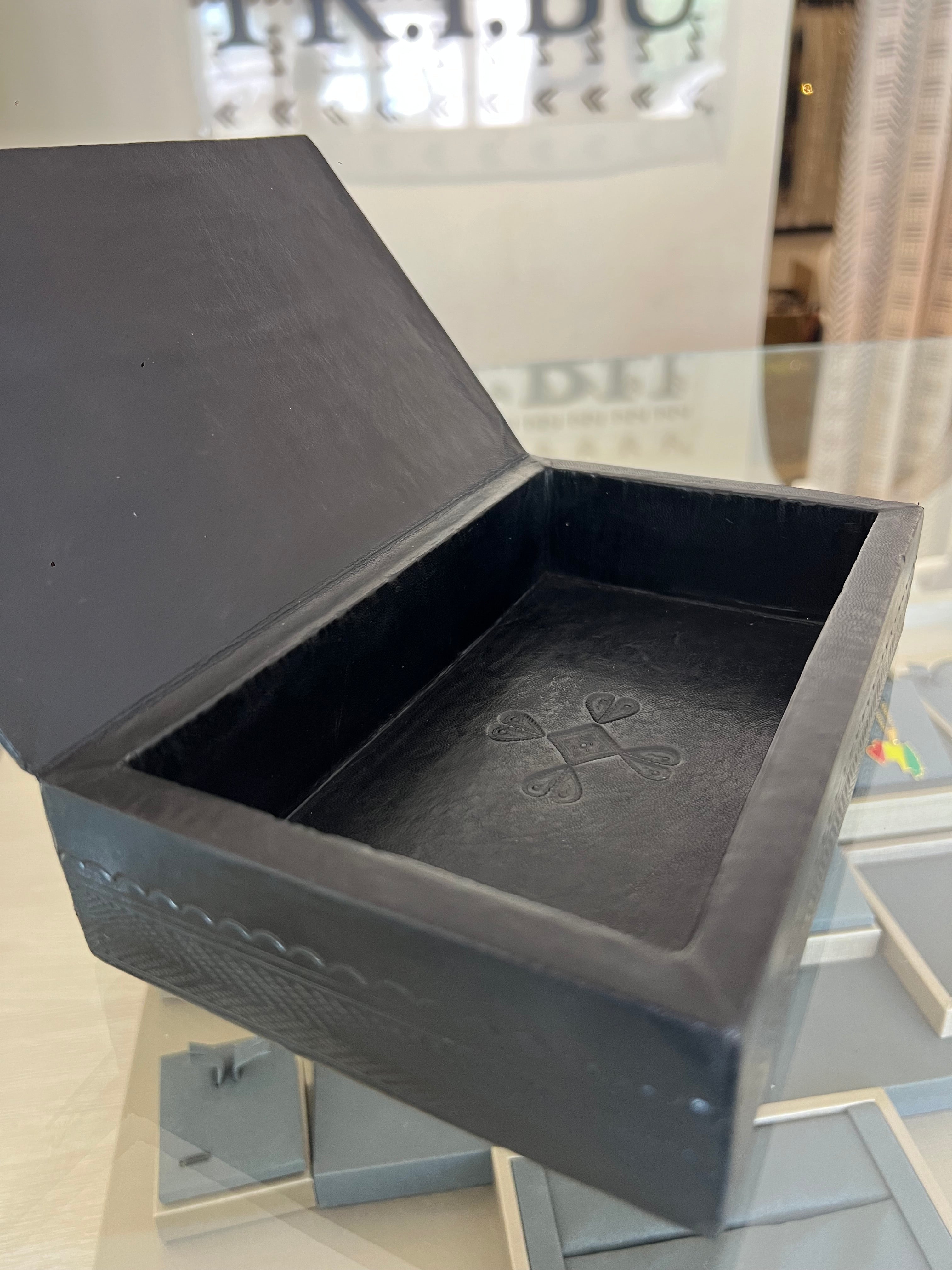 Cette boîte à bijoux artisanale est entièrement recouverte de cuir, offrant une texture douce et élégante qui lui confère un charme raffiné.