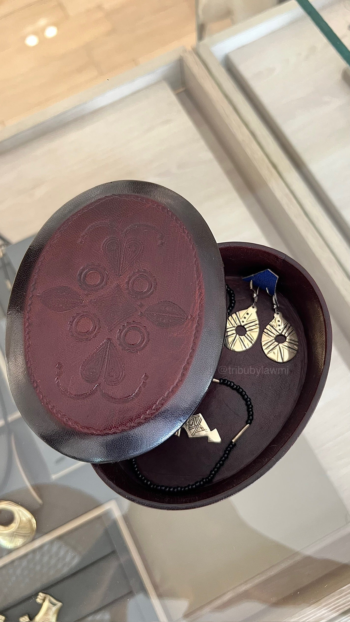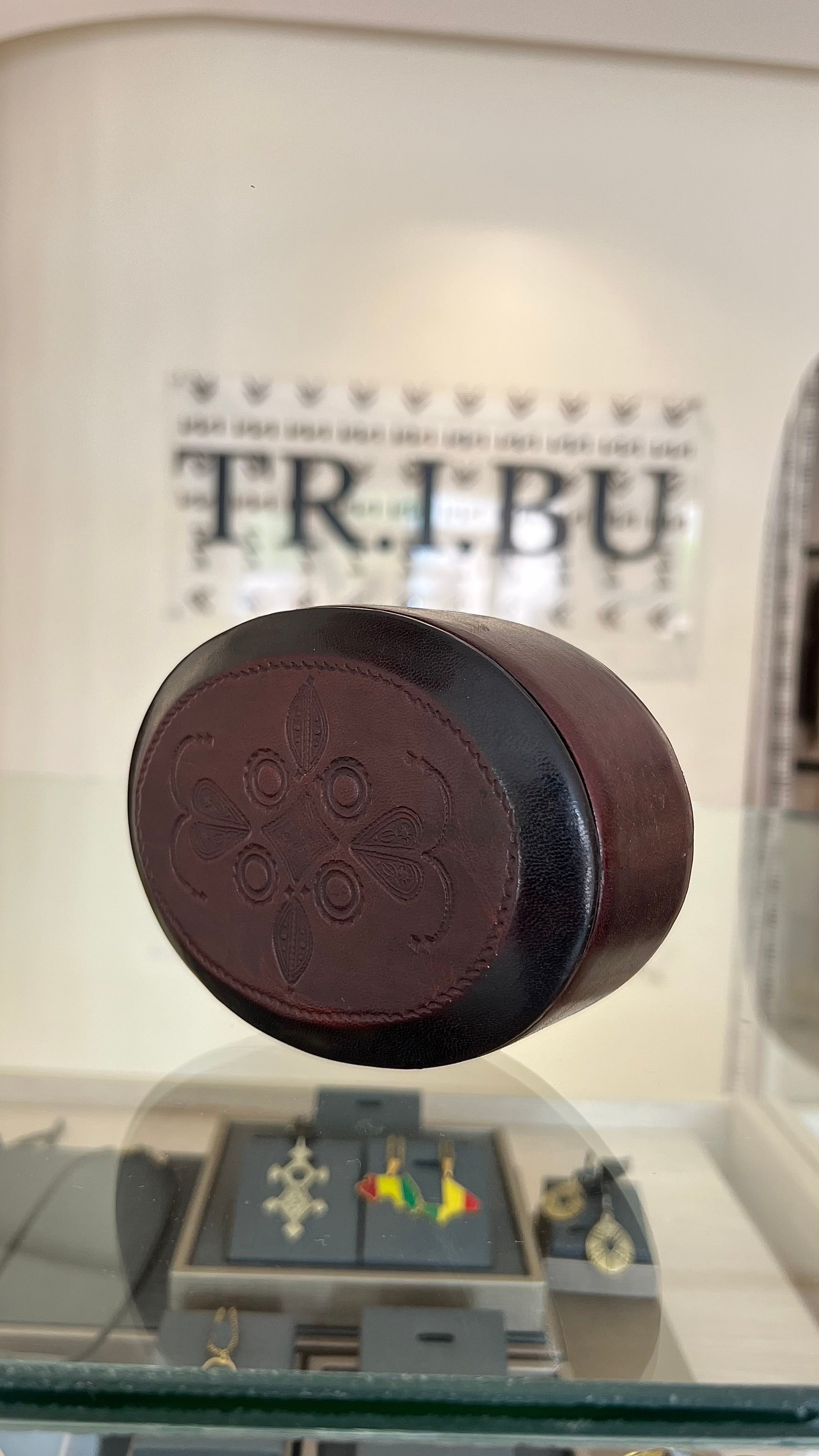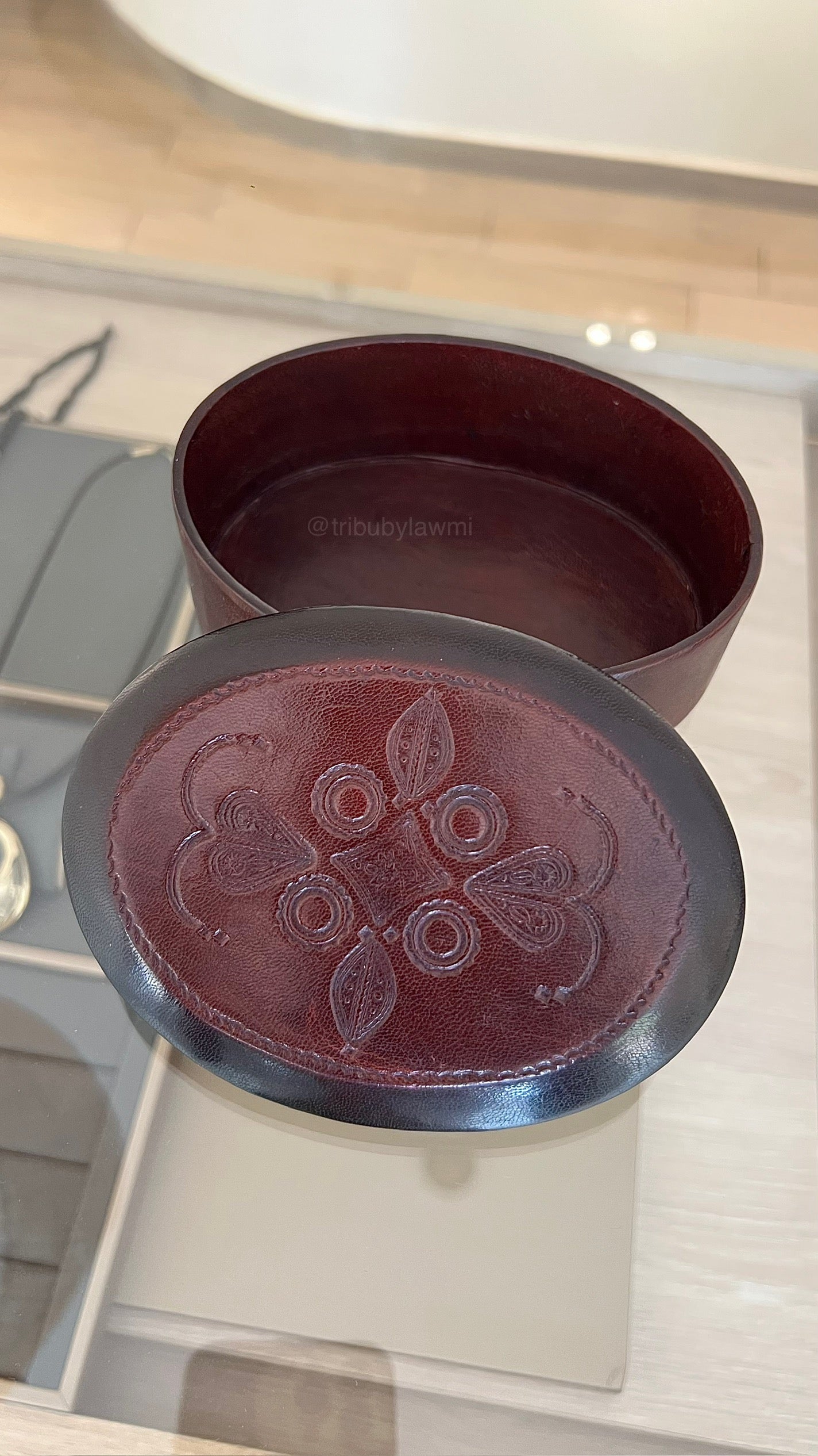 Boîte à bijoux ronde en cuir bordeaux, ornée d’un motif floral embossé sur le couvercle. Son design raffiné allie tradition artisanale et charme intemporel.
