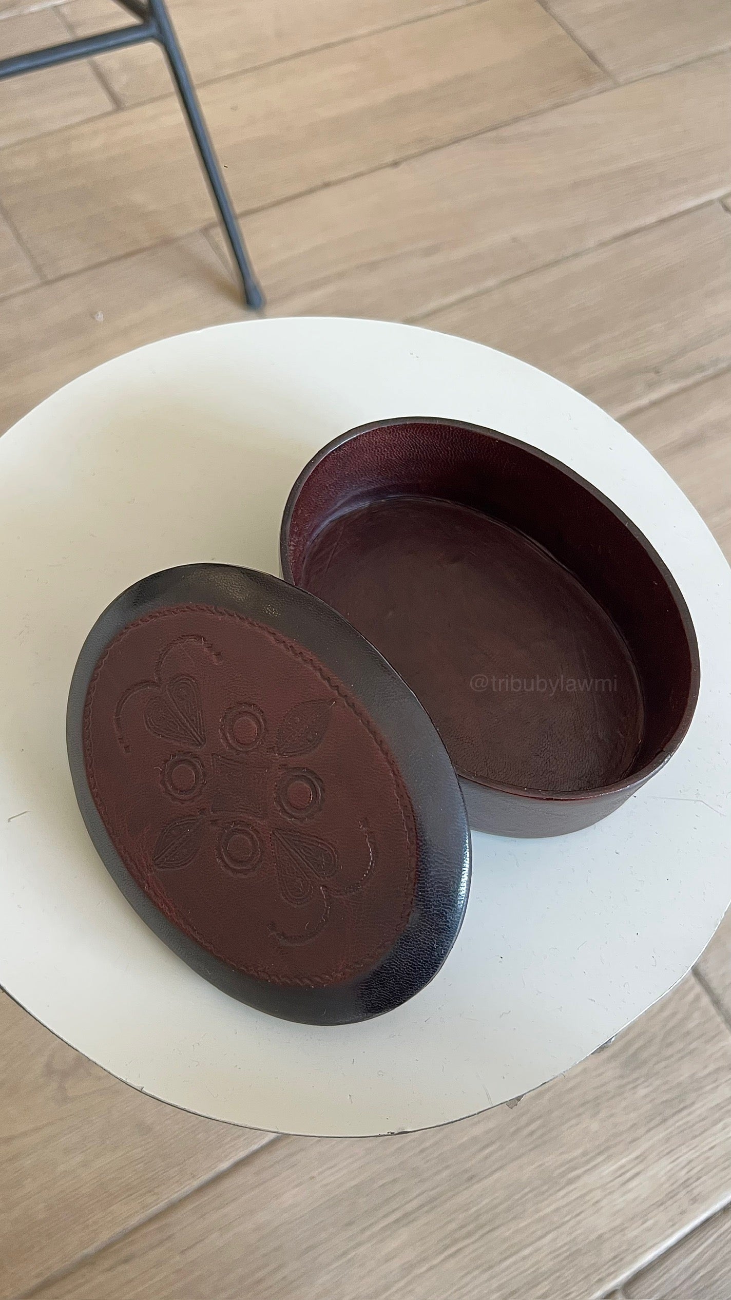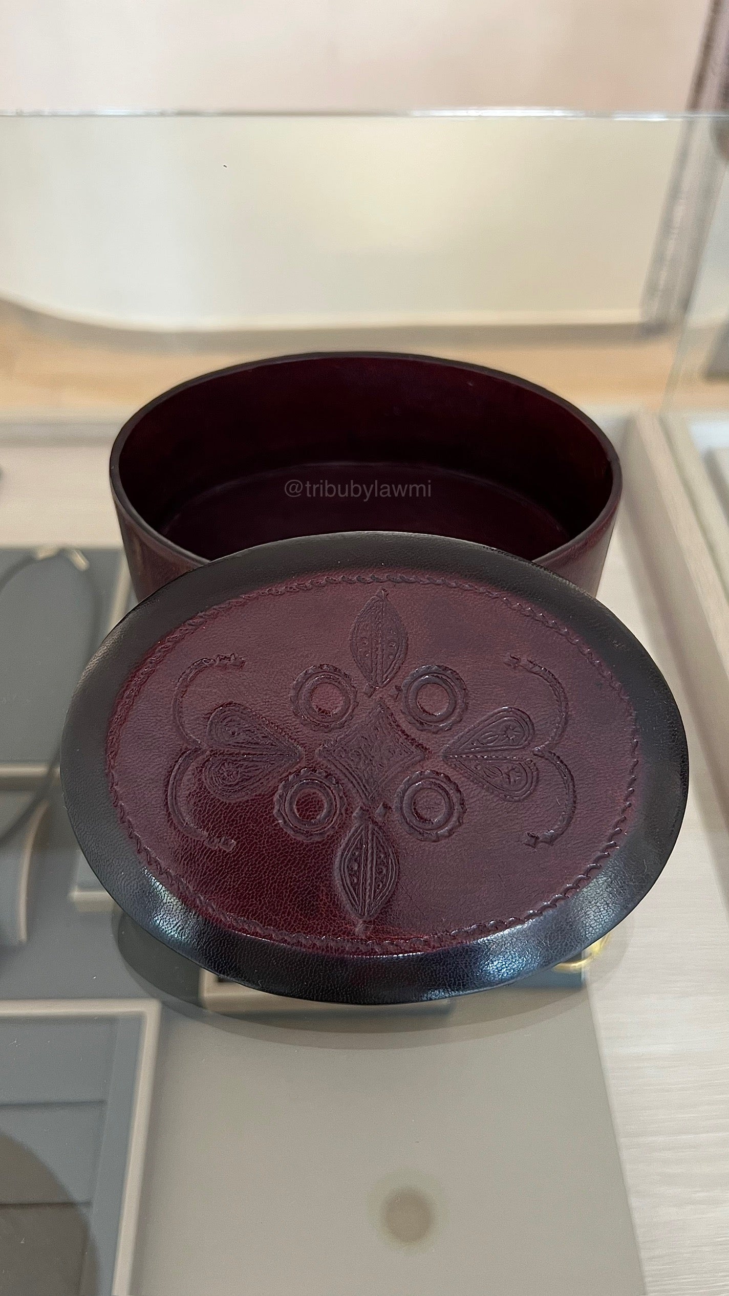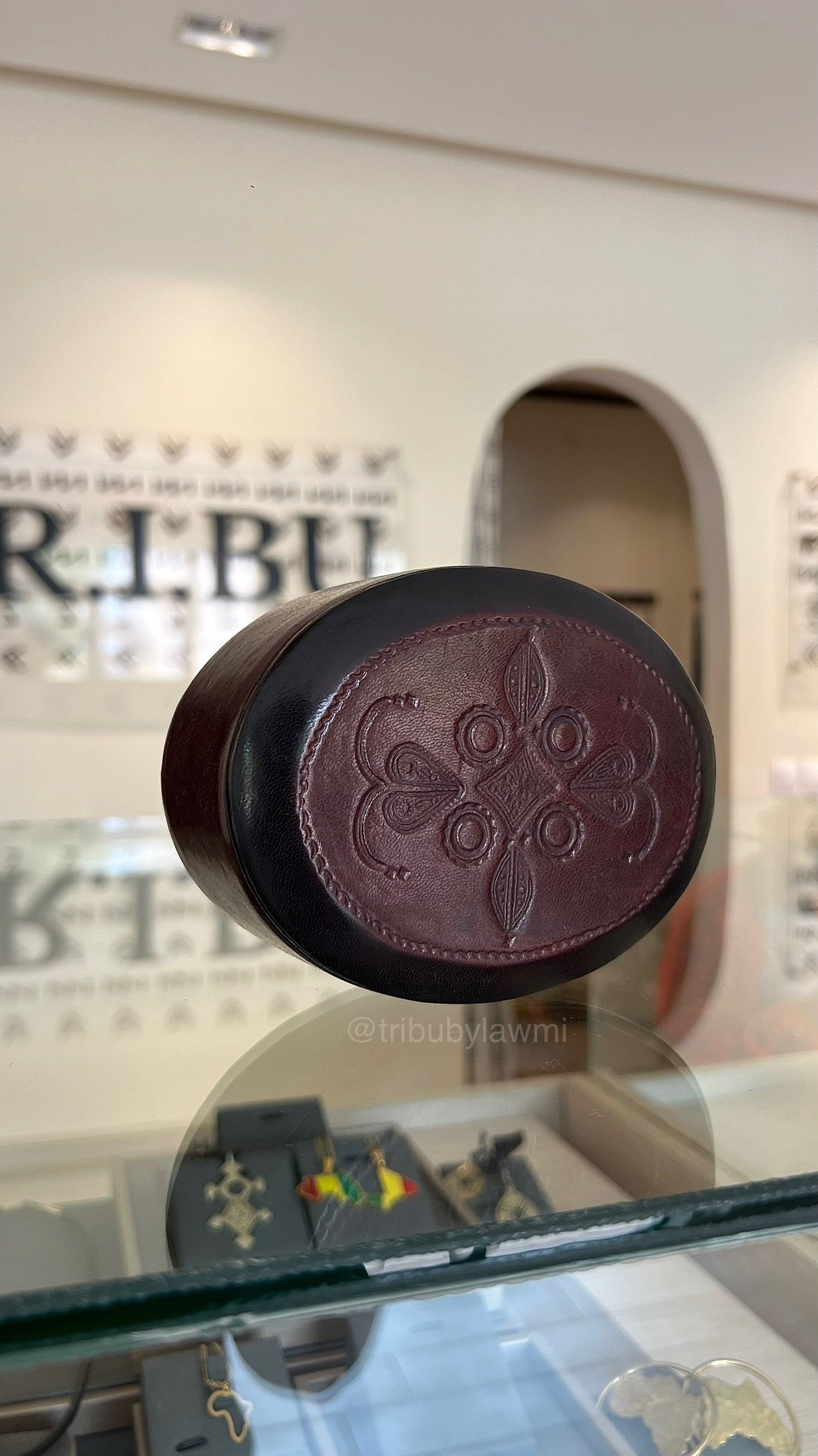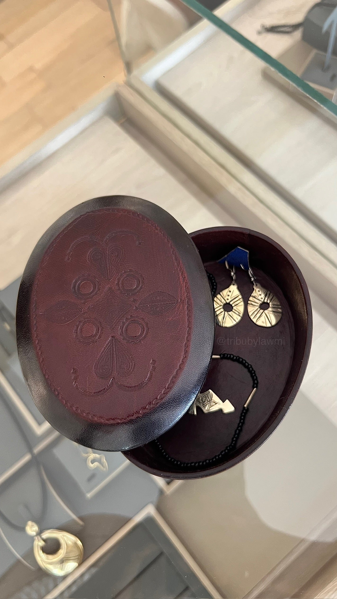 Boîte à bijoux ronde en cuir bordeaux, ornée d’un motif floral embossé sur le couvercle. Son design raffiné allie tradition artisanale et charme intemporel.