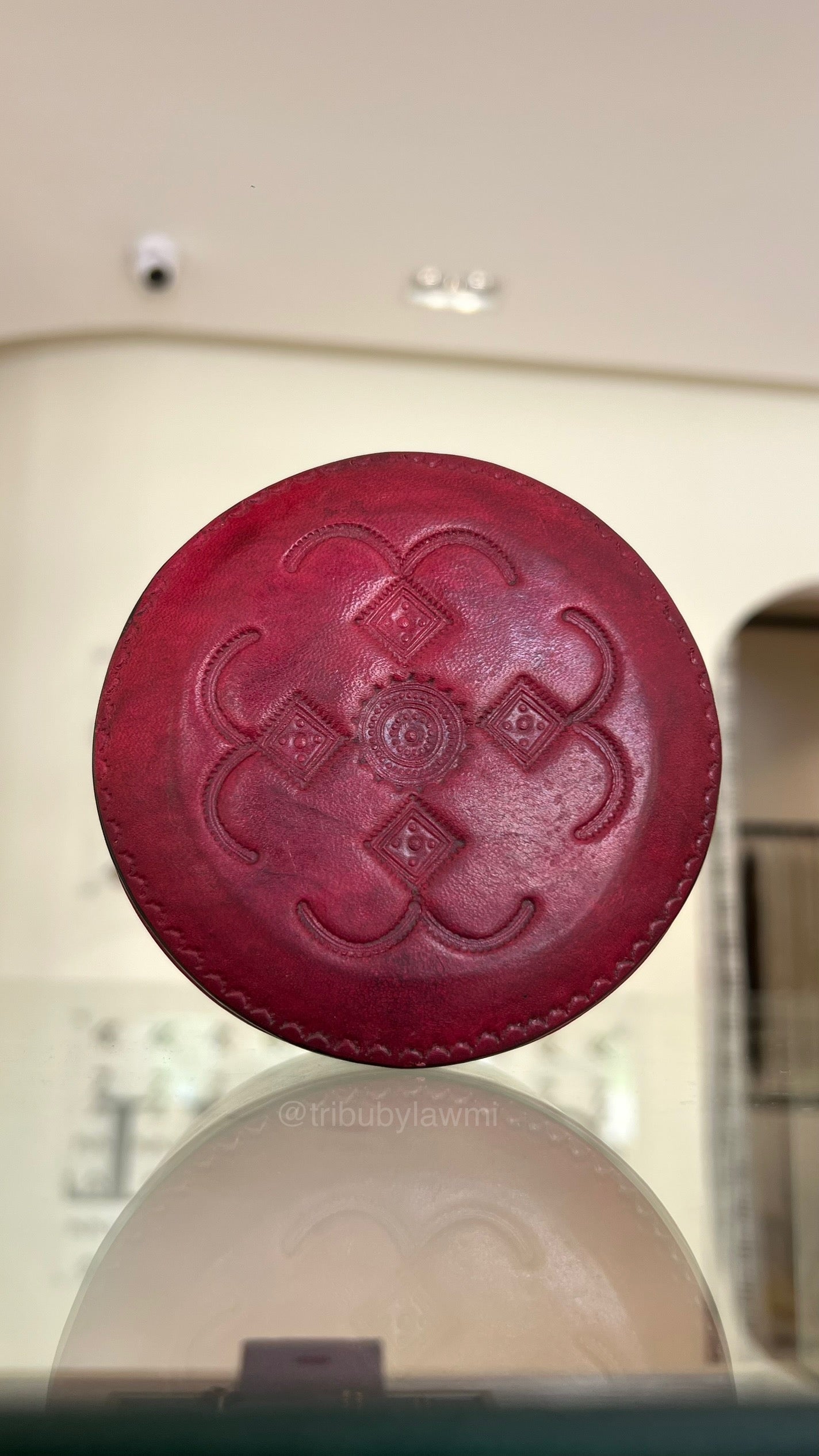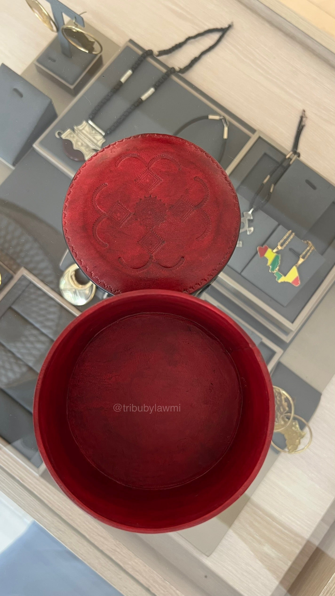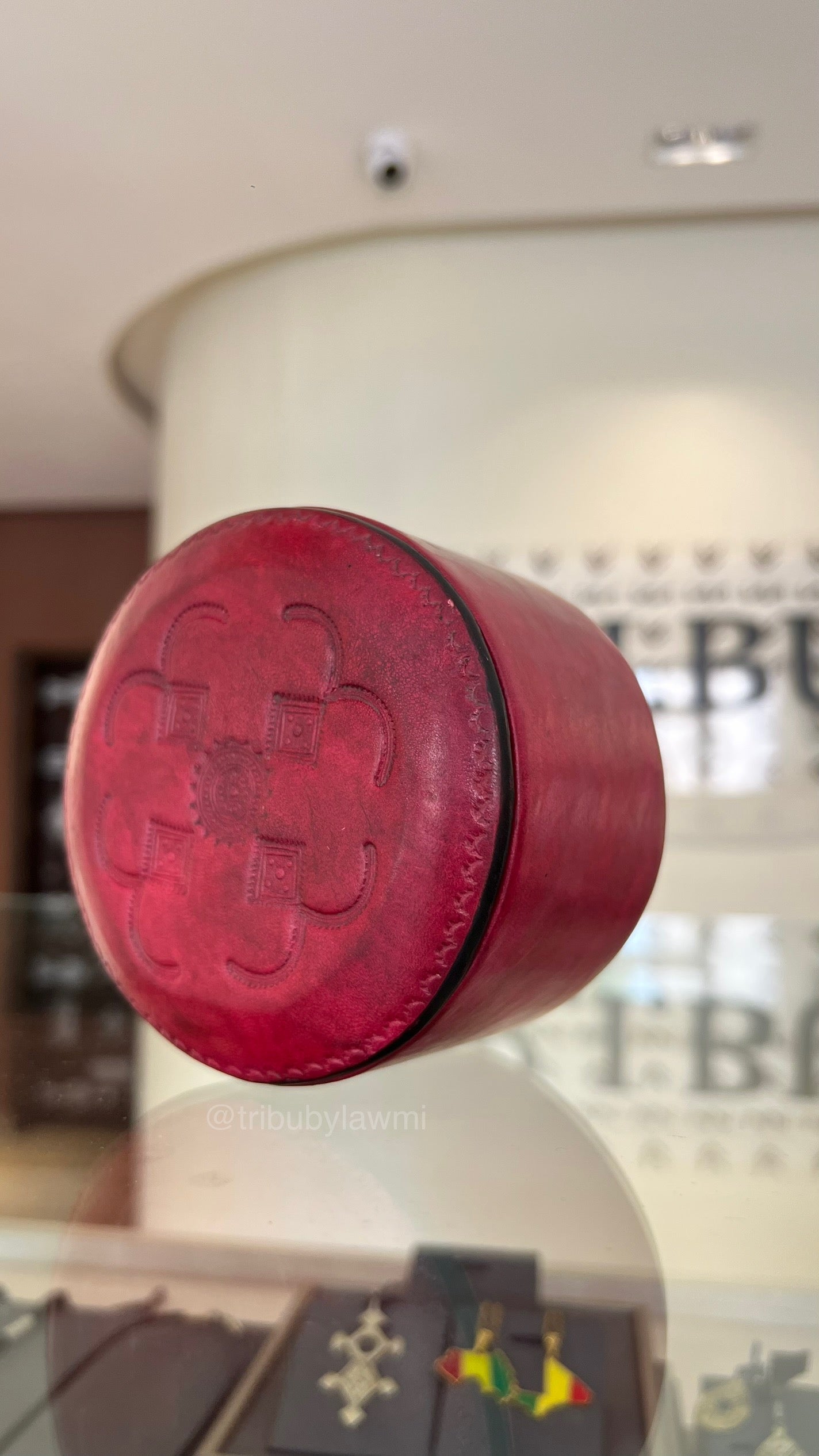 Boîte à bijoux ronde en cuir rouge, façonnée à la main et gravée de motifs traditionnels au couvercle. Un objet simple et vrai, issu du savoir-faire artisanal, pour garder vos bijoux avec caractère et chaleur.