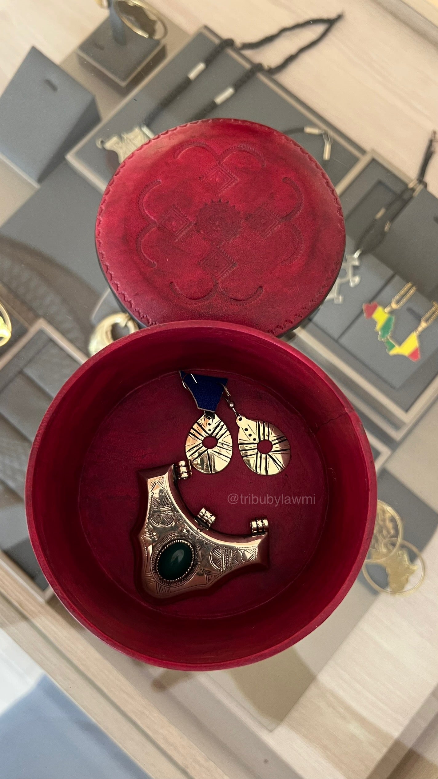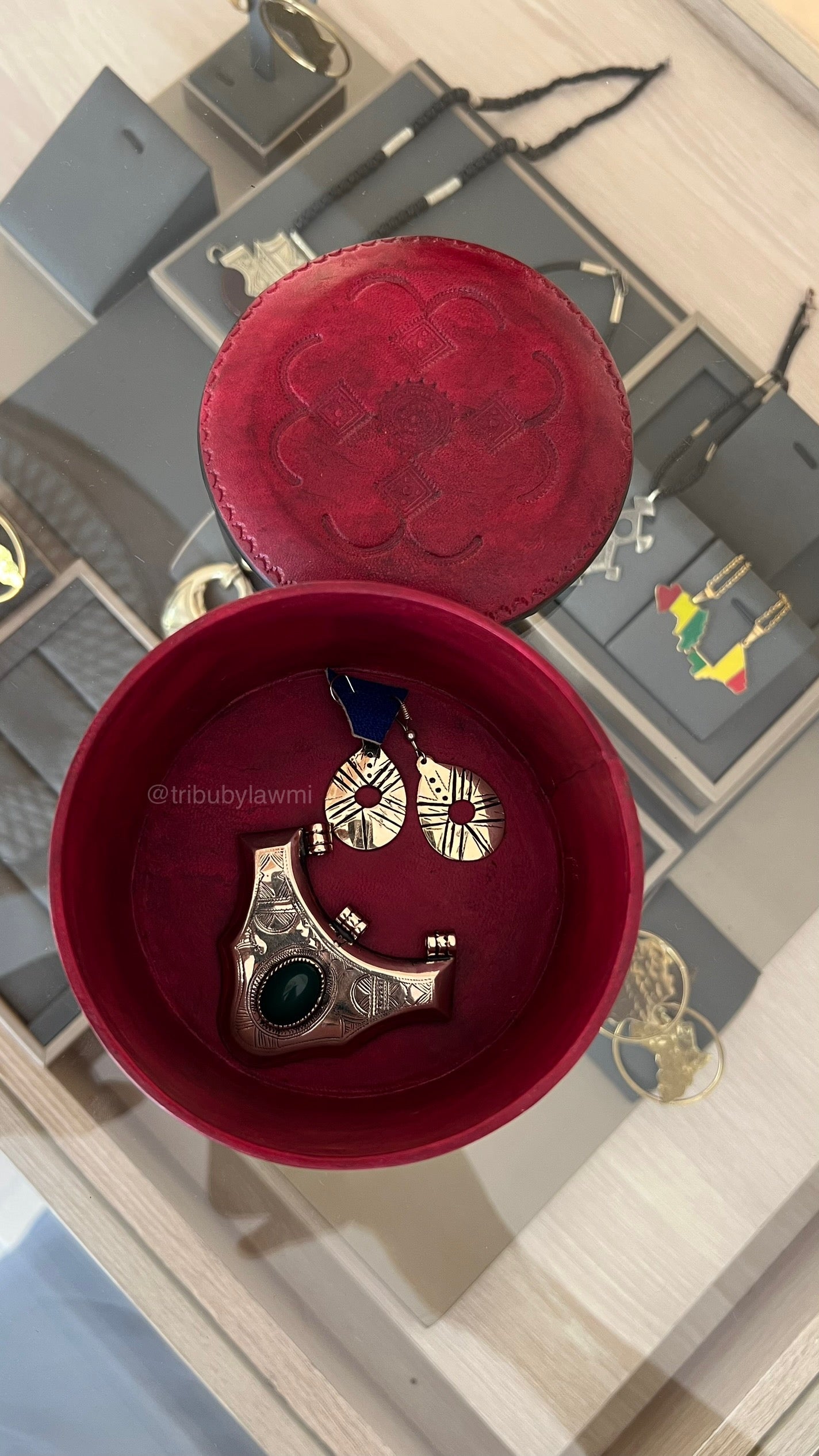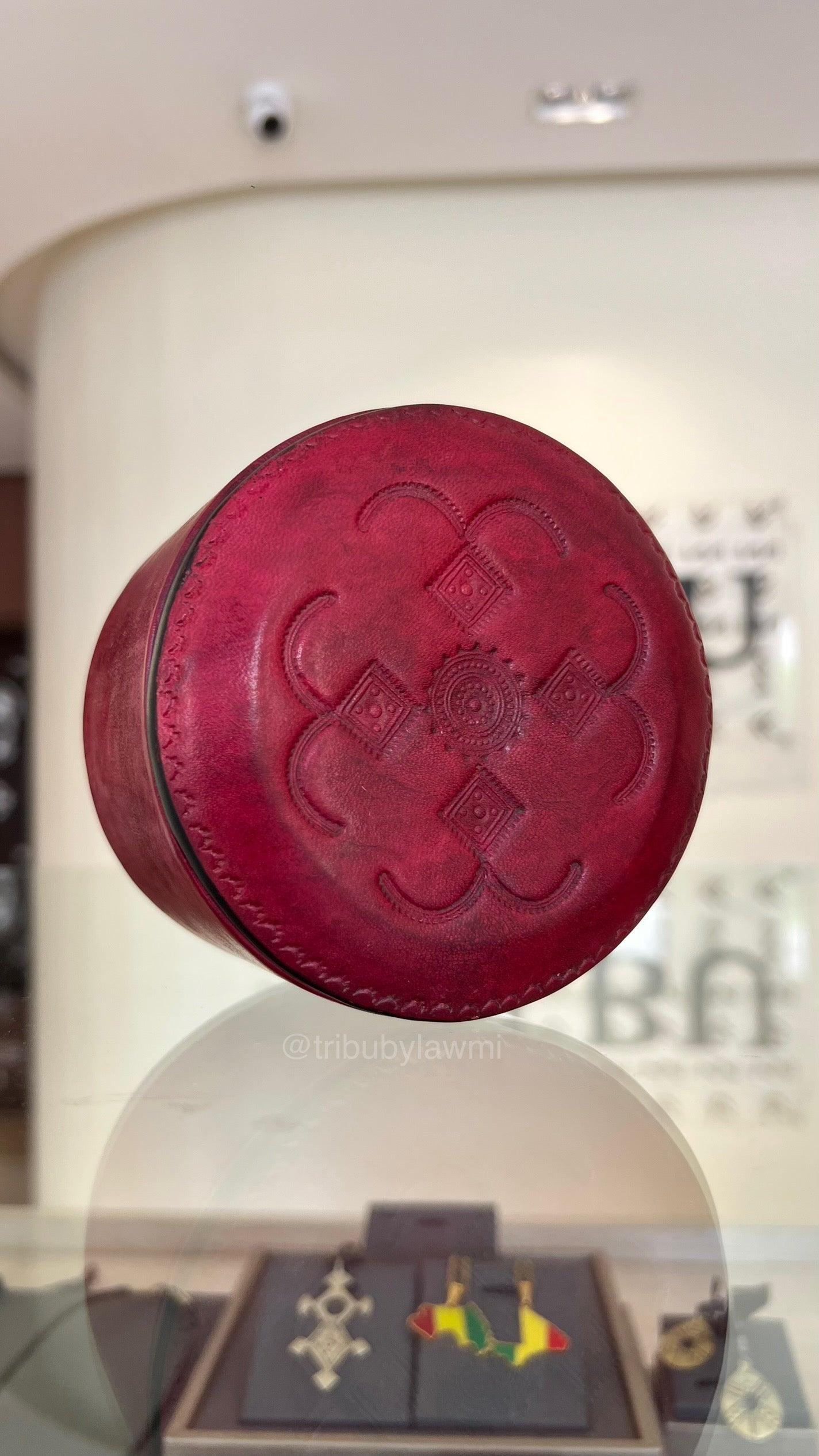 Boîte à bijoux ronde en cuir rouge, façonnée à la main et gravée de motifs traditionnels au couvercle. Un objet simple et vrai, issu du savoir-faire artisanal, pour garder vos bijoux avec caractère et chaleur.