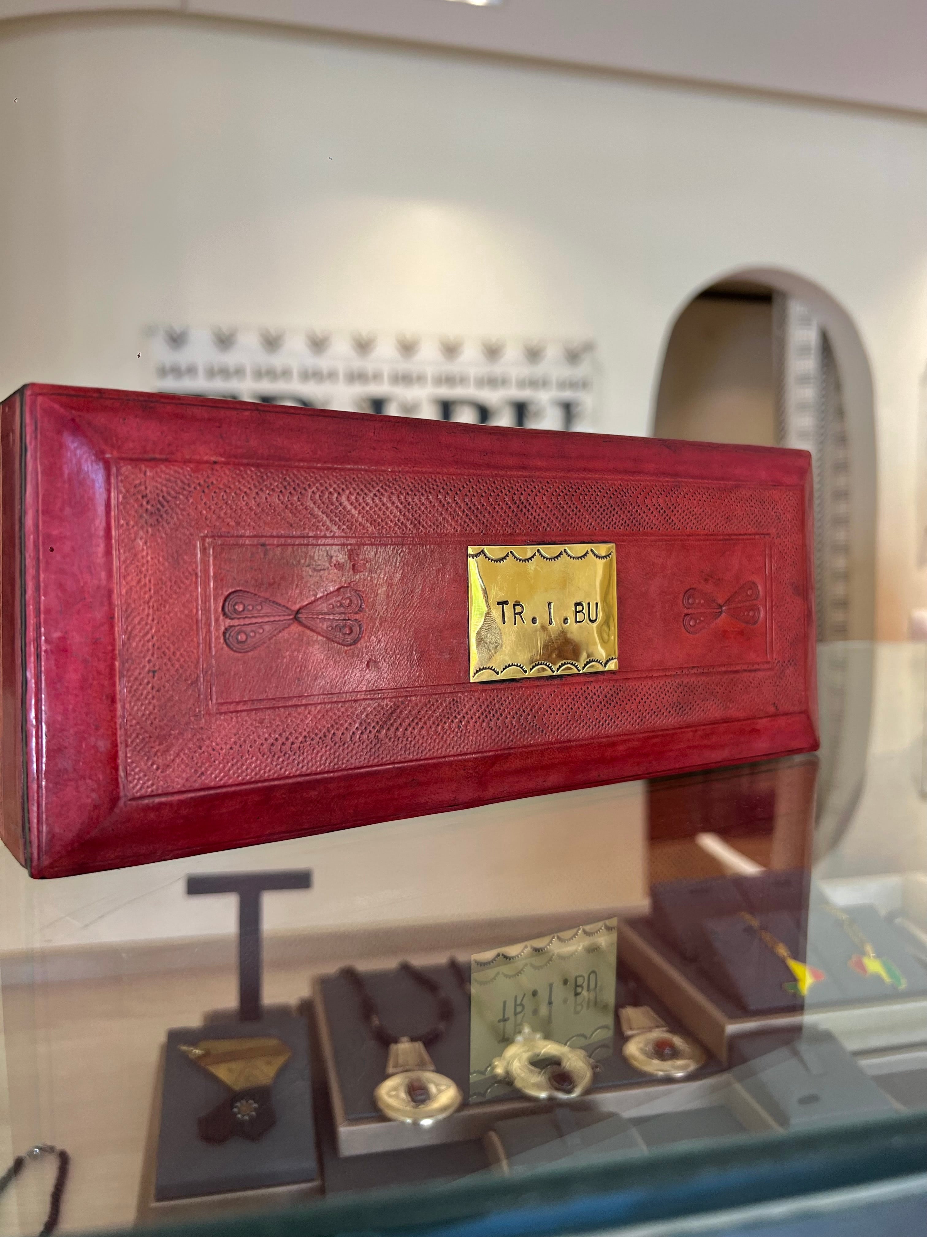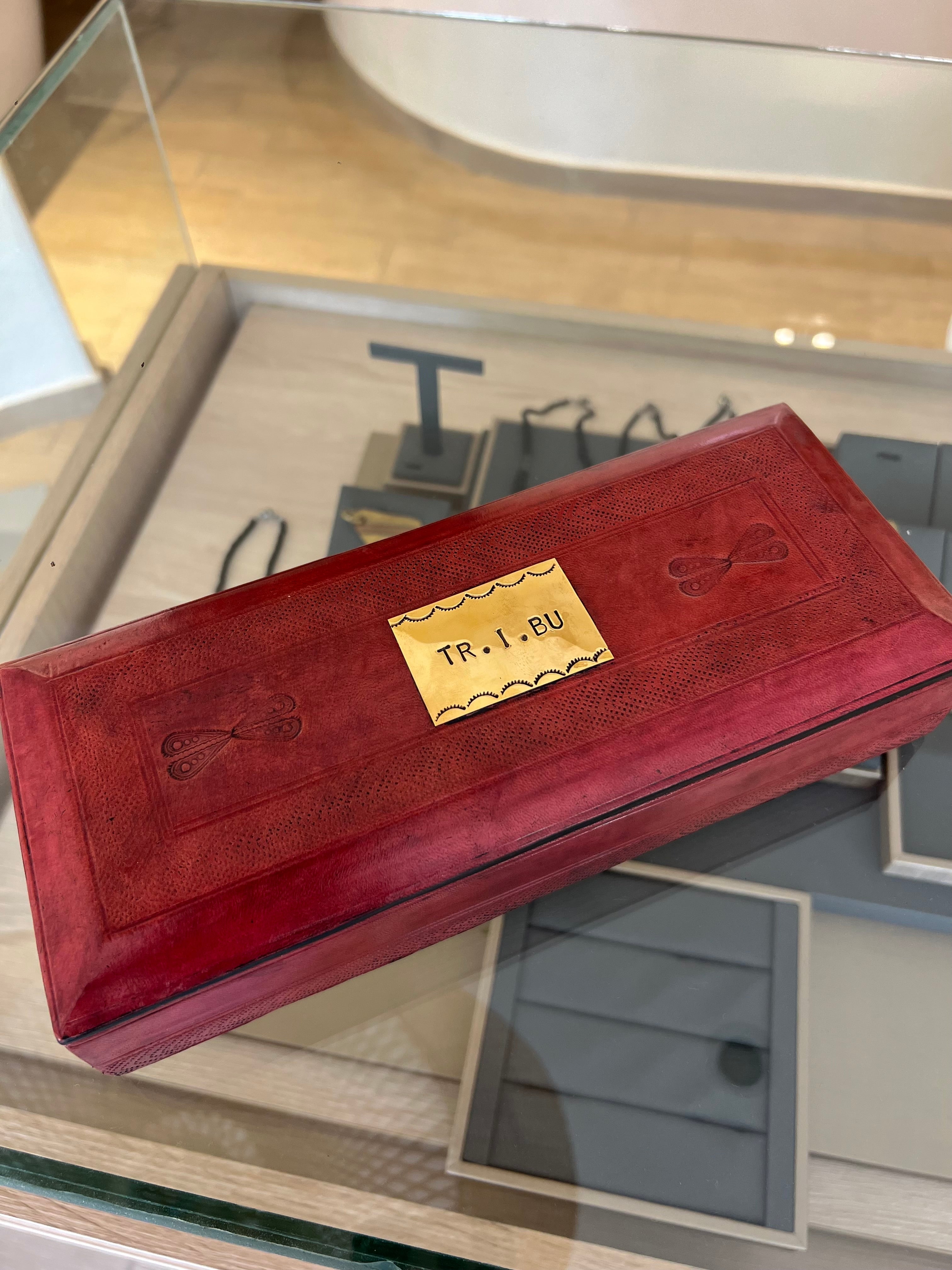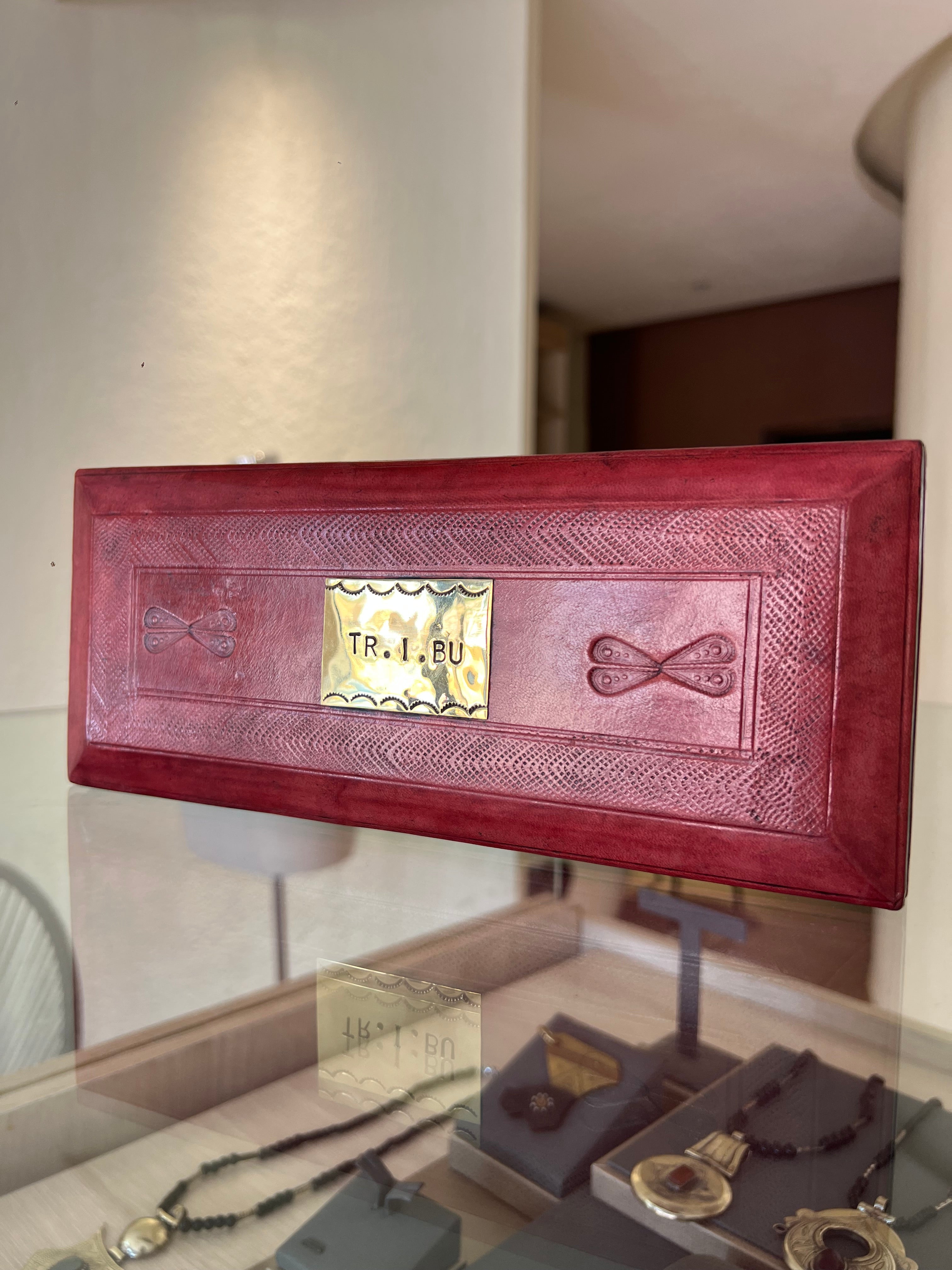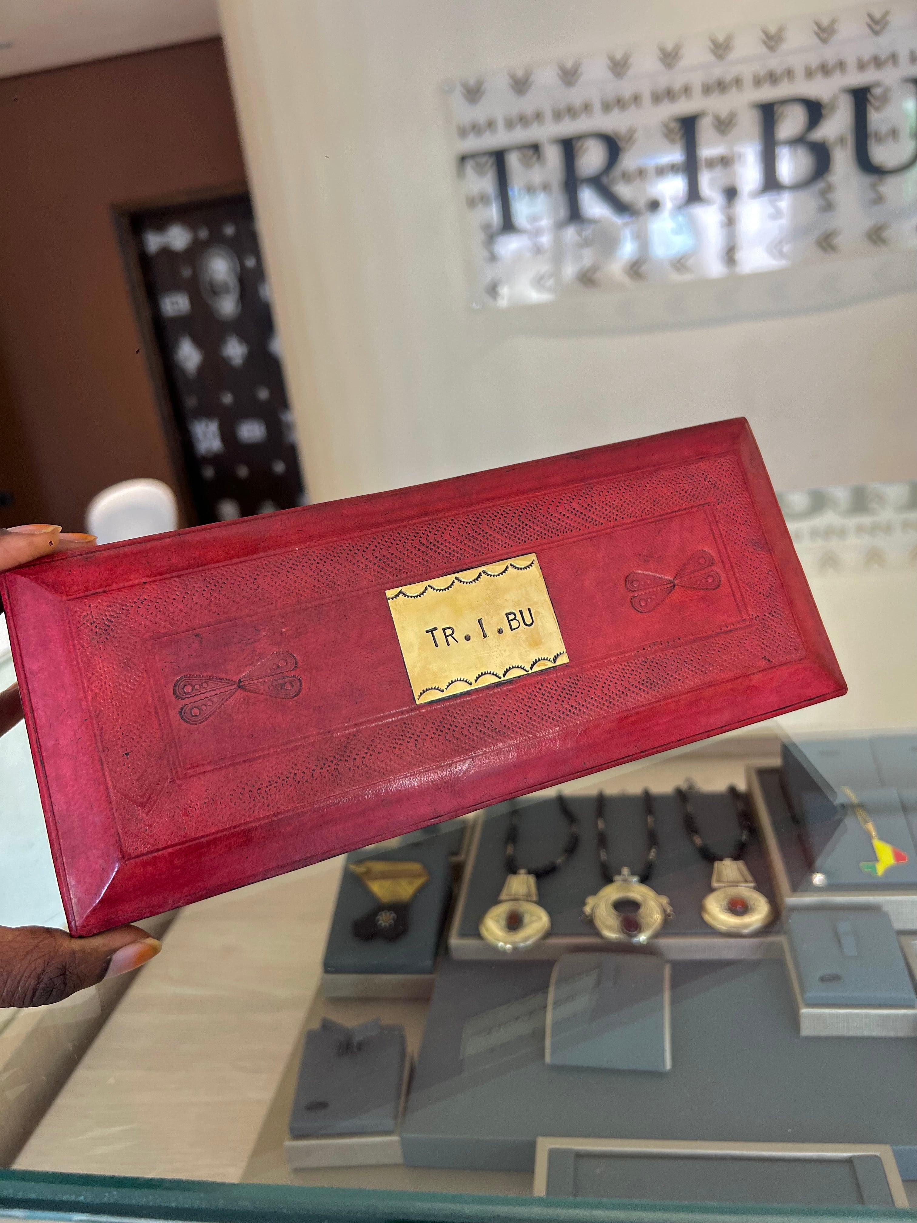 Sur le dessus, un stamp métallique délicatement gravé affiche fièrement la marque TR.I.BU, ajoutant une touche d’authenticité et de prestige.