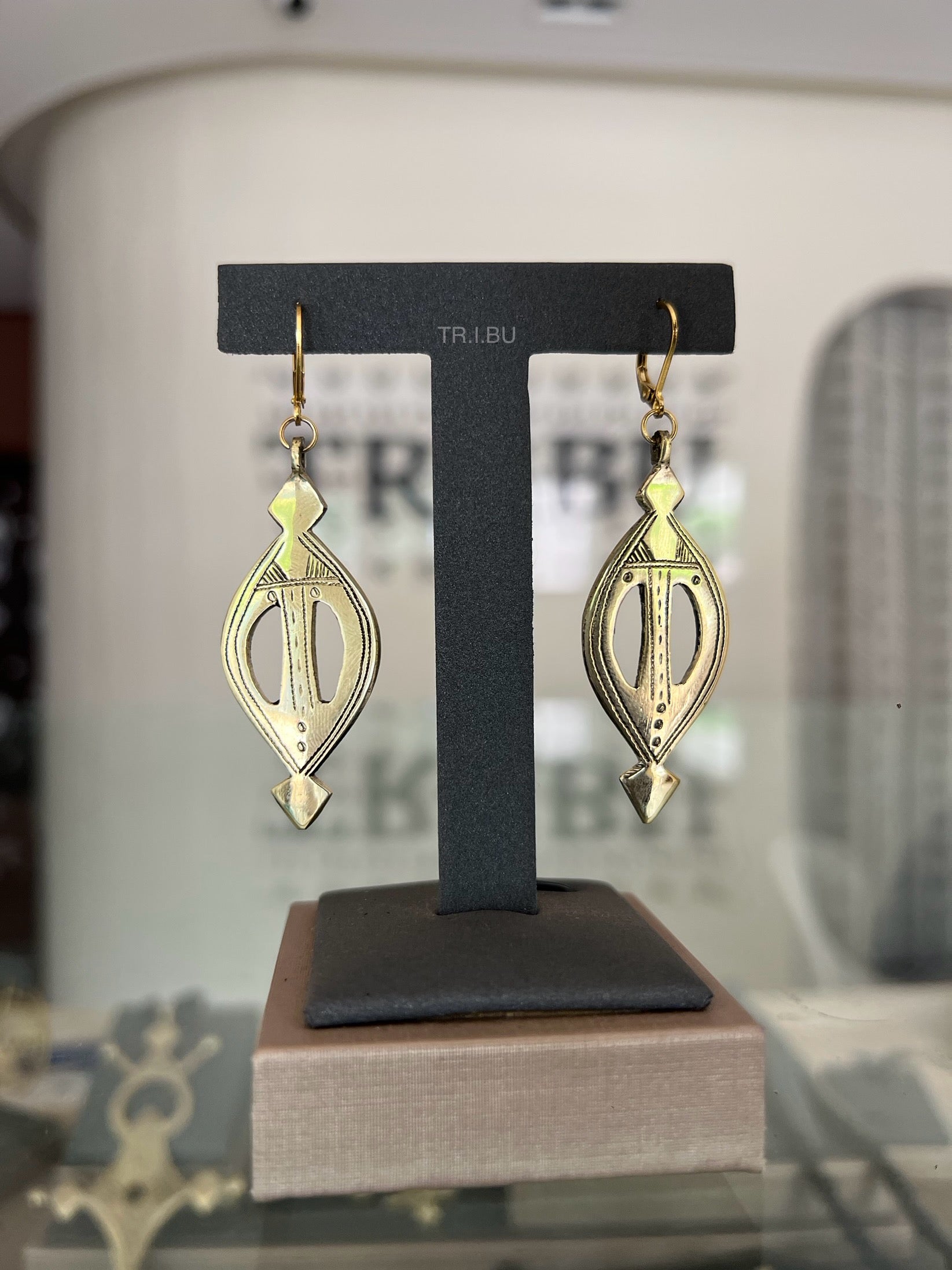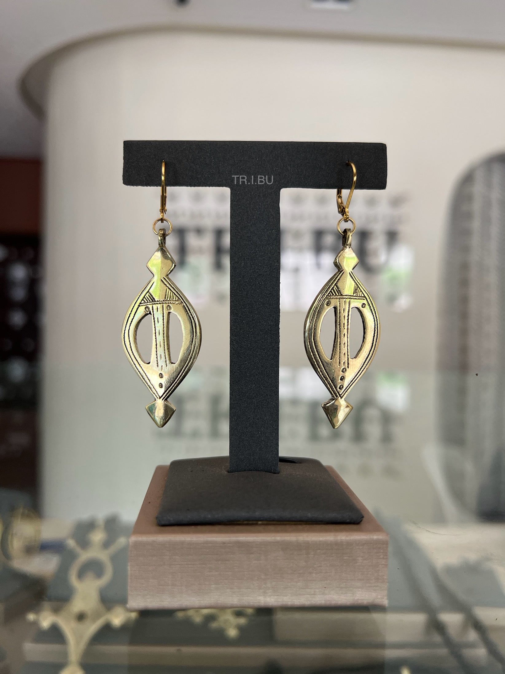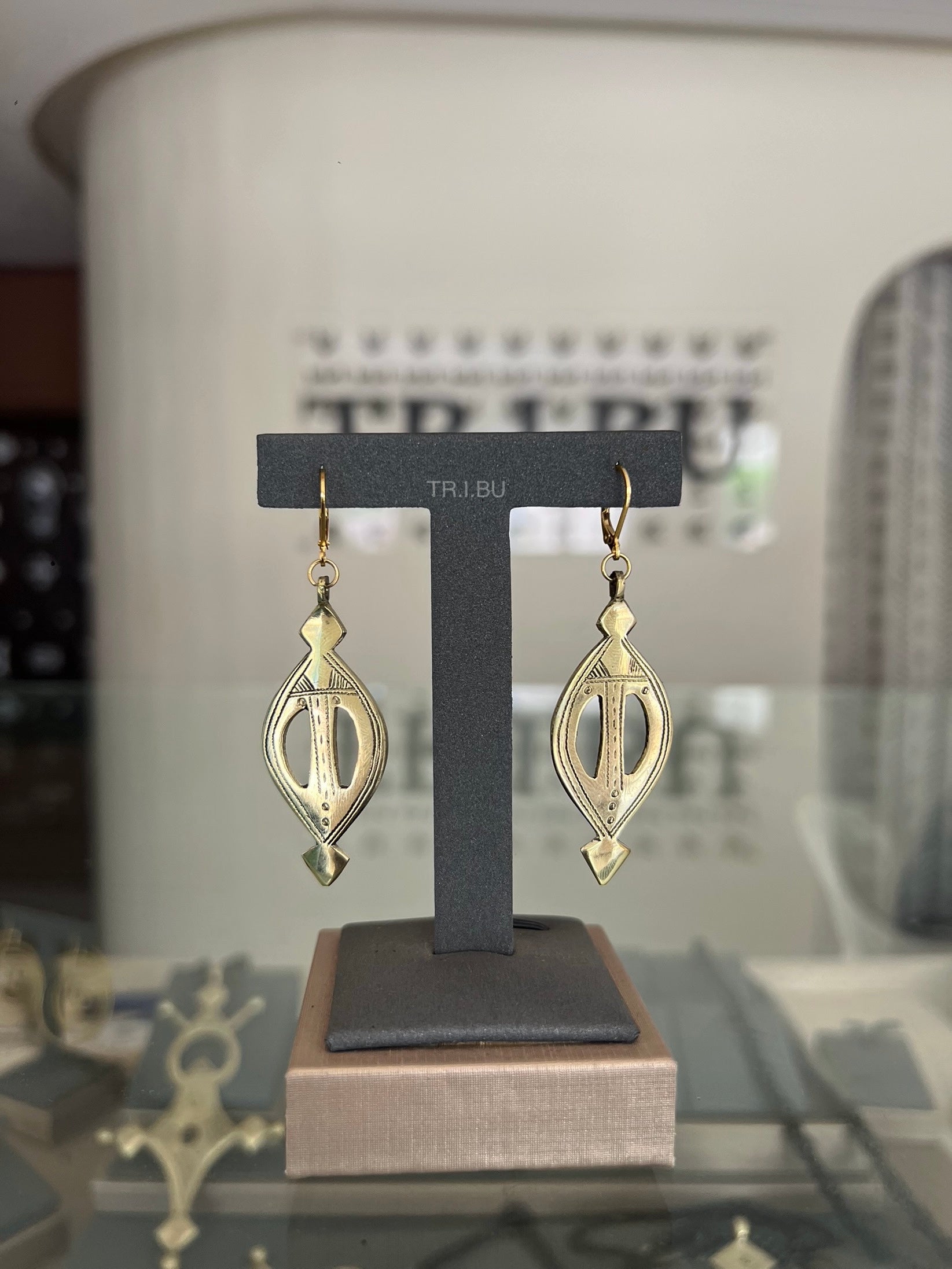 Boucles d’oreilles en laiton doré au design traditionnel, inspirées des motifs touaregs, pour une allure élégante empreinte d’héritage culturel.
