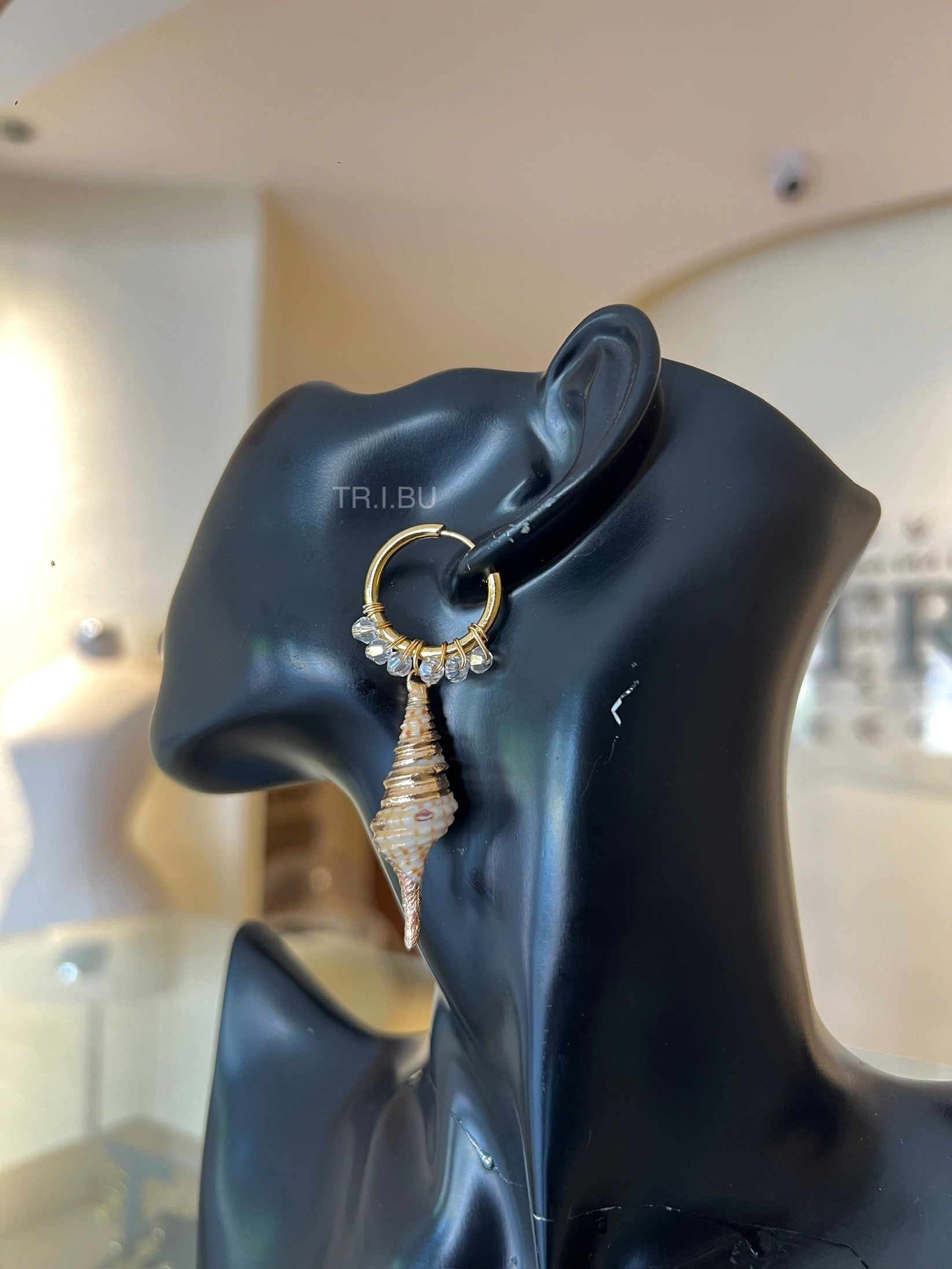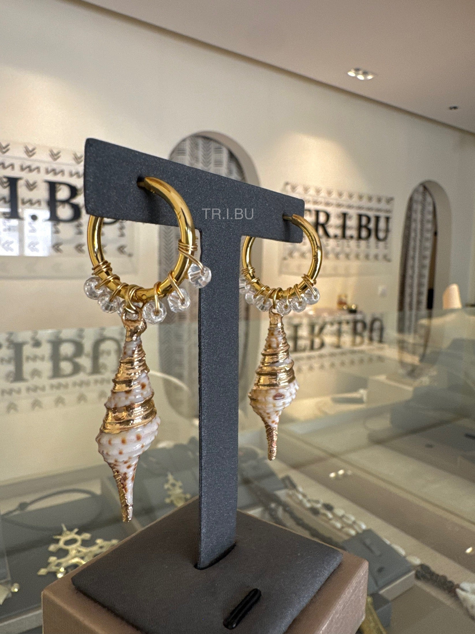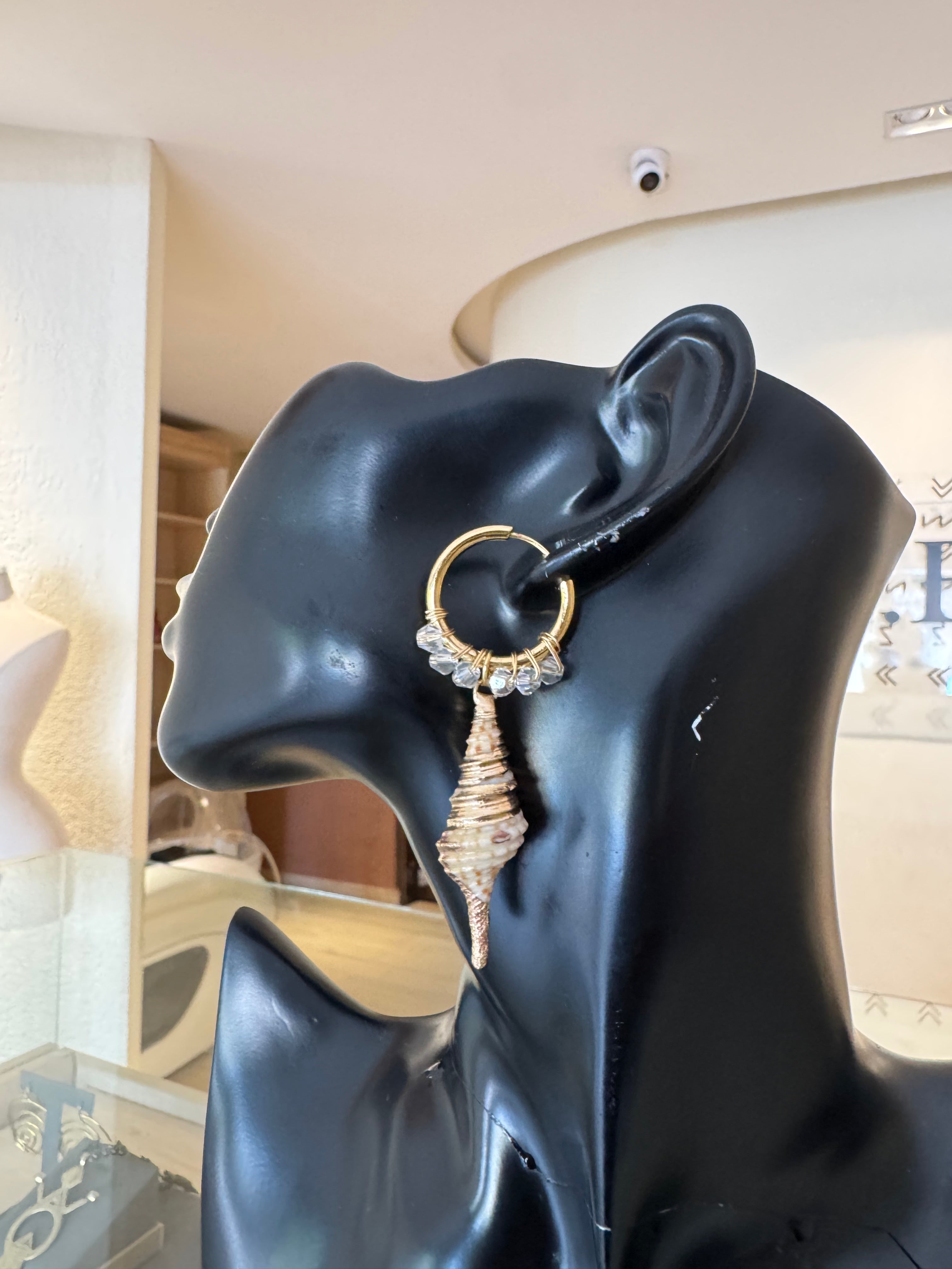 Boucles d’oreilles dorées ornées de perles translucides et sublimées d’un coquillage naturel suspendu, pour une allure élégante qui évoque la mer et l’authenticité.