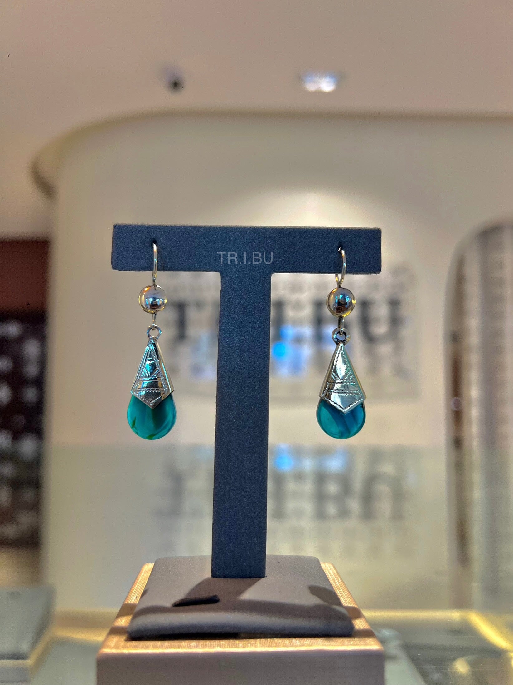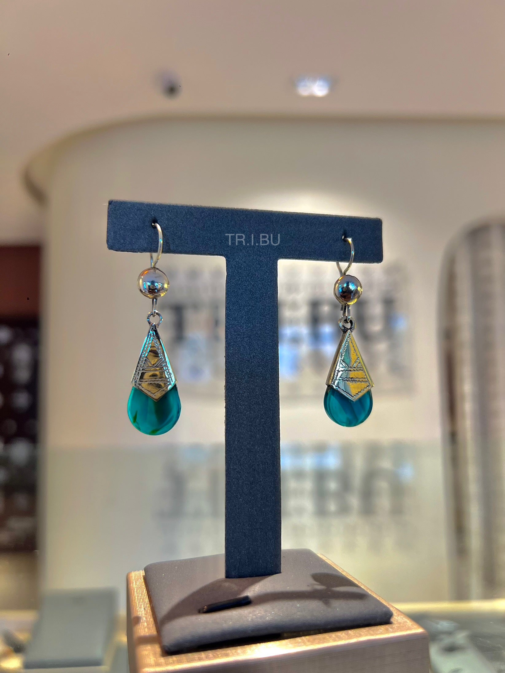 Boucles pendantes en forme de gouttes turquoise, sublimées par un capuchon argenté finement travaillé. Élégantes et lumineuses, elles ajoutent une touche de fraîcheur et de raffinement à vos looks.
