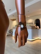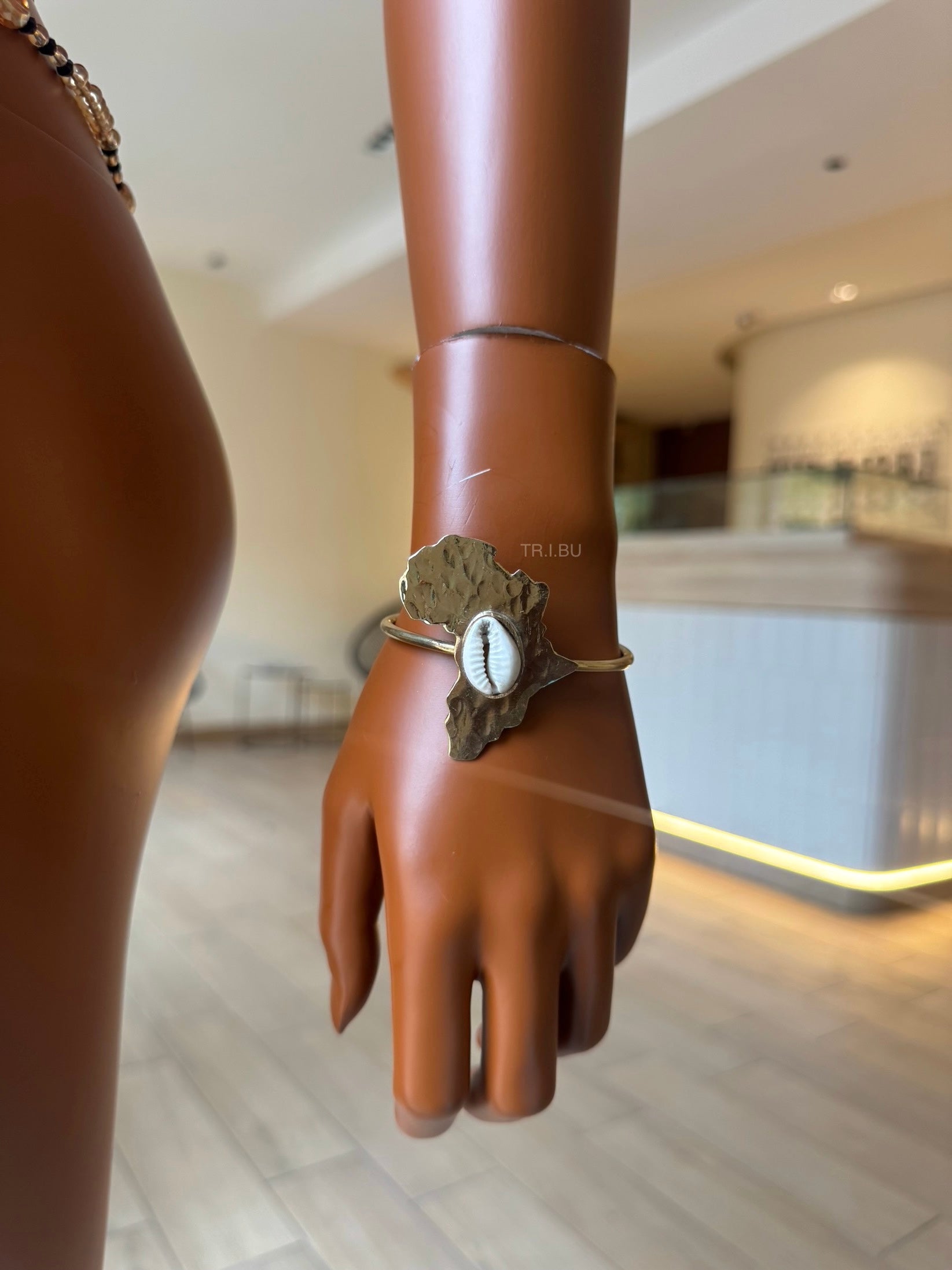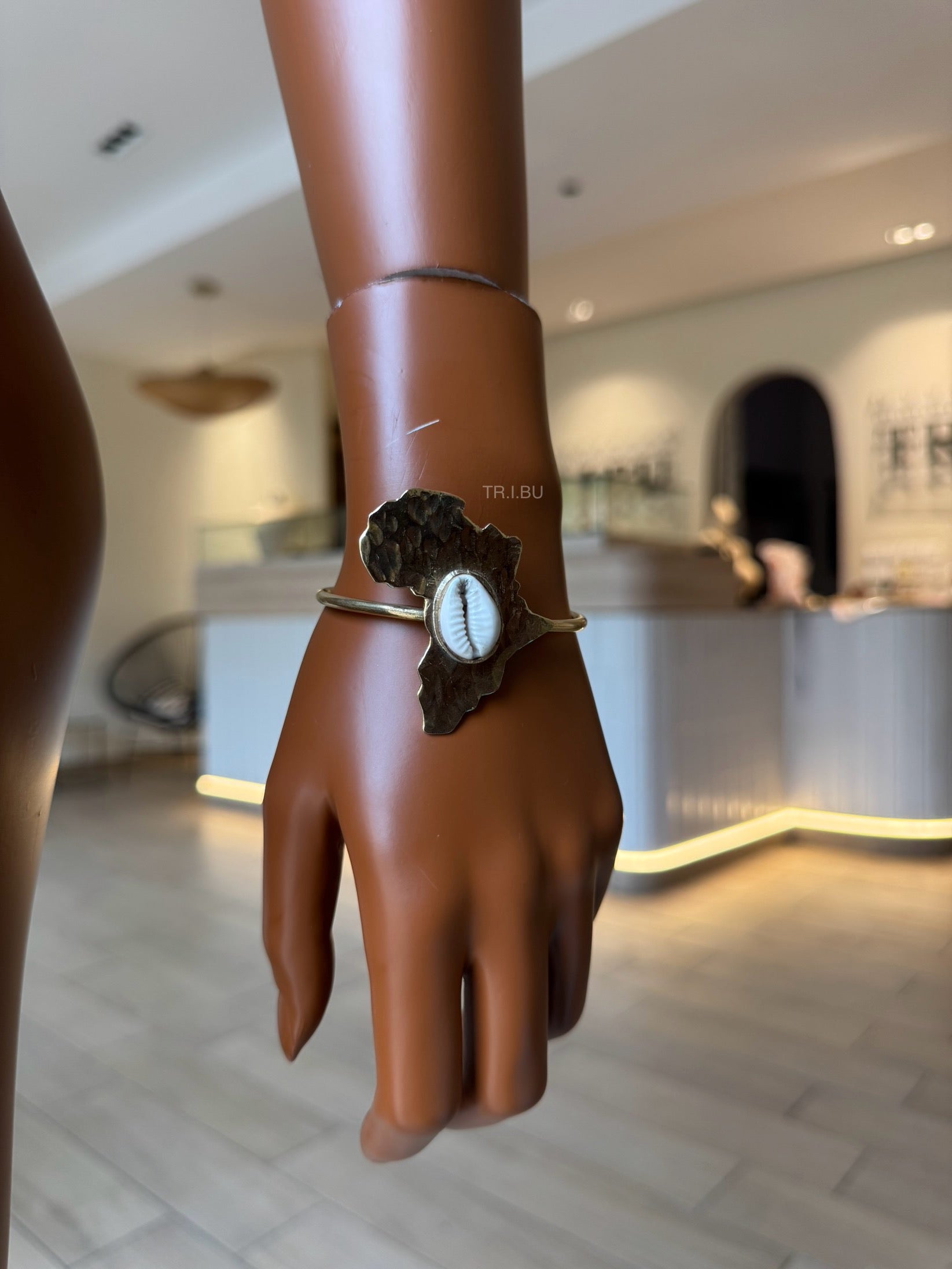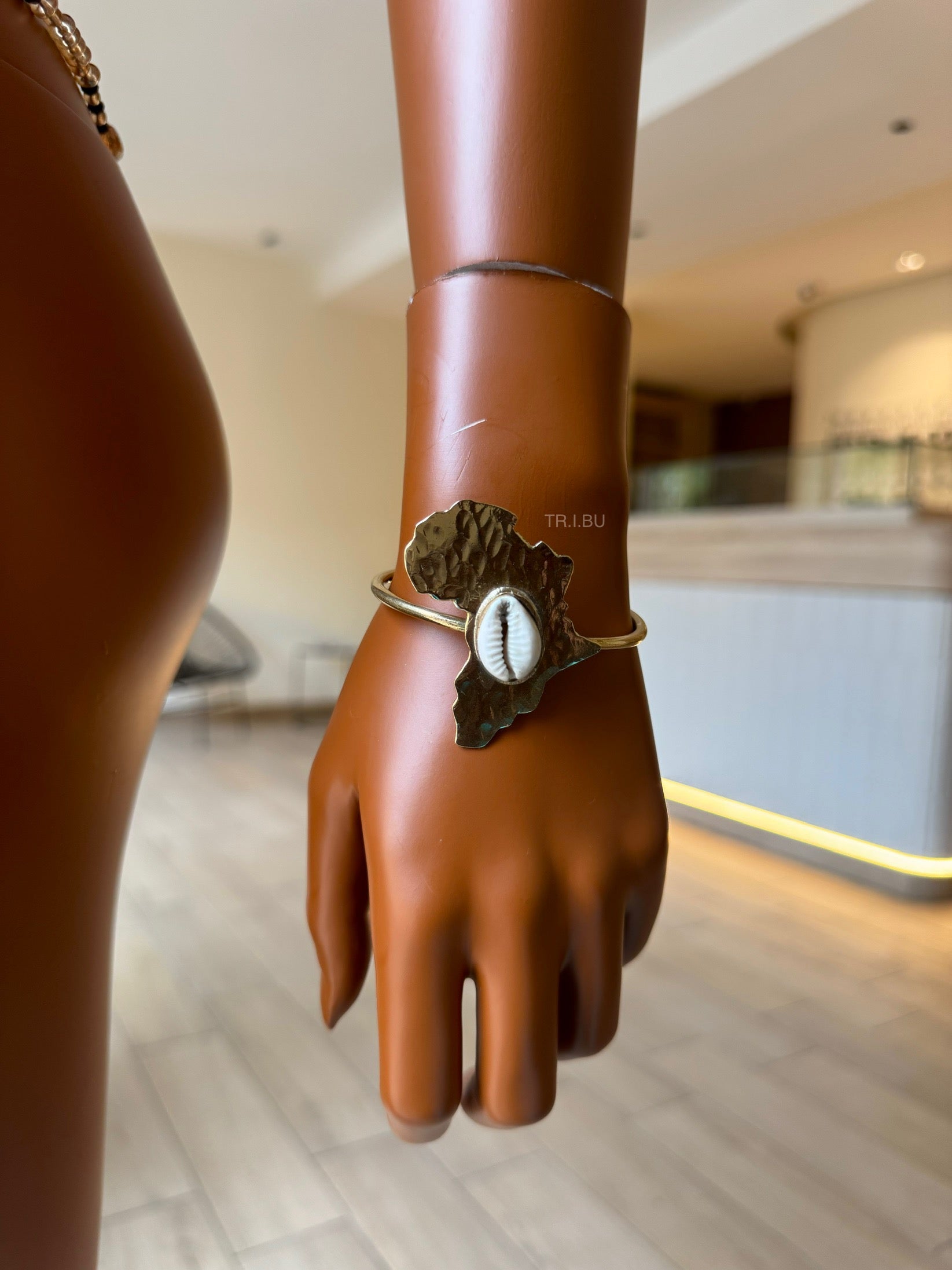 Bracelet doré ajustable orné d’un pendentif en forme d’Afrique martelé, au centre duquel repose un coquillage cauri. Un bijou fort en symboles, alliant élégance et identité culturelle.