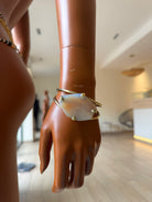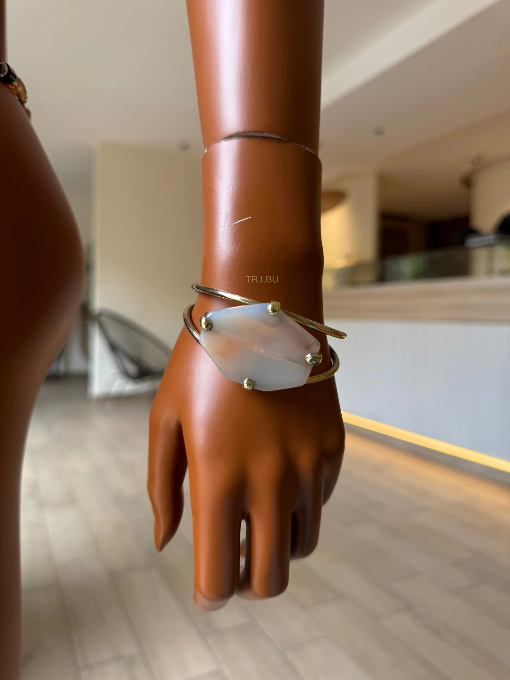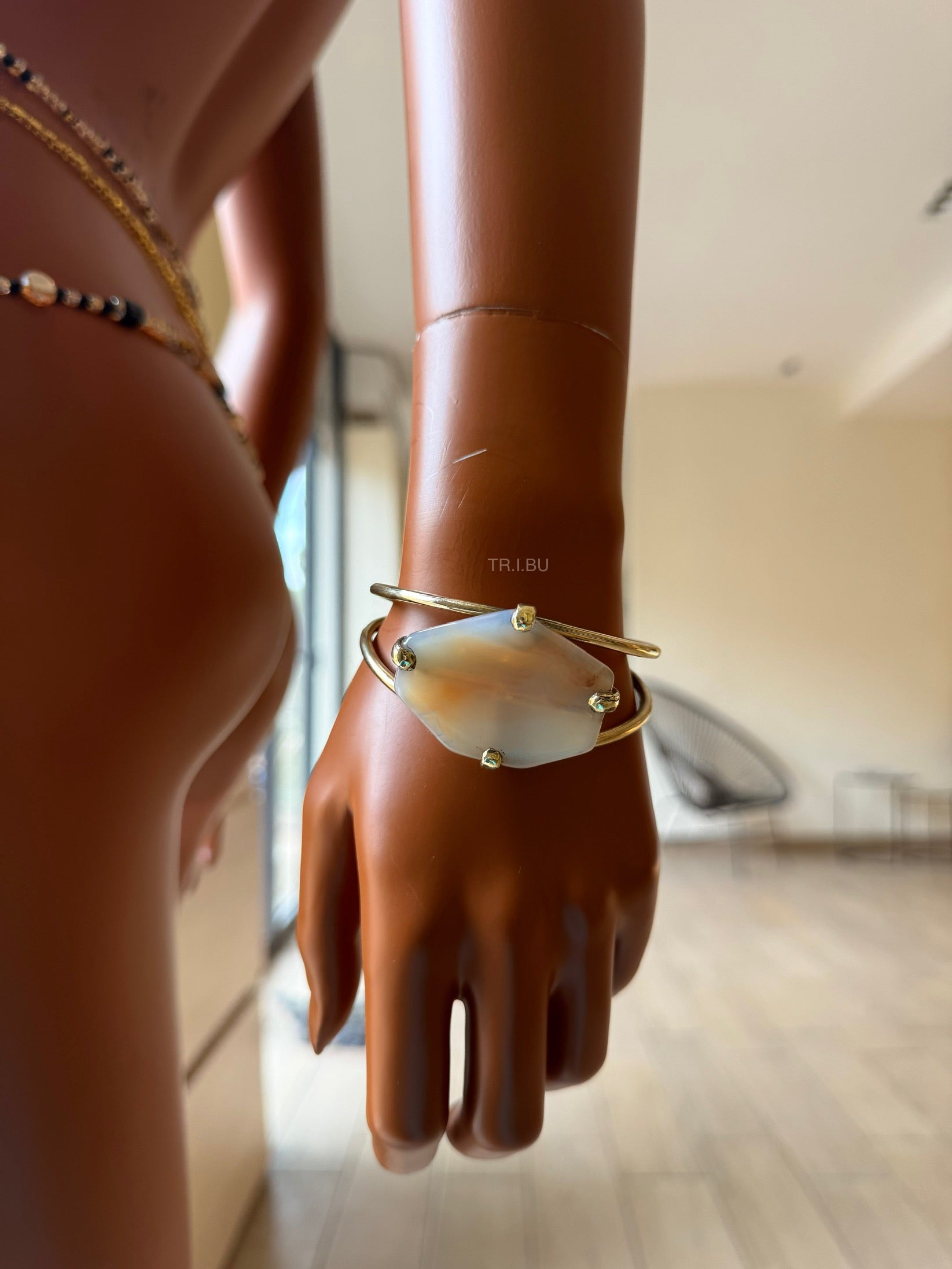 Bracelet rigide doré ajustable orné d’une large pierre polie aux nuances blanches et beige translucides. Une pièce élégante qui allie modernité et raffinement naturel.