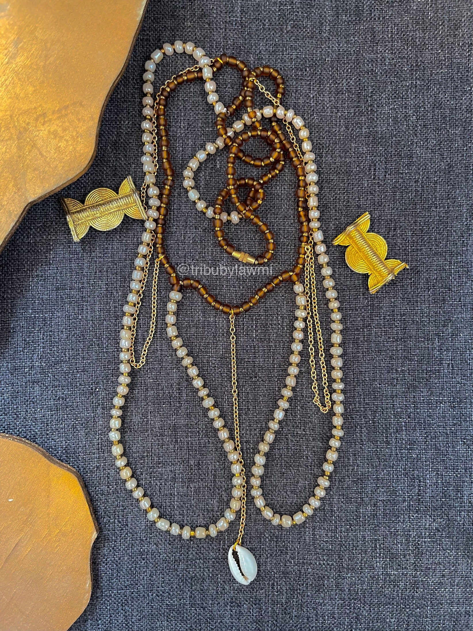 Une chaîne de cuisse audacieuse aux couleurs beiges marrons et son pendentif en coris