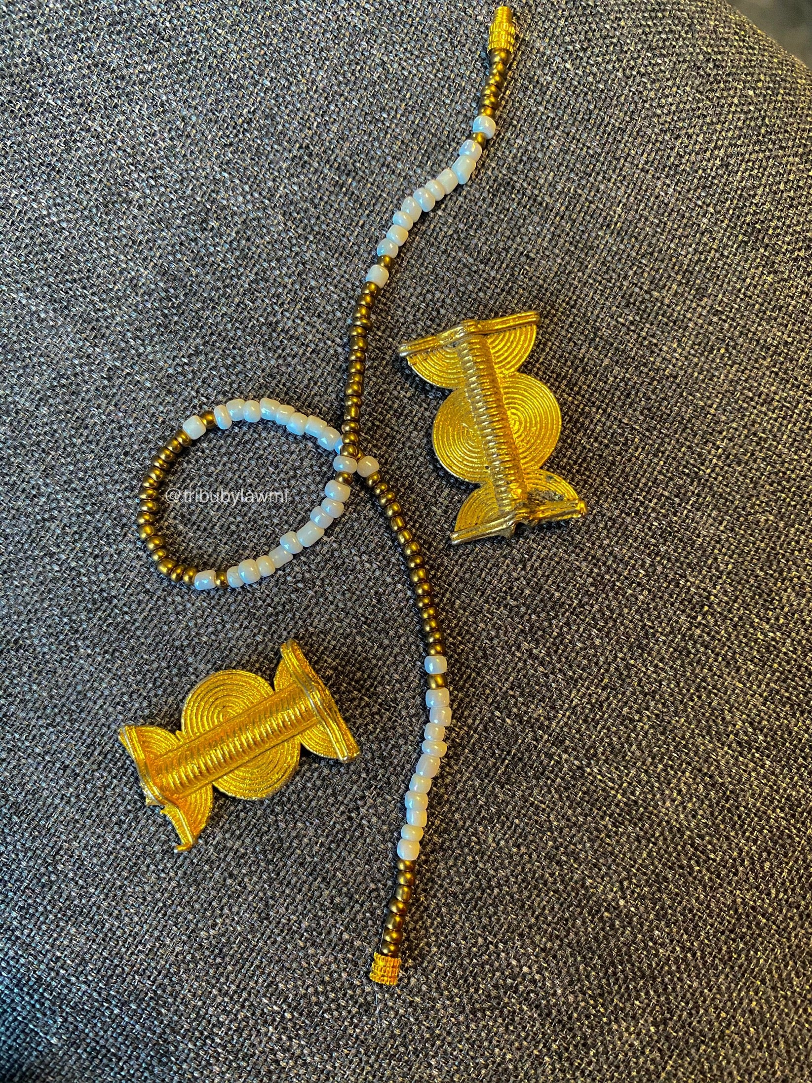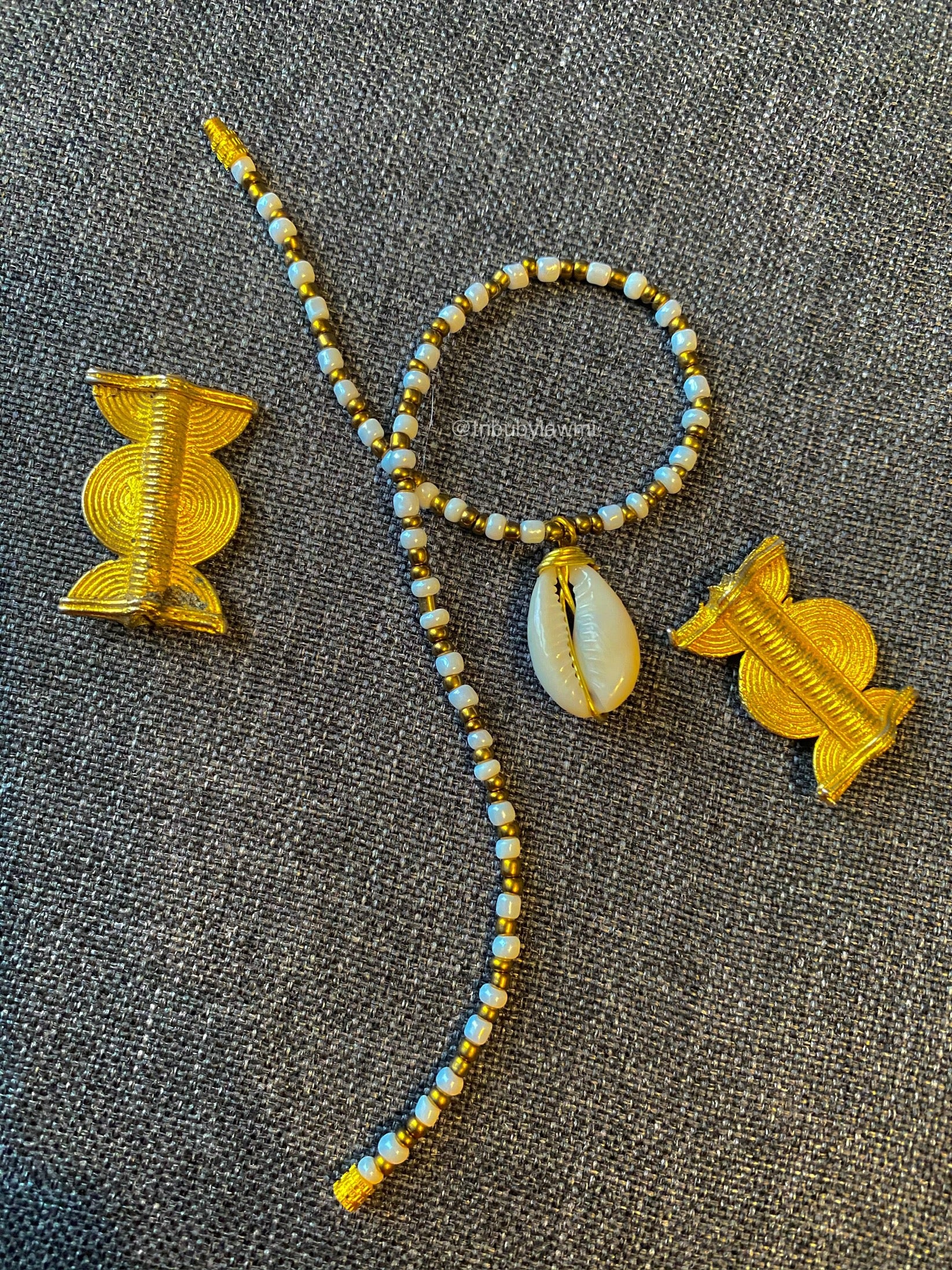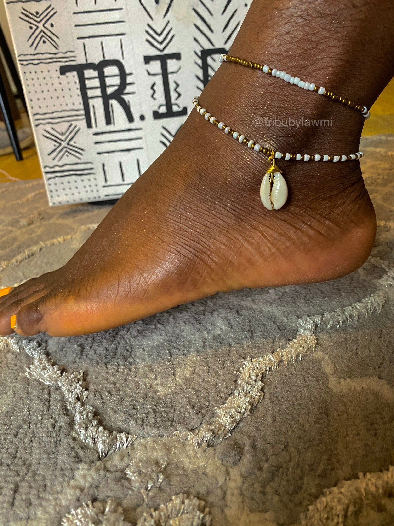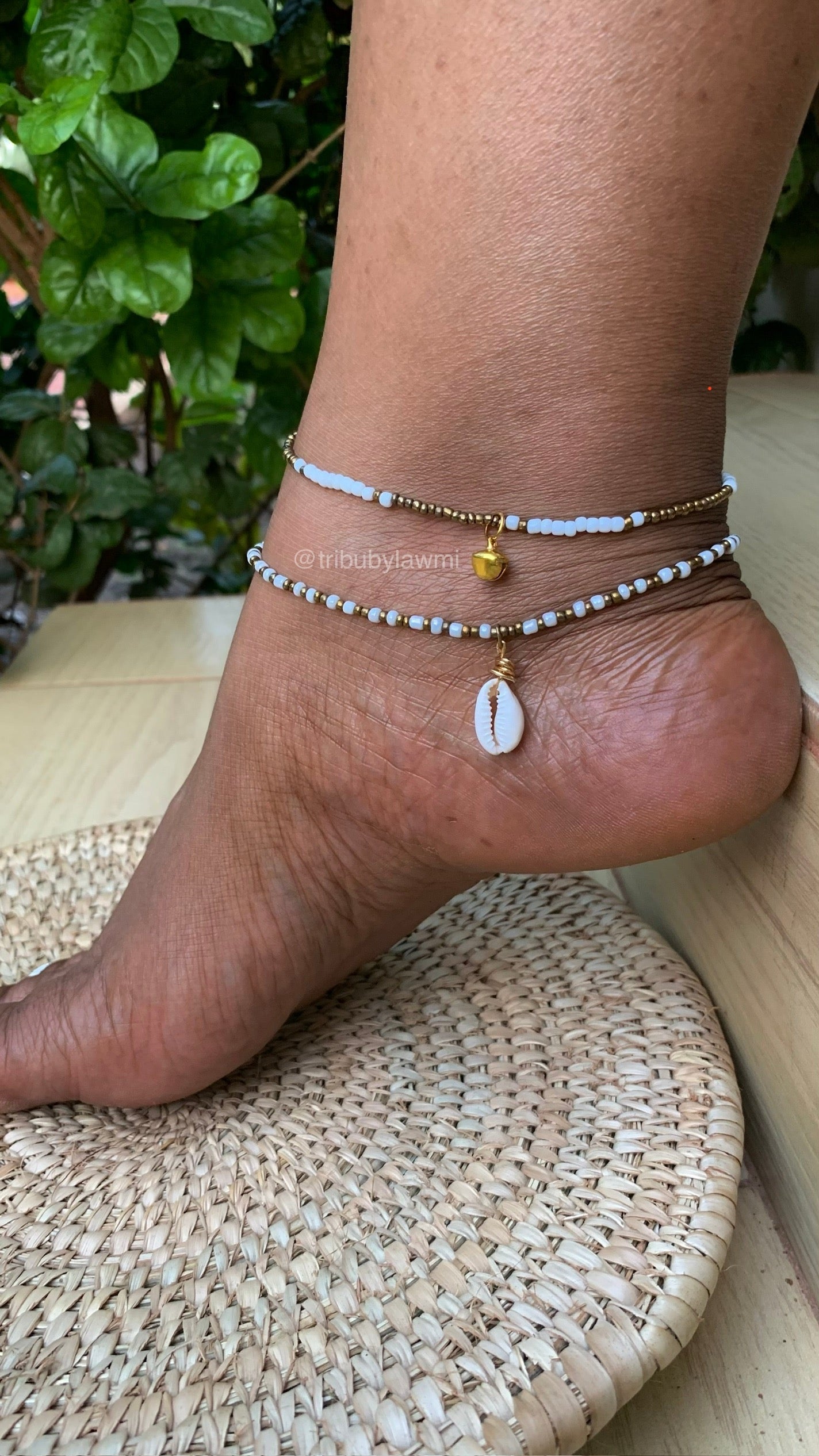 Un ensemble de chaines de pieds aux couleurs blanches et dorées avec un magnifique pendentifs en coris