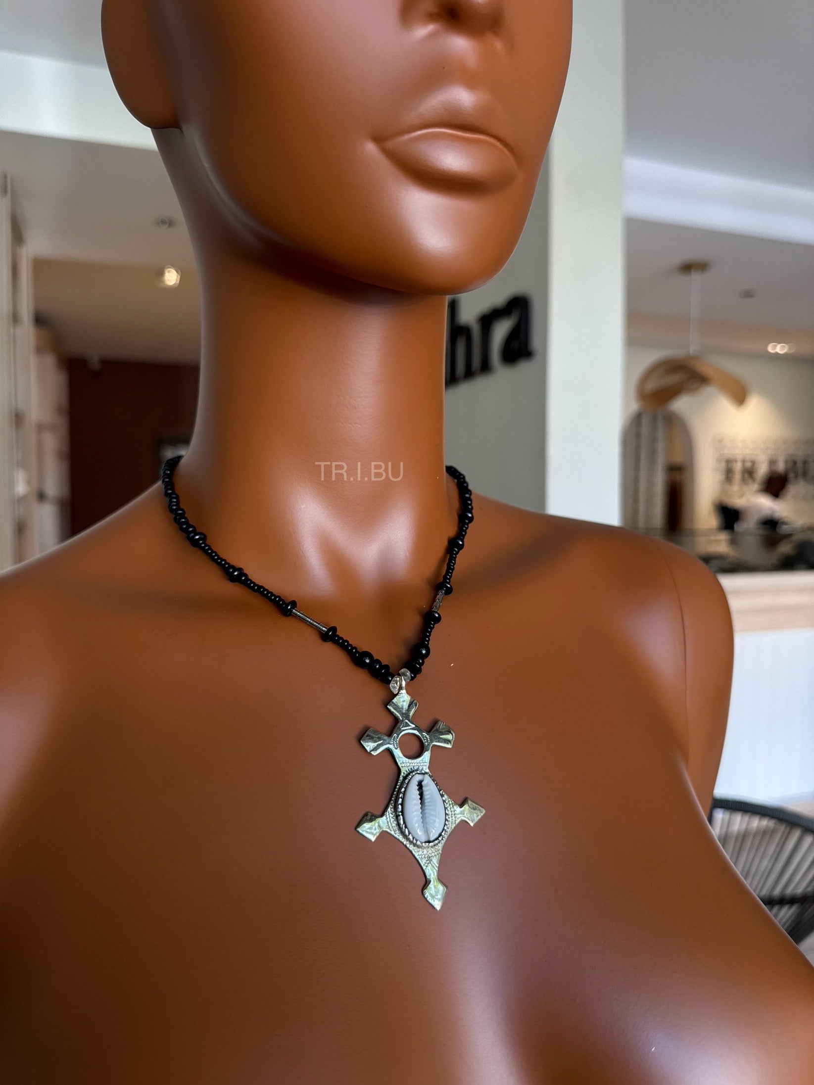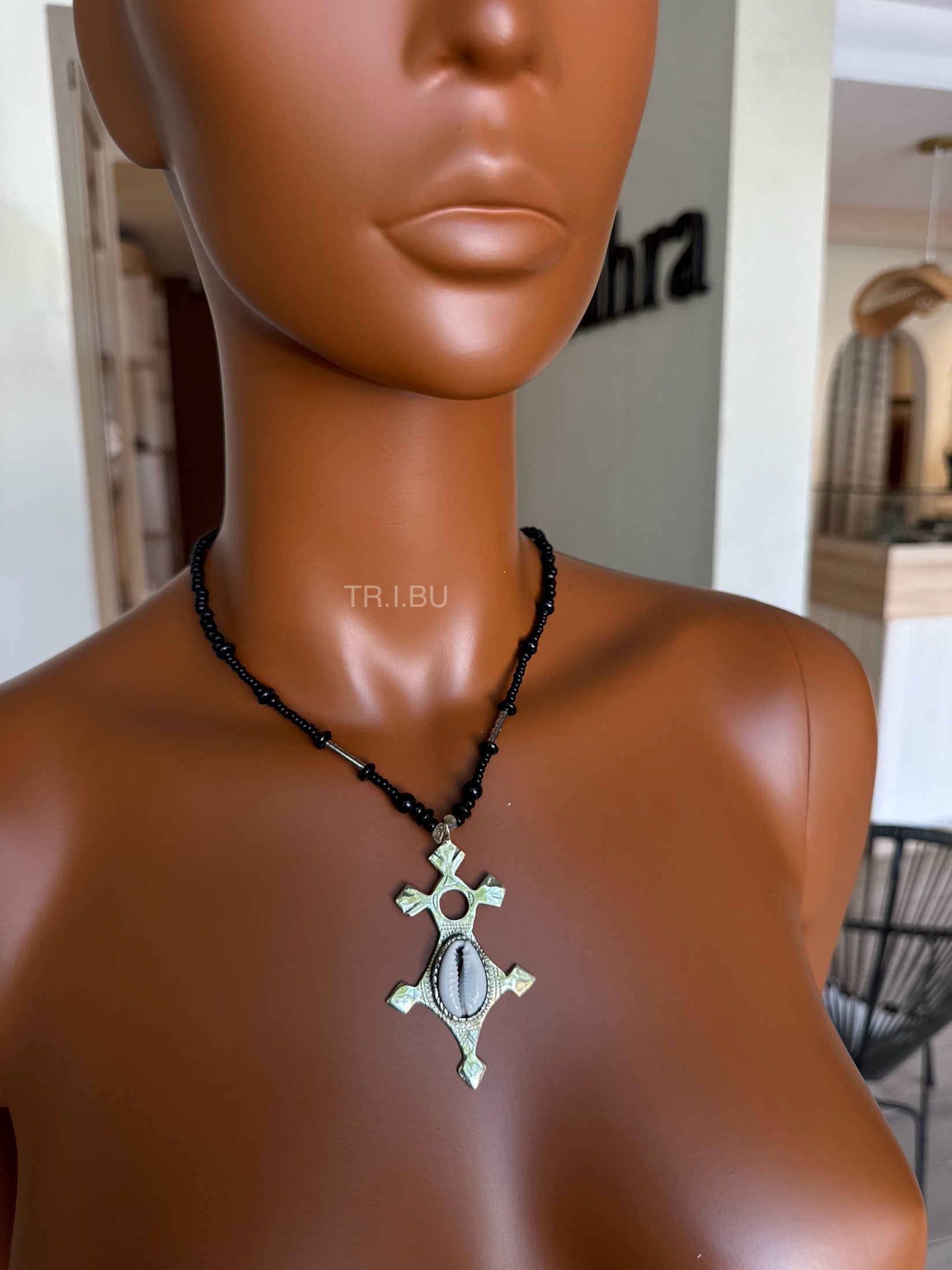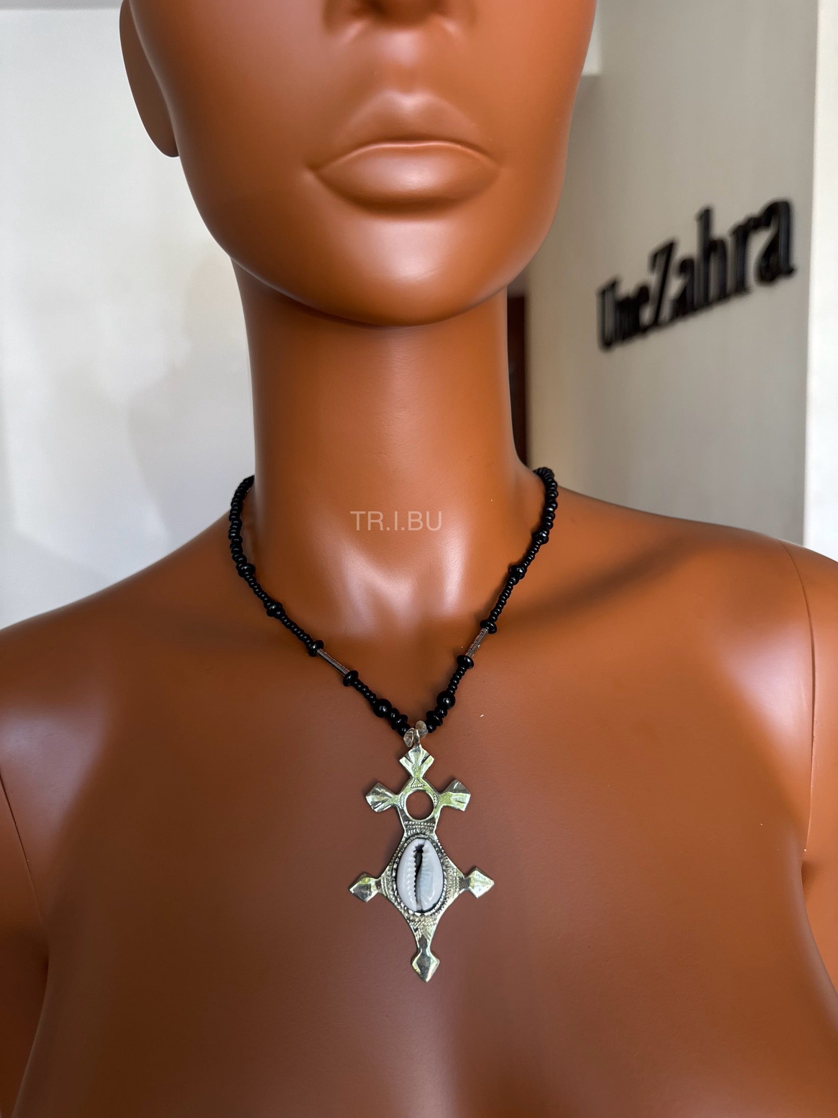 Collier en perles noires, orné d’une croix d’Agadez en métal argenté sertie d’un cauri, symbole de protection et d’héritage culturel.