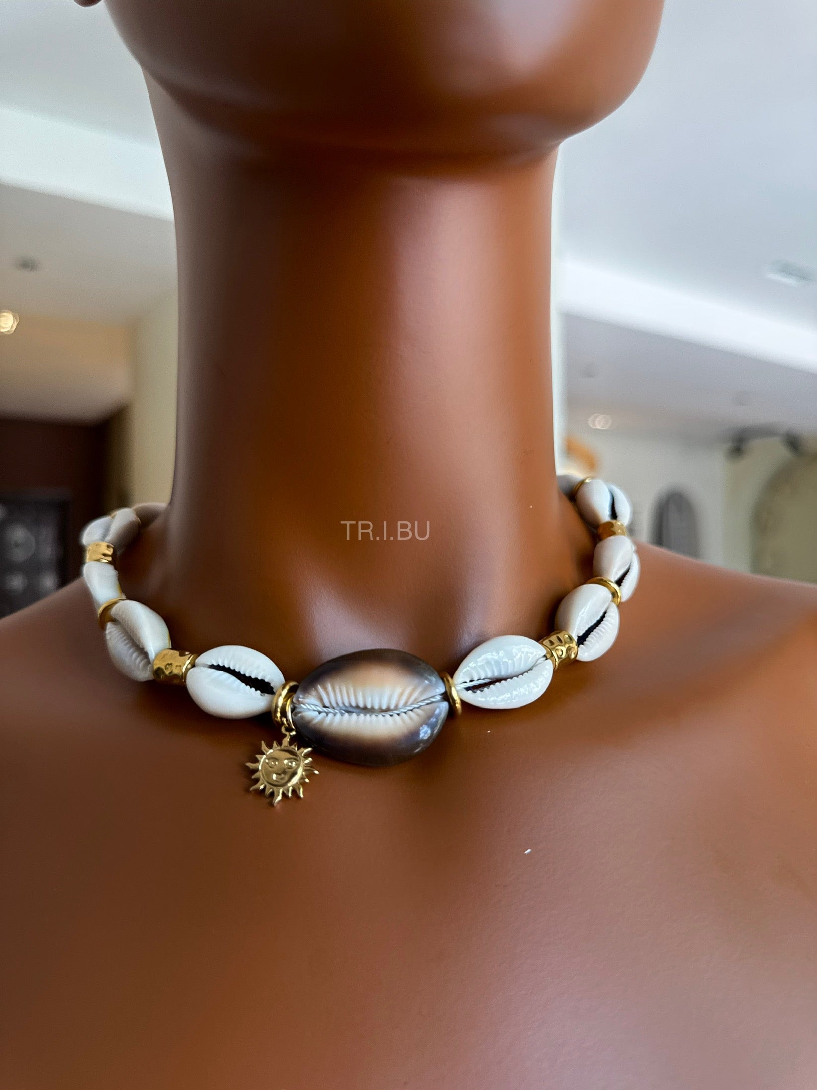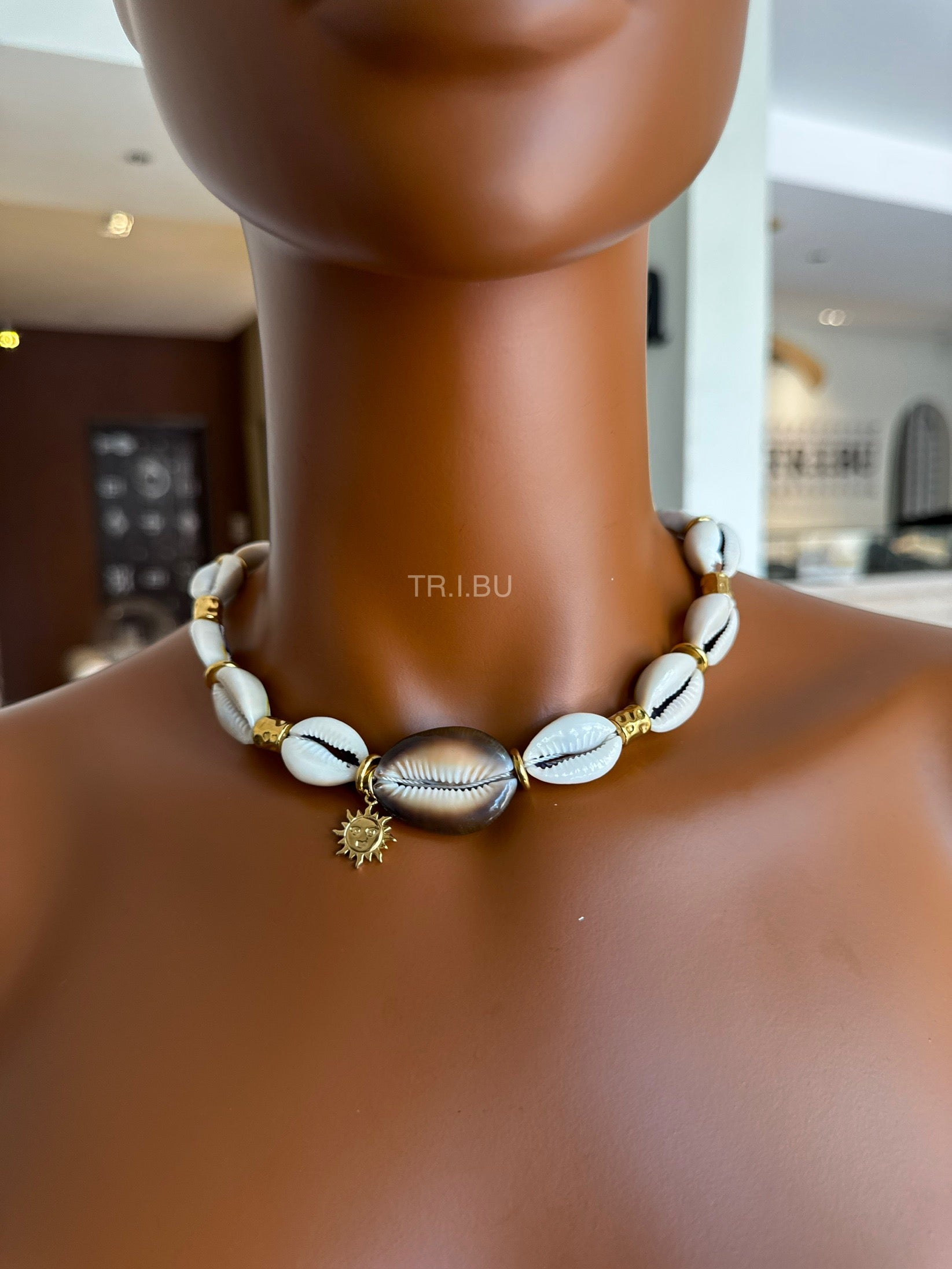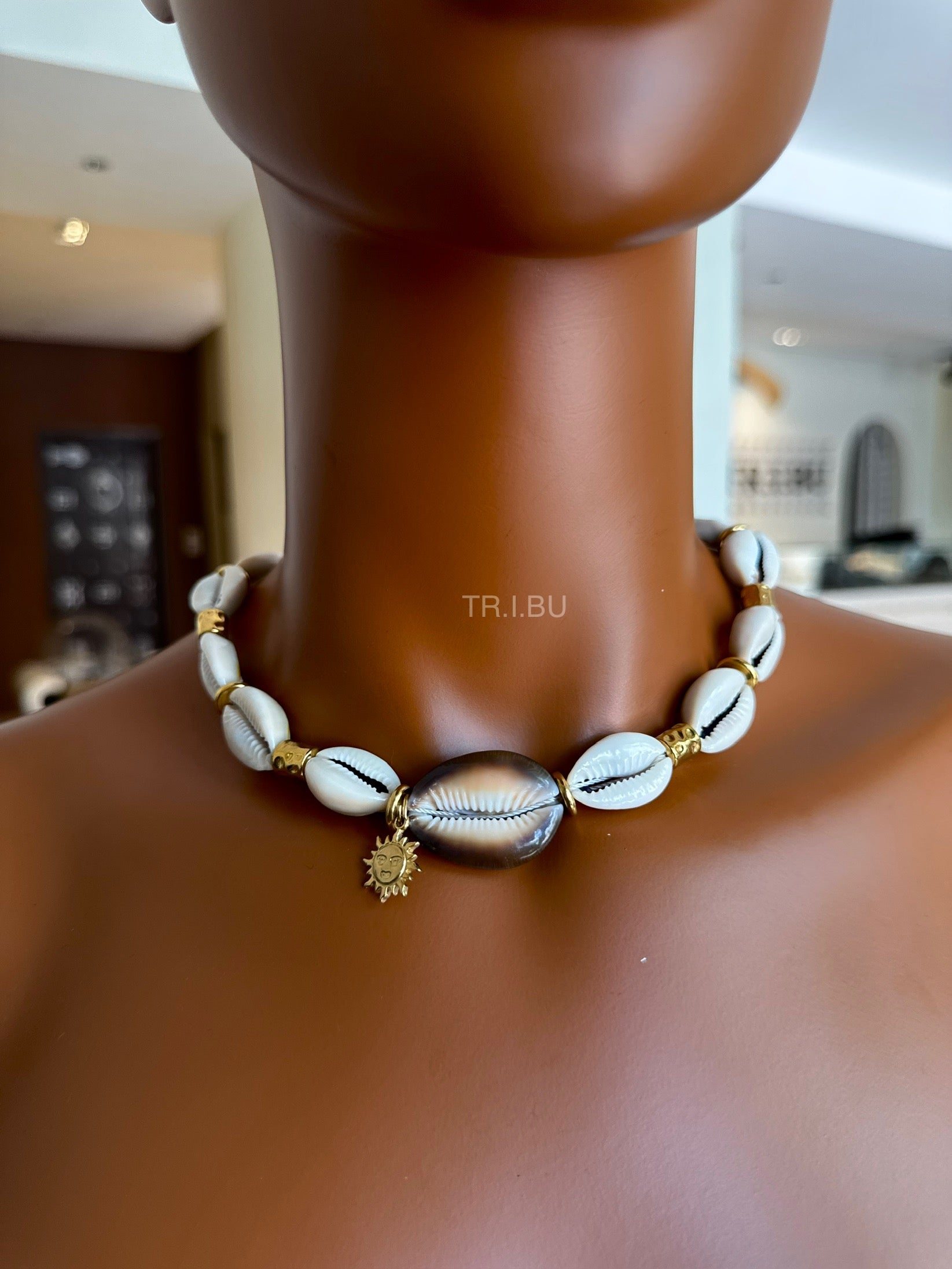 Collier ras-de-cou en cauris naturels, sublimé d’accents dorés et d’un pendentif soleil, pour une touche lumineuse alliant authenticité et élégance.