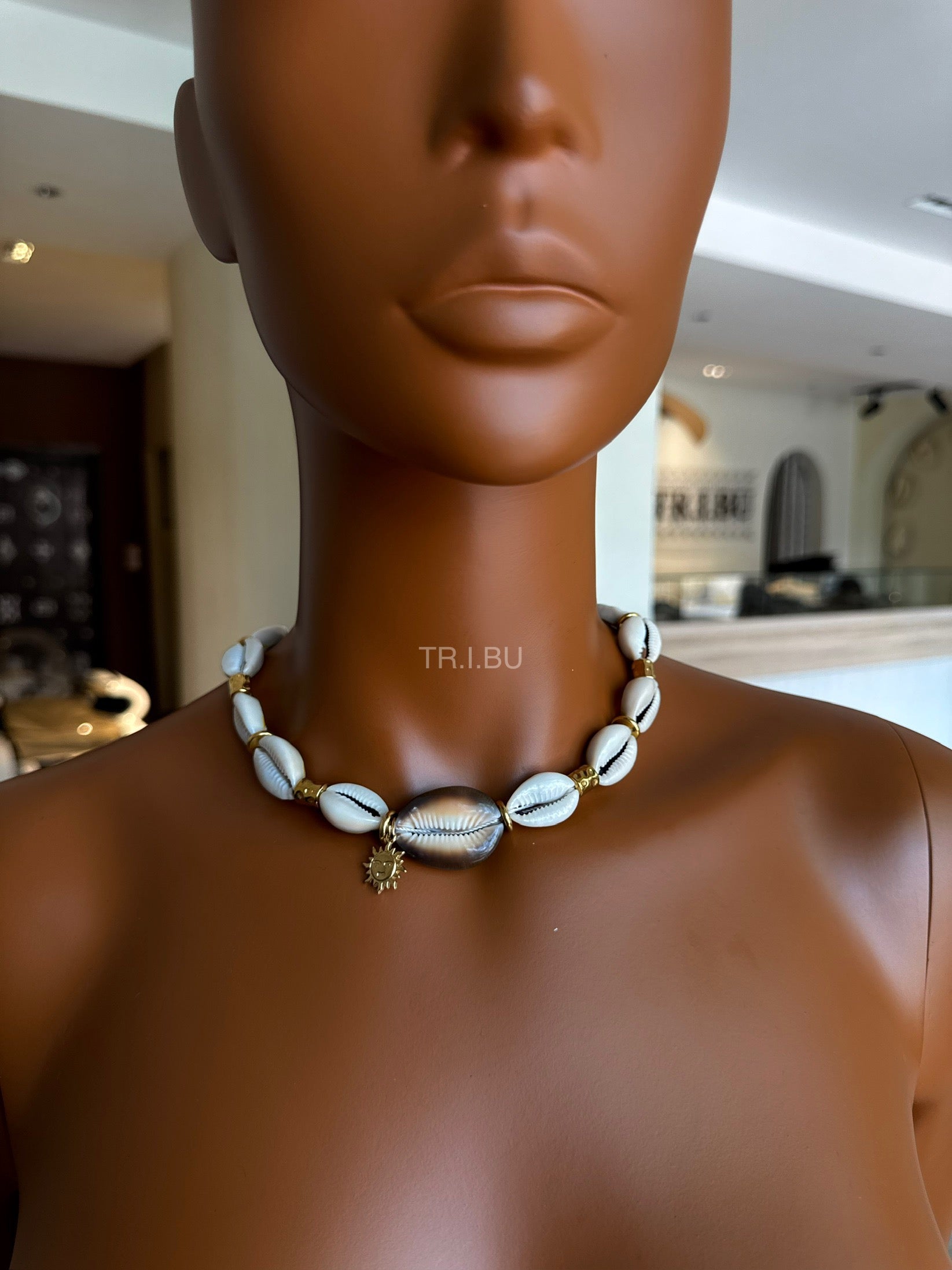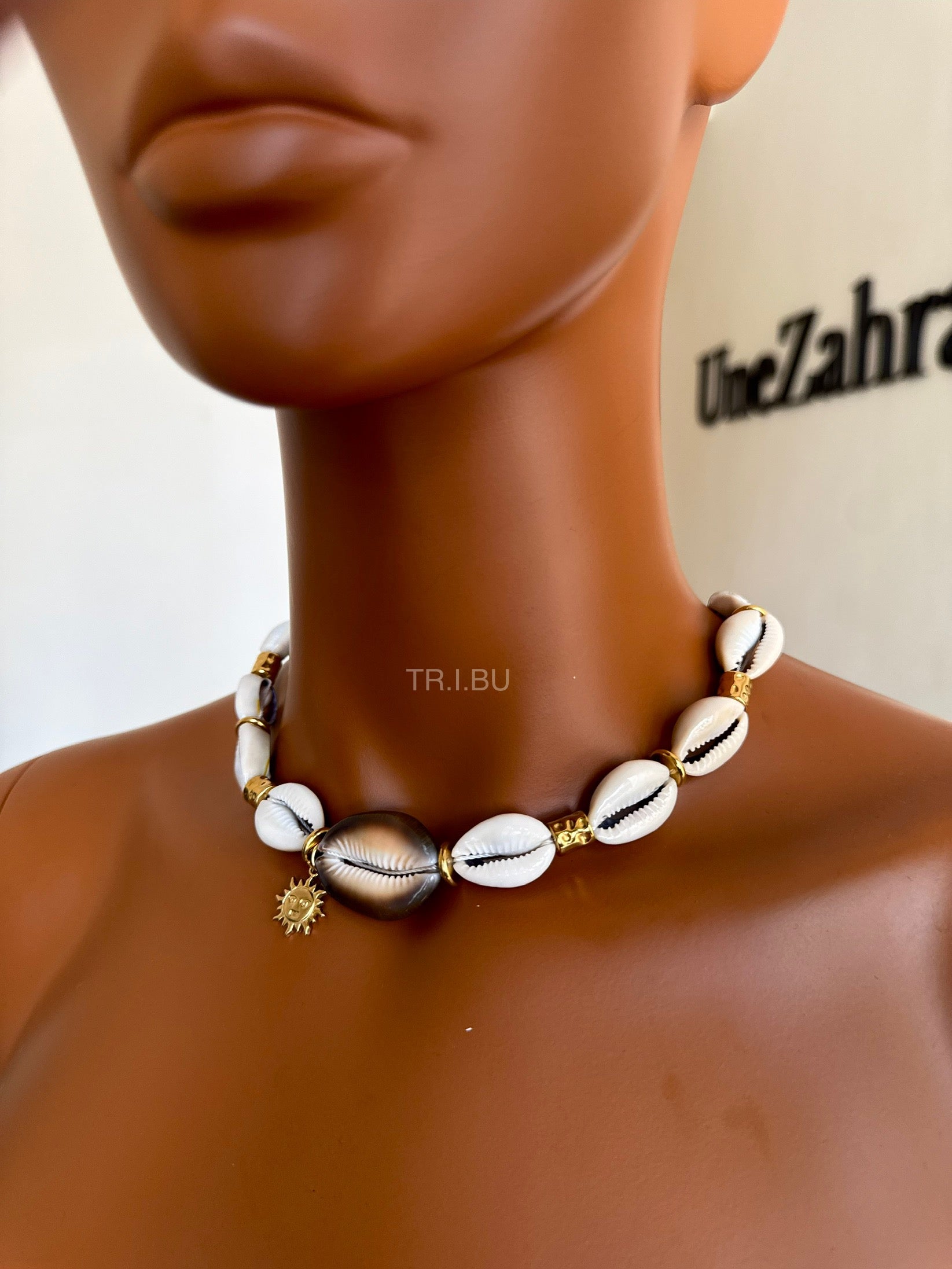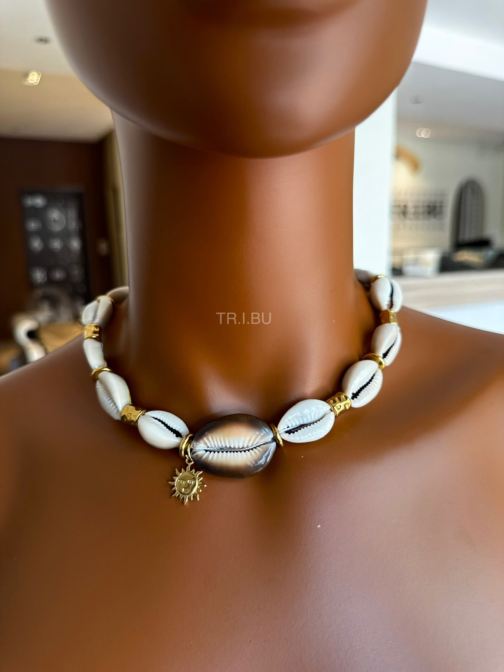 Collier ras-de-cou en cauris naturels, sublimé d’accents dorés et d’un pendentif soleil, pour une touche lumineuse alliant authenticité et élégance.