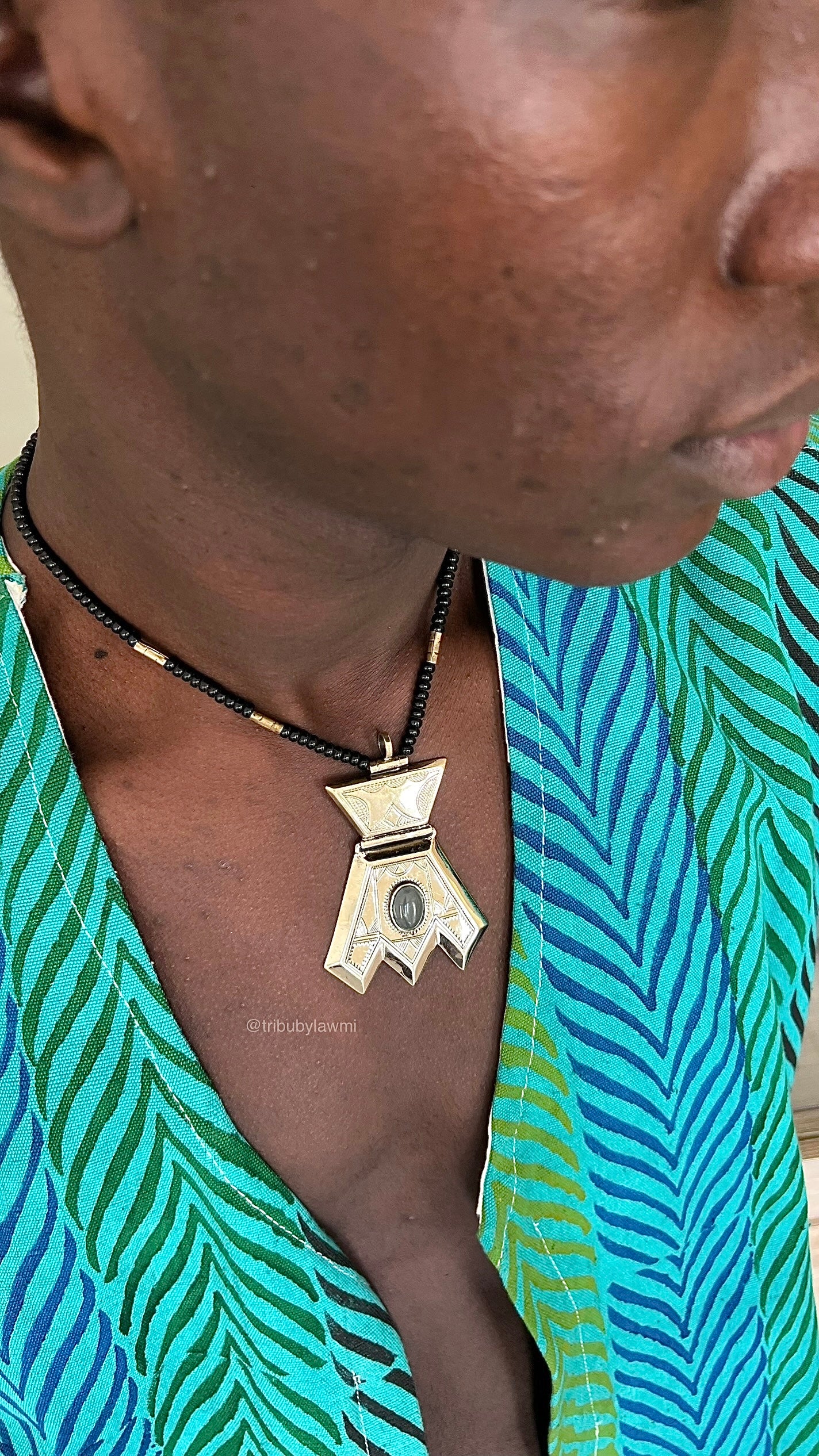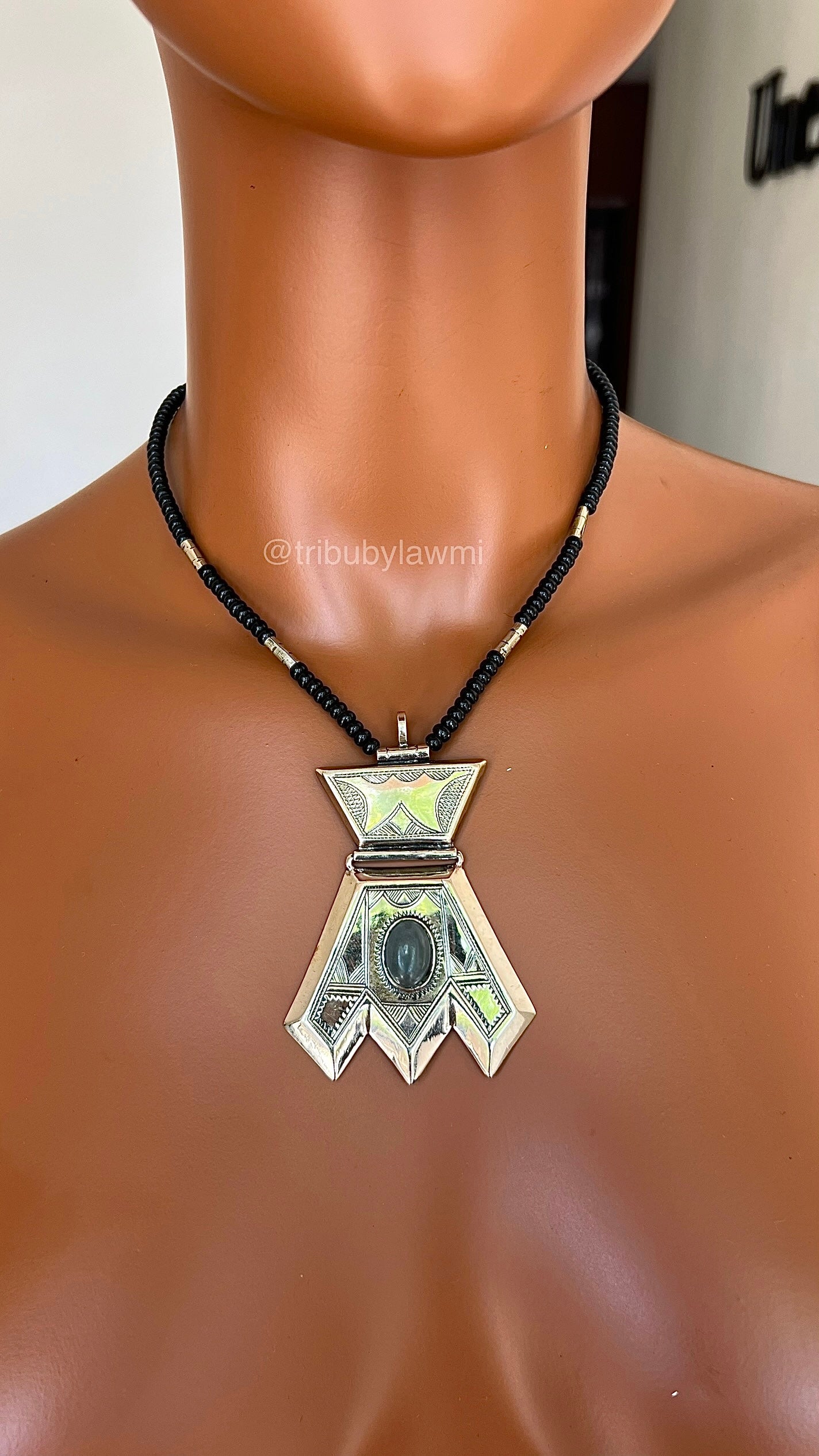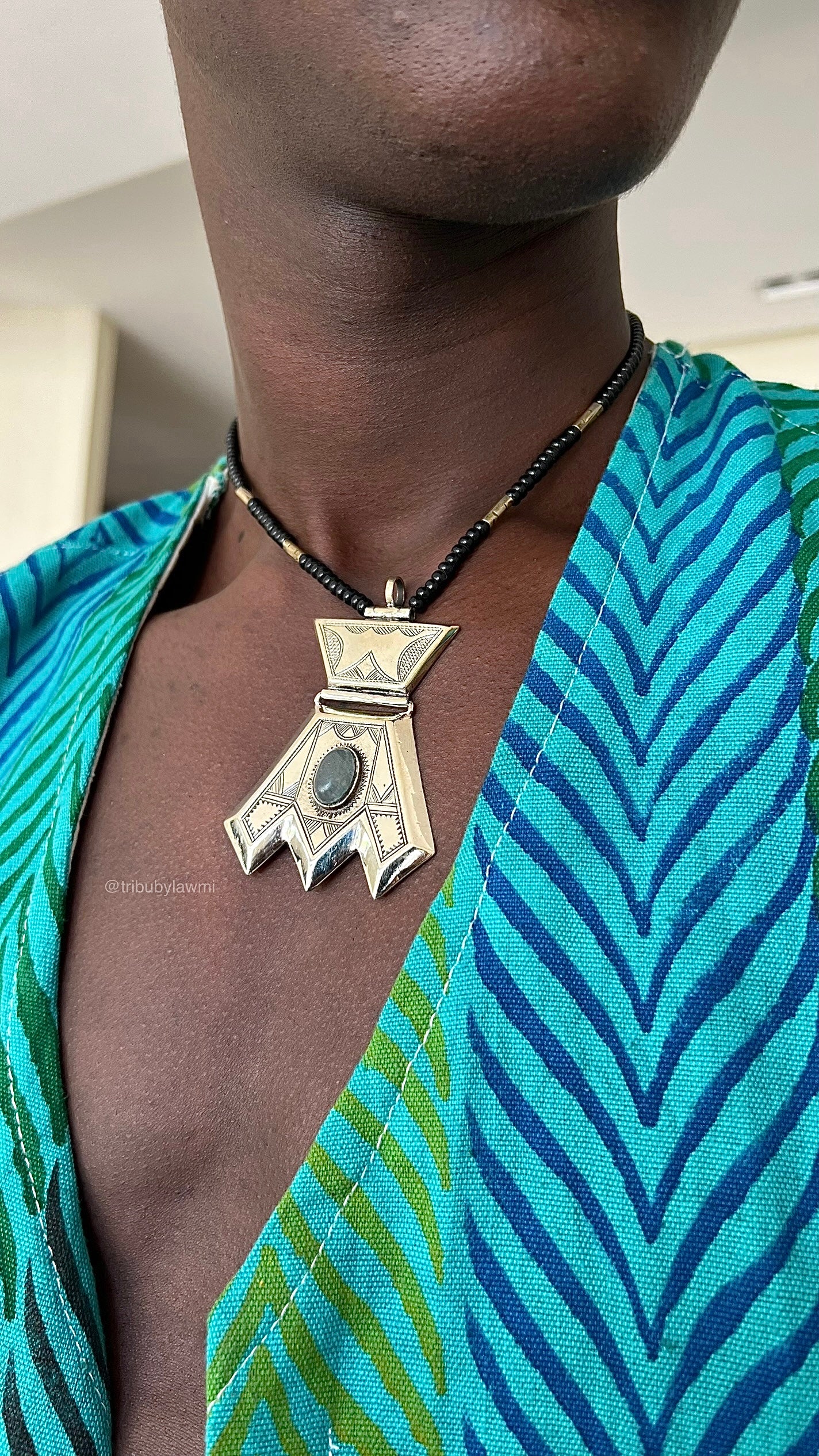 Collier au cordon noir ponctué d’éclats argentés, centré par un pendentif aux lignes franches et gravures fines. En son cœur, une pierre sombre capte la lumière — comme un secret ancien gravé dans le métal.