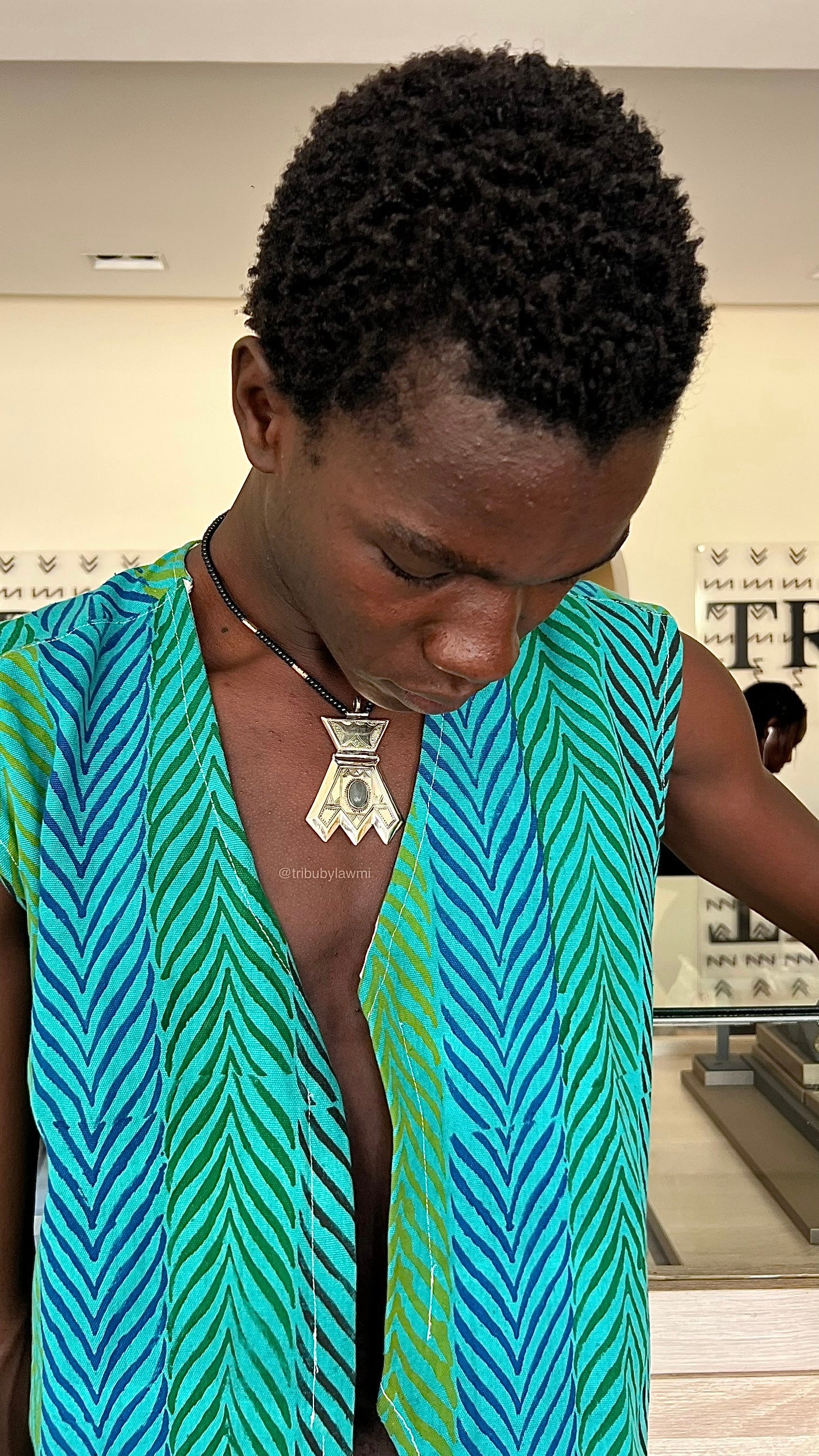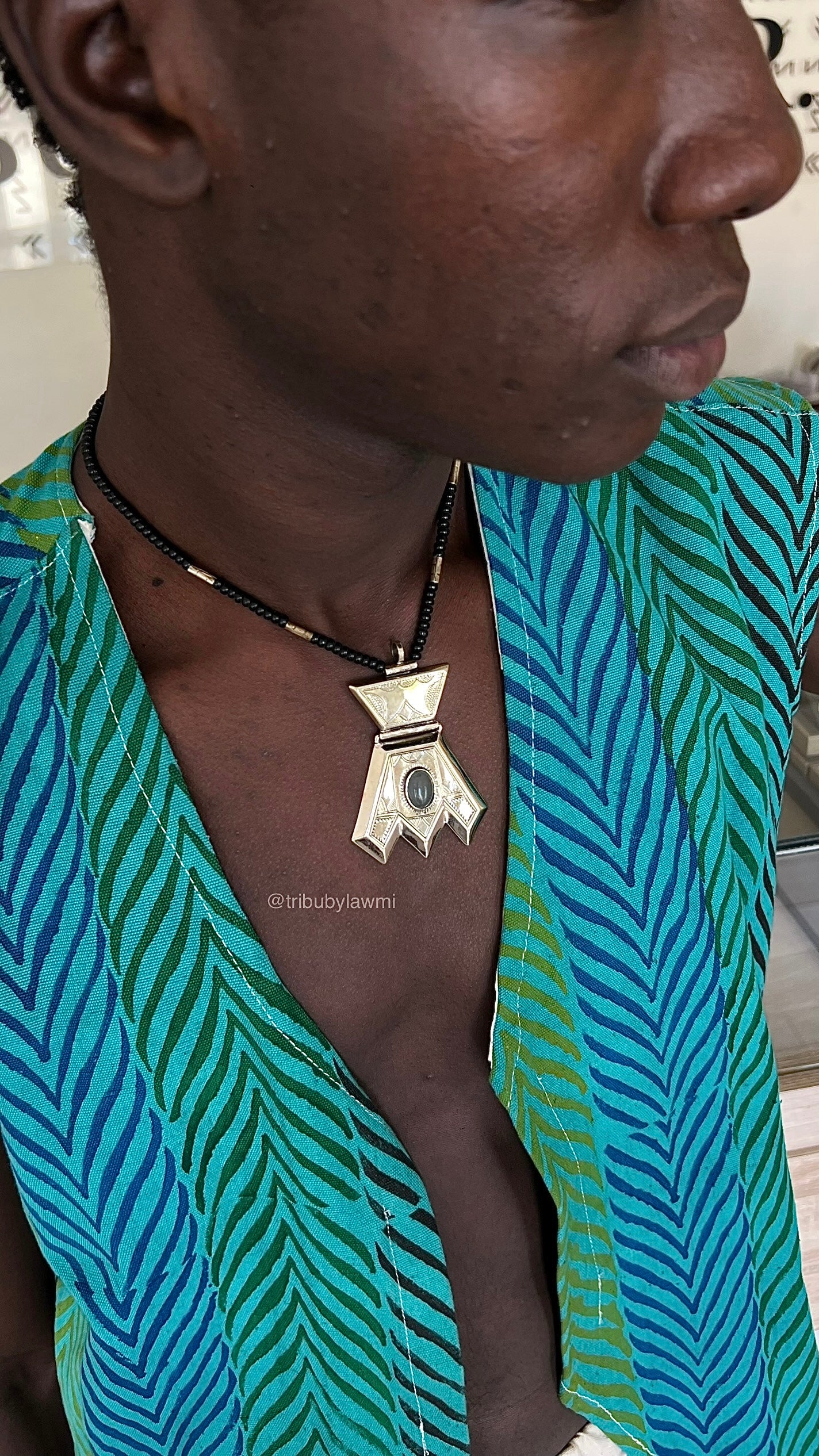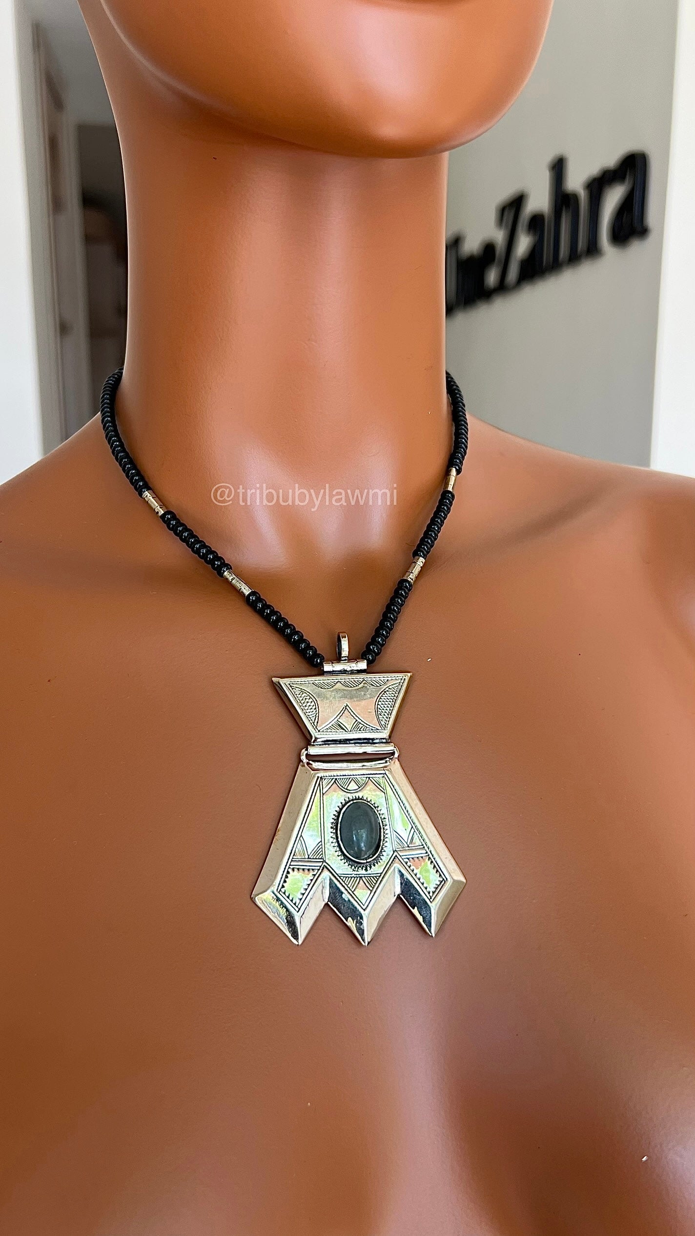 Collier au cordon noir ponctué d’éclats argentés, centré par un pendentif aux lignes franches et gravures fines. En son cœur, une pierre sombre capte la lumière — comme un secret ancien gravé dans le métal.