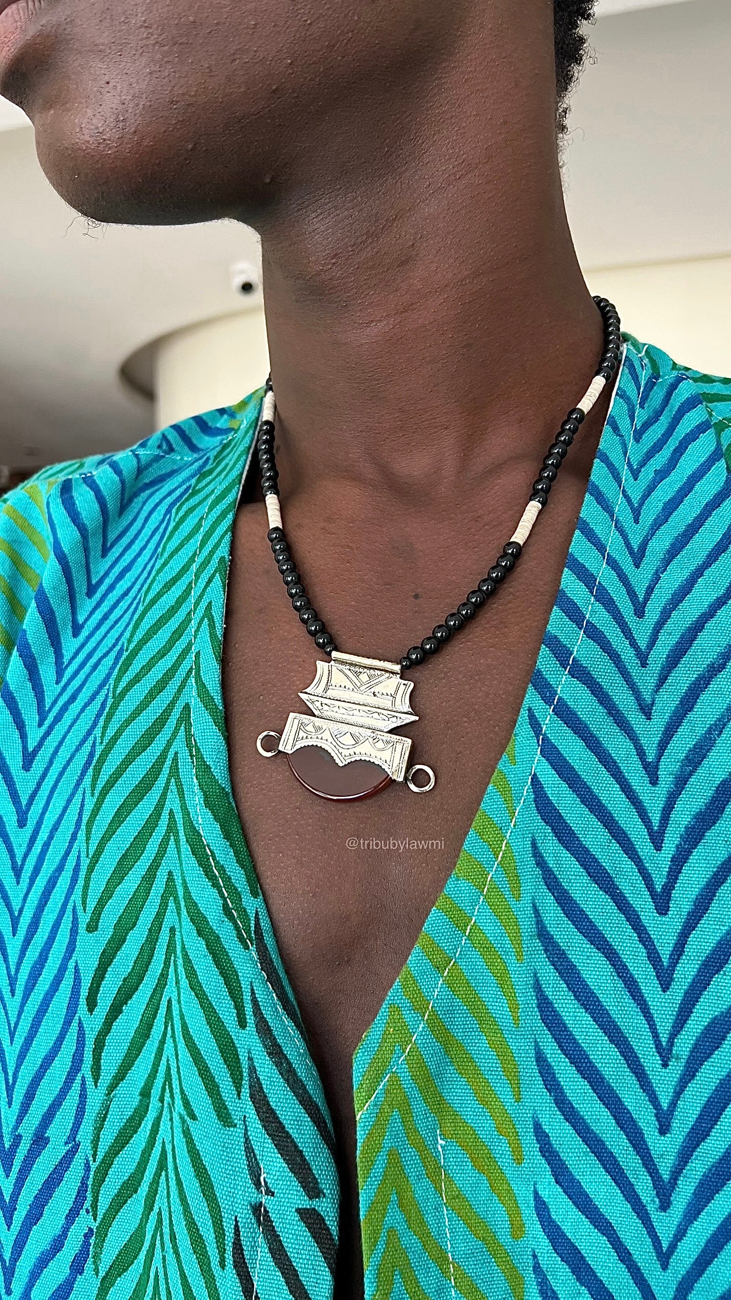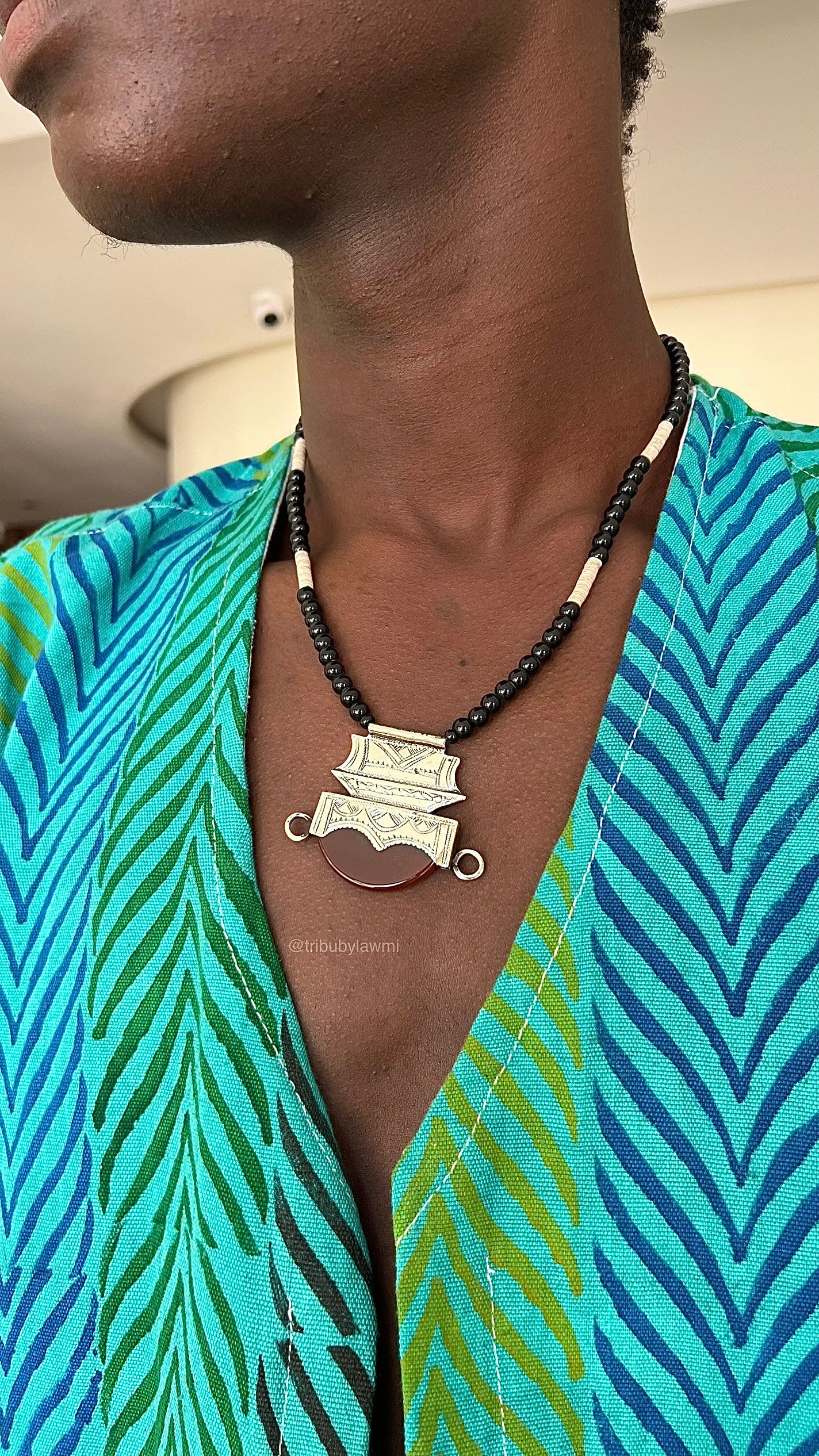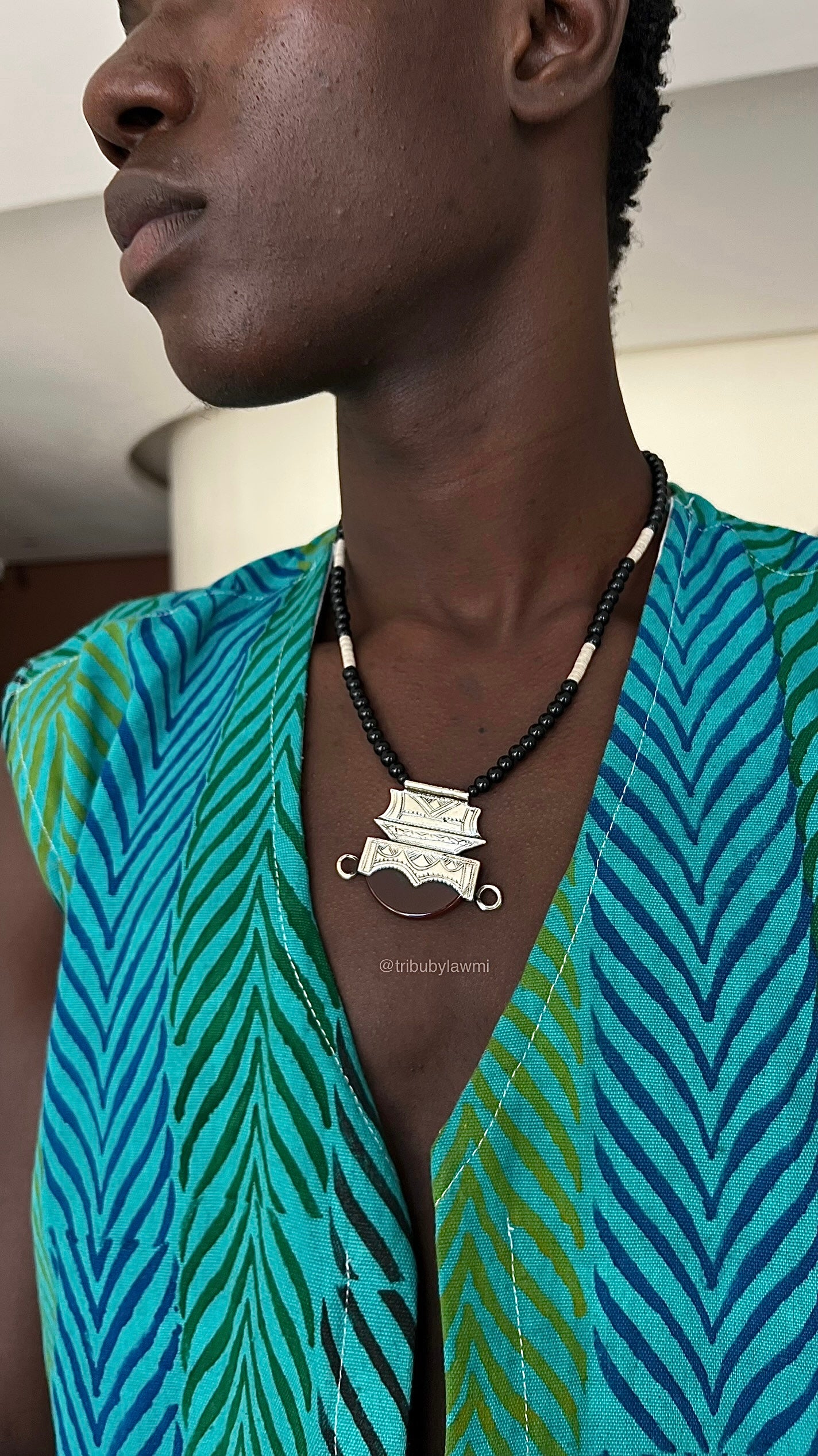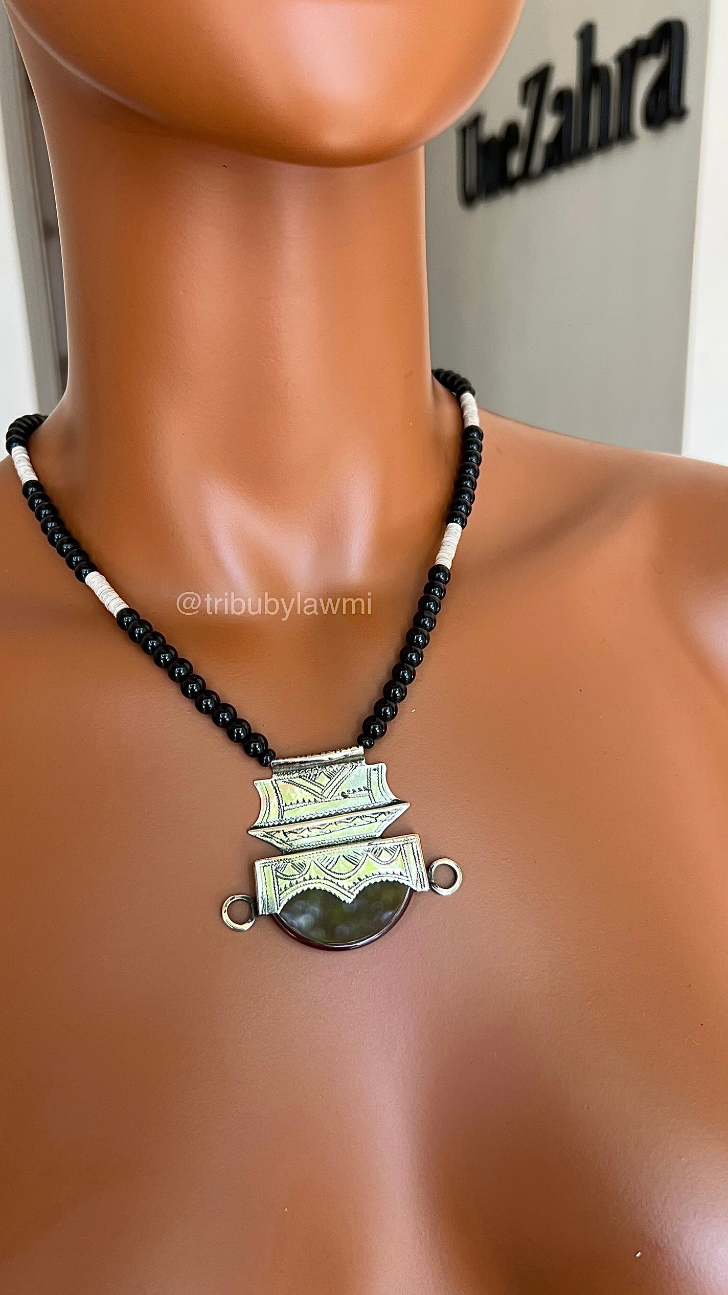 Ce collier mêle la nuit et la lumière, tissé de perles noires et blanches comme des battements d’ombre et de silence. En son centre, un pendentif sculpté veille, couronné d’une pierre en demi-lune aux reflets mystérieux — comme un fragment de désert capturé dans le métal.