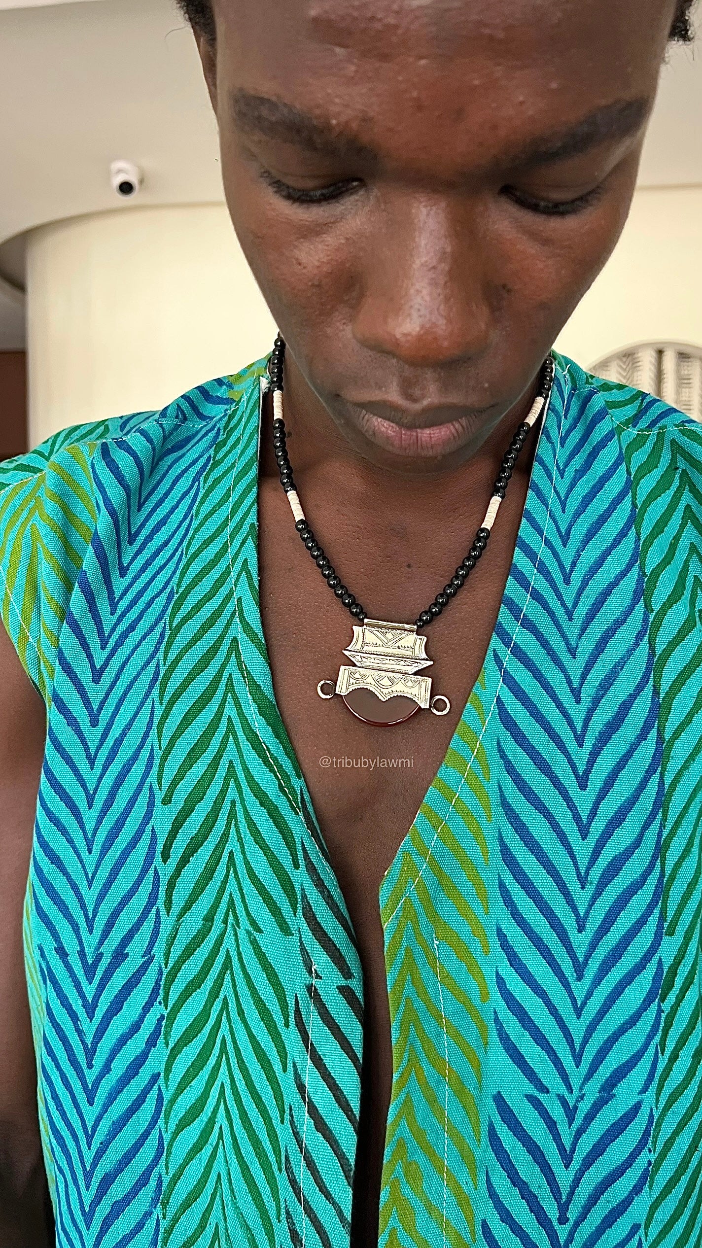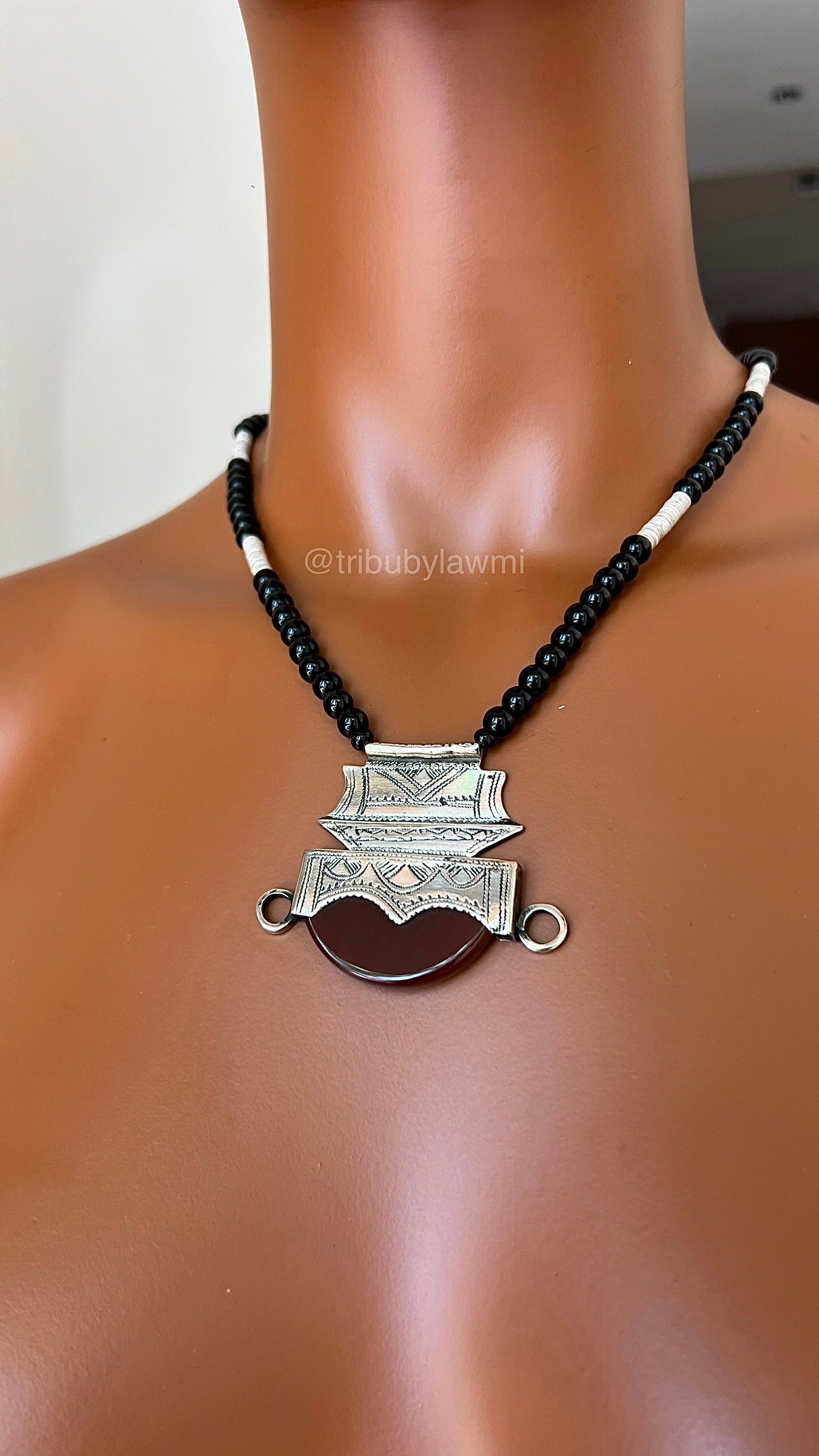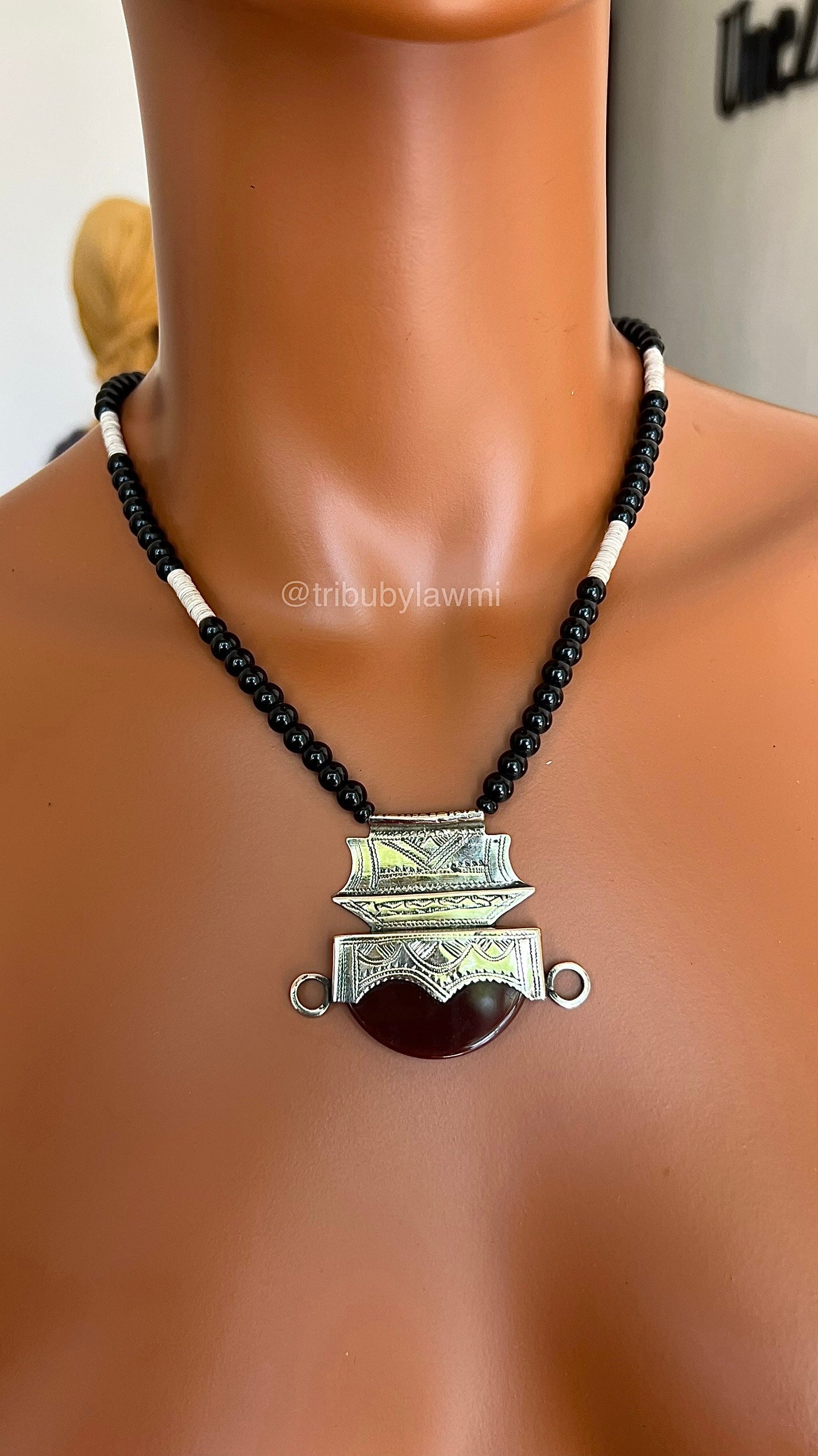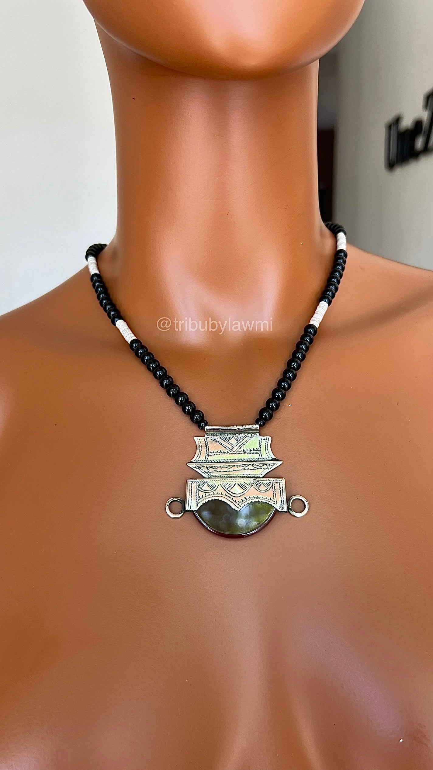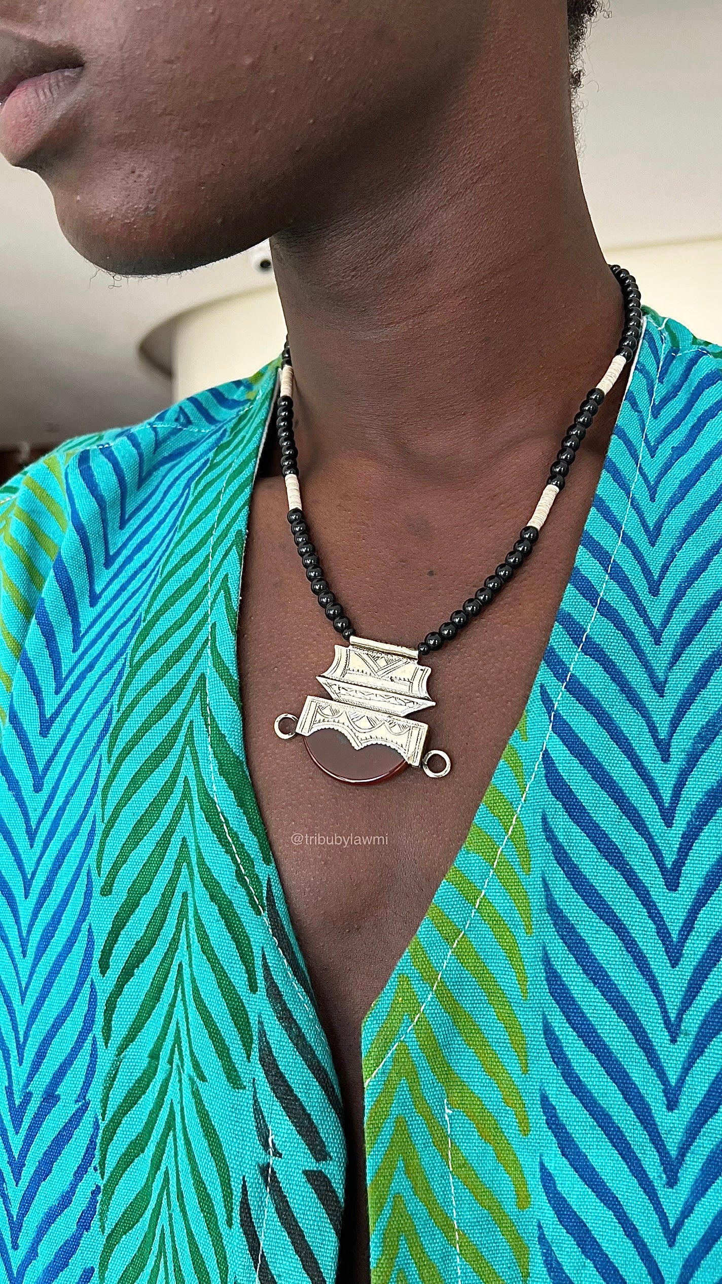 Ce collier mêle la nuit et la lumière, tissé de perles noires et blanches comme des battements d’ombre et de silence. En son centre, un pendentif sculpté veille, couronné d’une pierre en demi-lune aux reflets mystérieux — comme un fragment de désert capturé dans le métal.