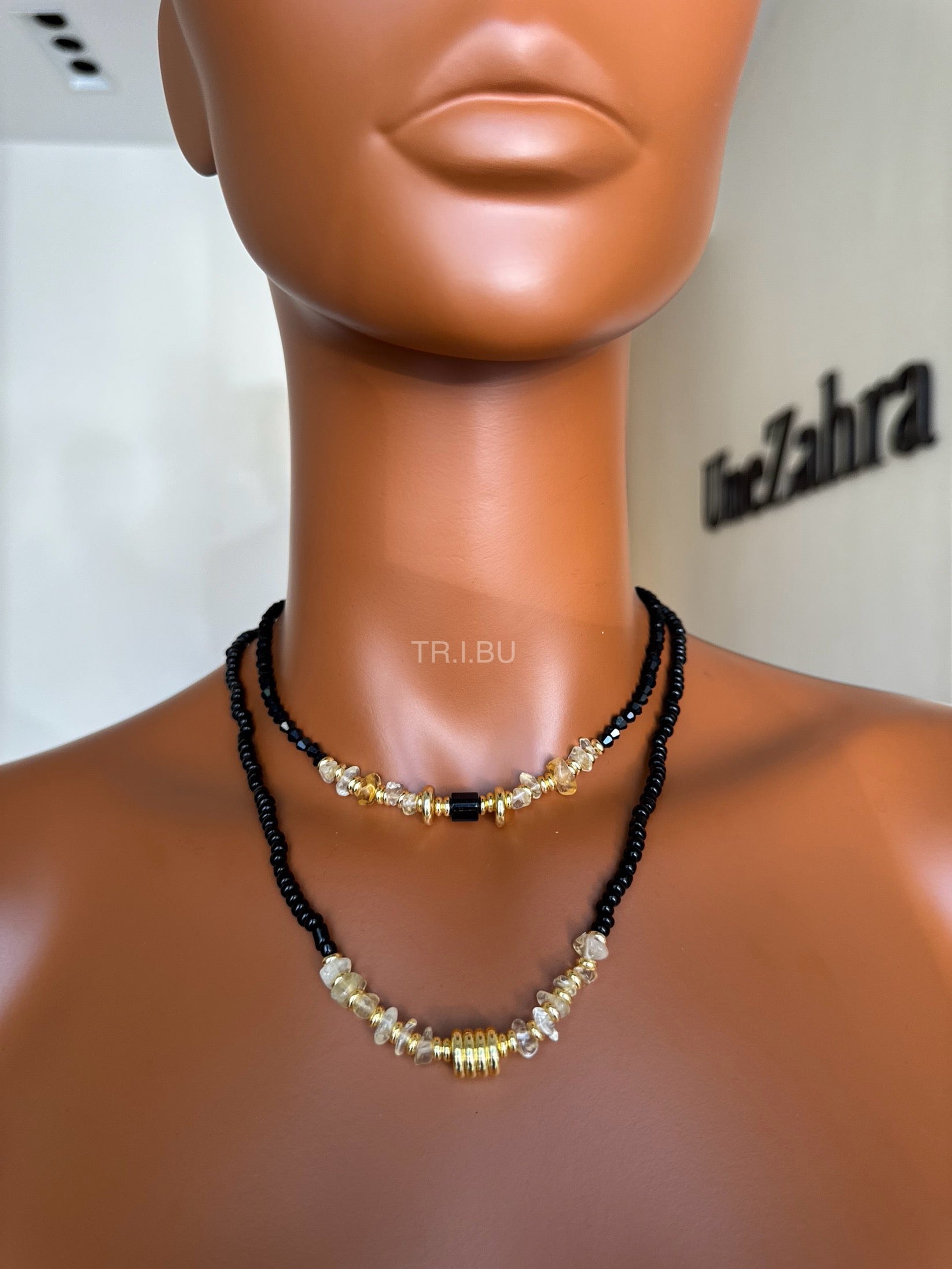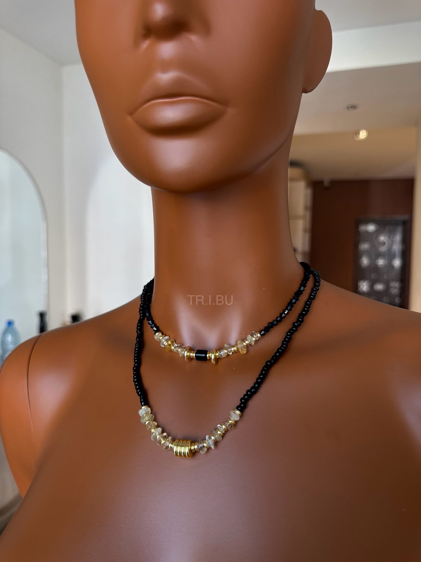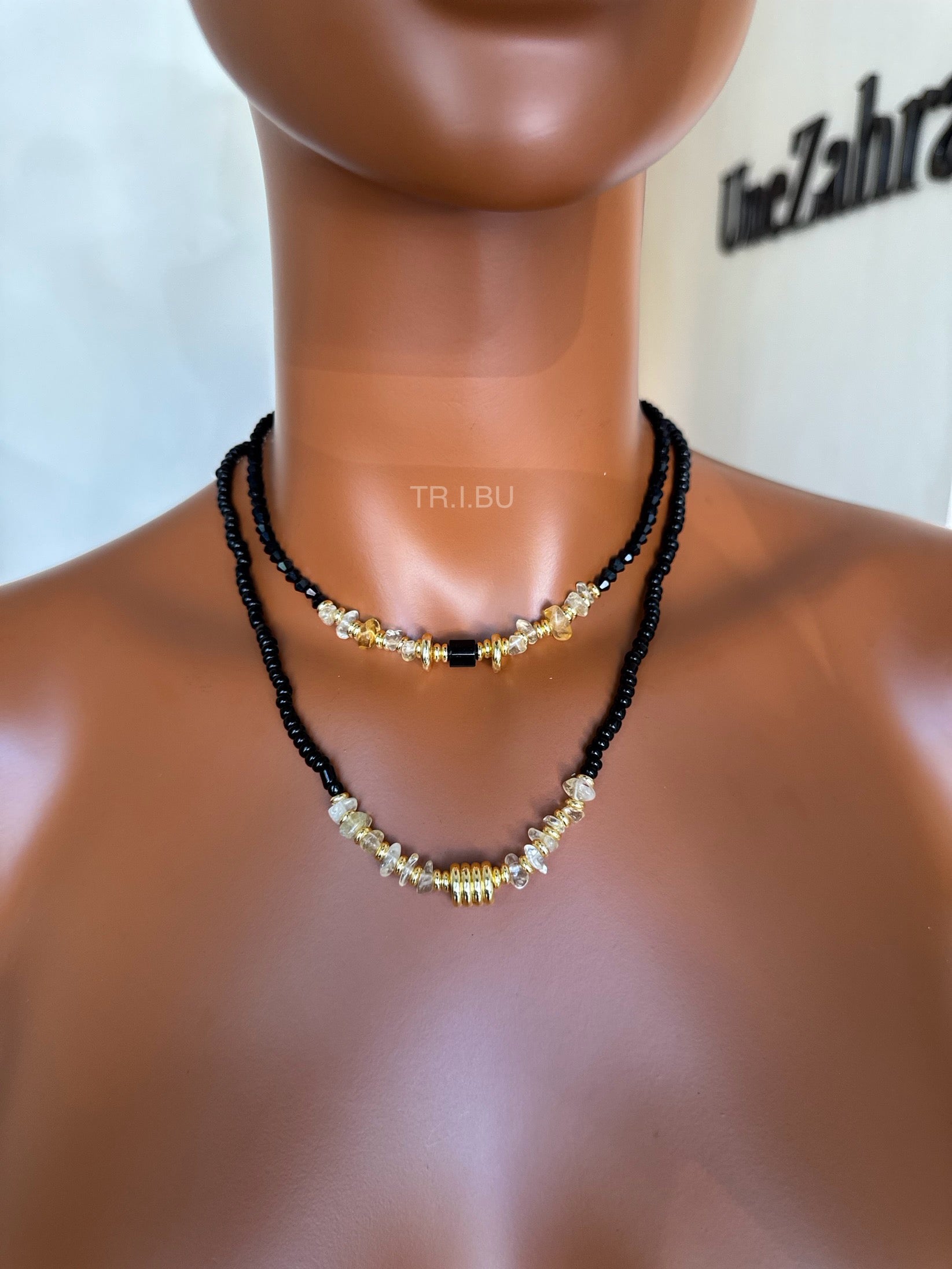 Collier double rang en perles noires profondes, illuminé de pierres translucides et de reflets dorés, comme un jeu d’ombre et de lumière autour du cou.