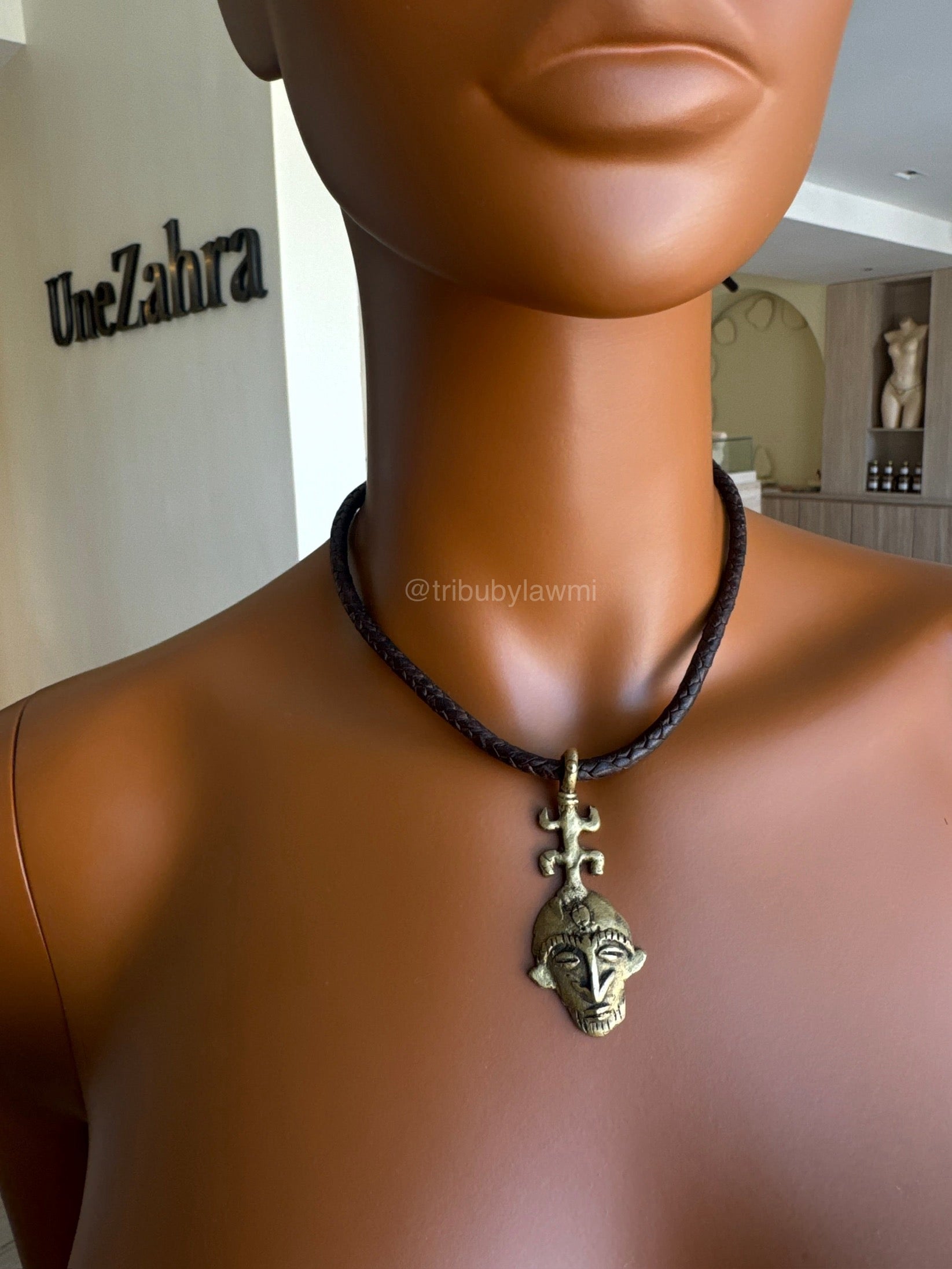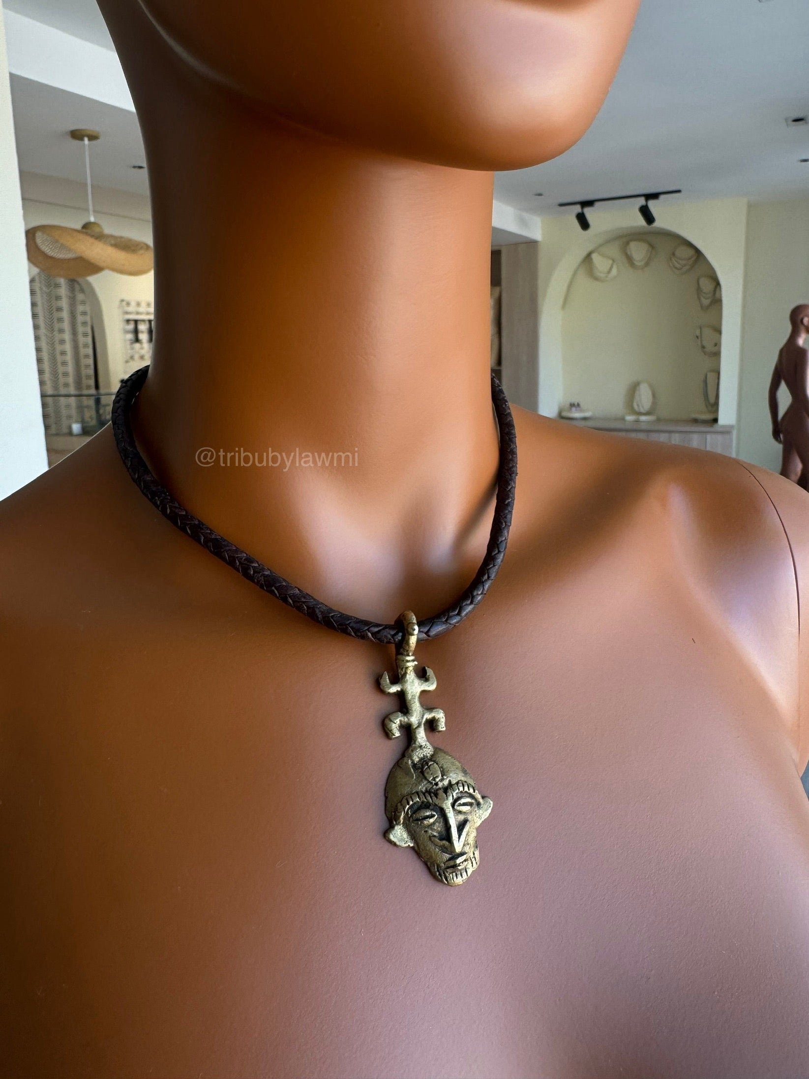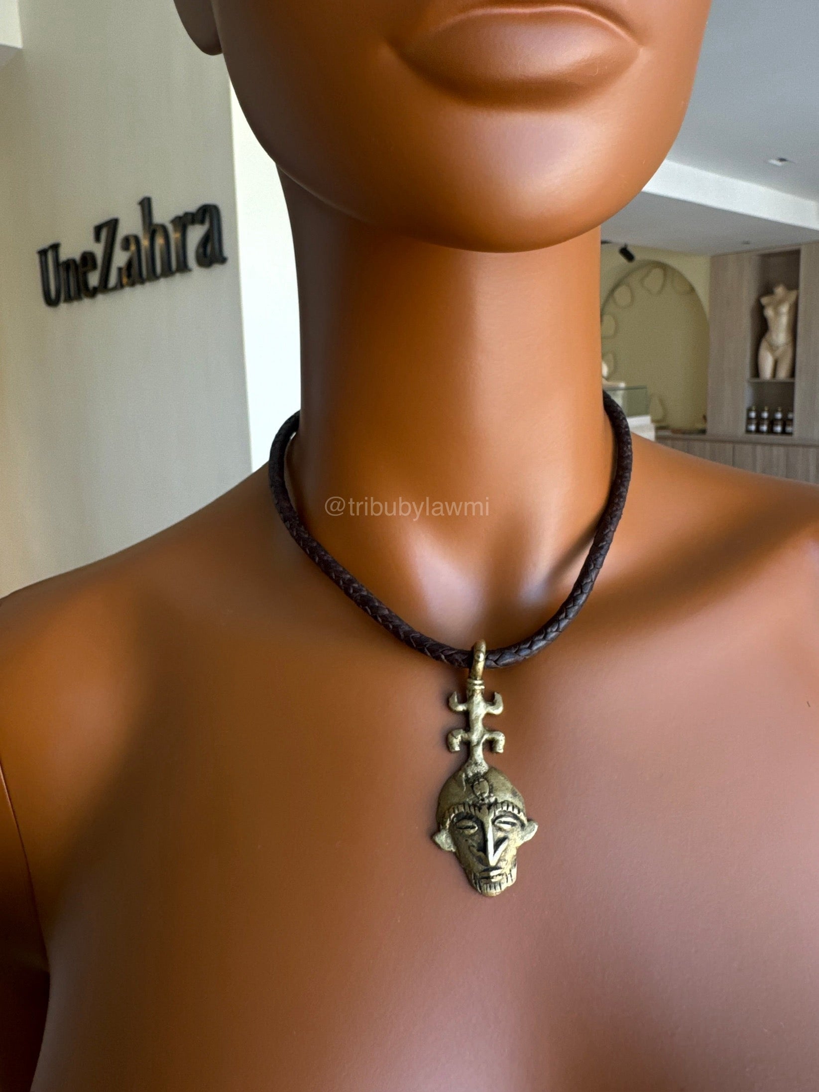 Collier traditionnel en cuir artisanale avec son pendentif en masque doré