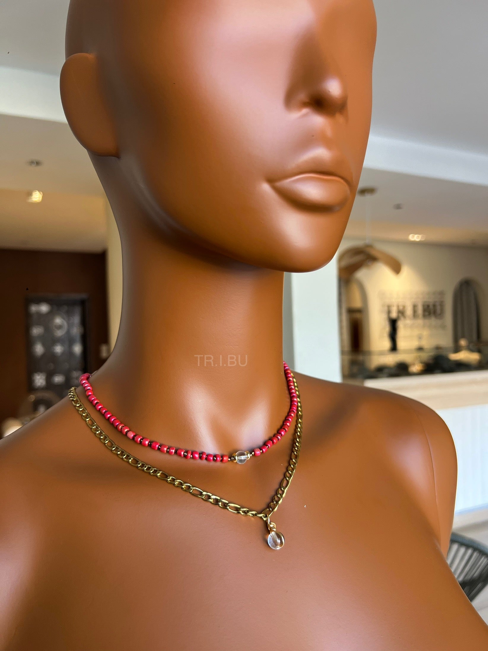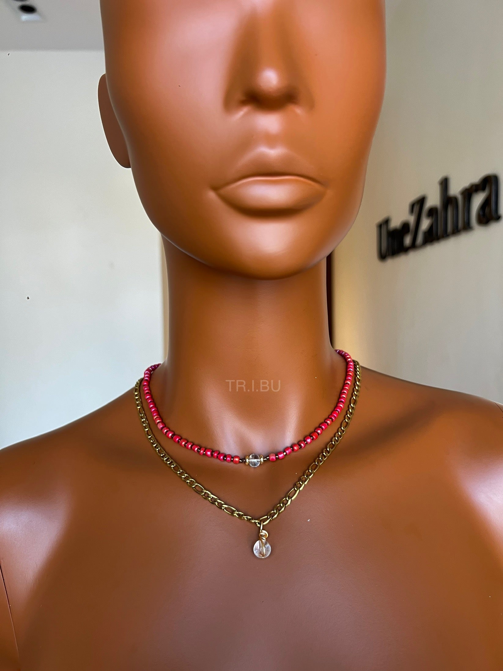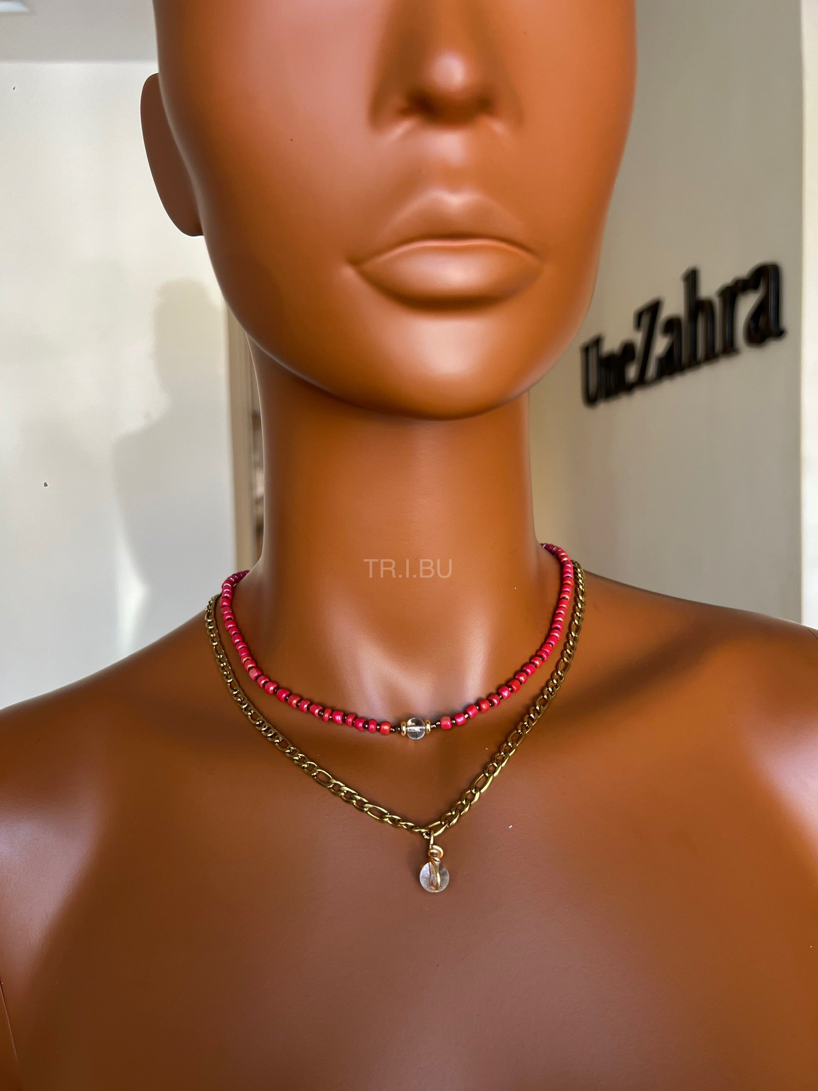 Collier double rang alliant finesse et éclat : un ras-de-cou en perles rouges illuminé d’une perle transparente, accompagné d’une chaîne en acier inoxydable doré, ornée d’un pendentif cristal qui capte la lumière avec élégance.