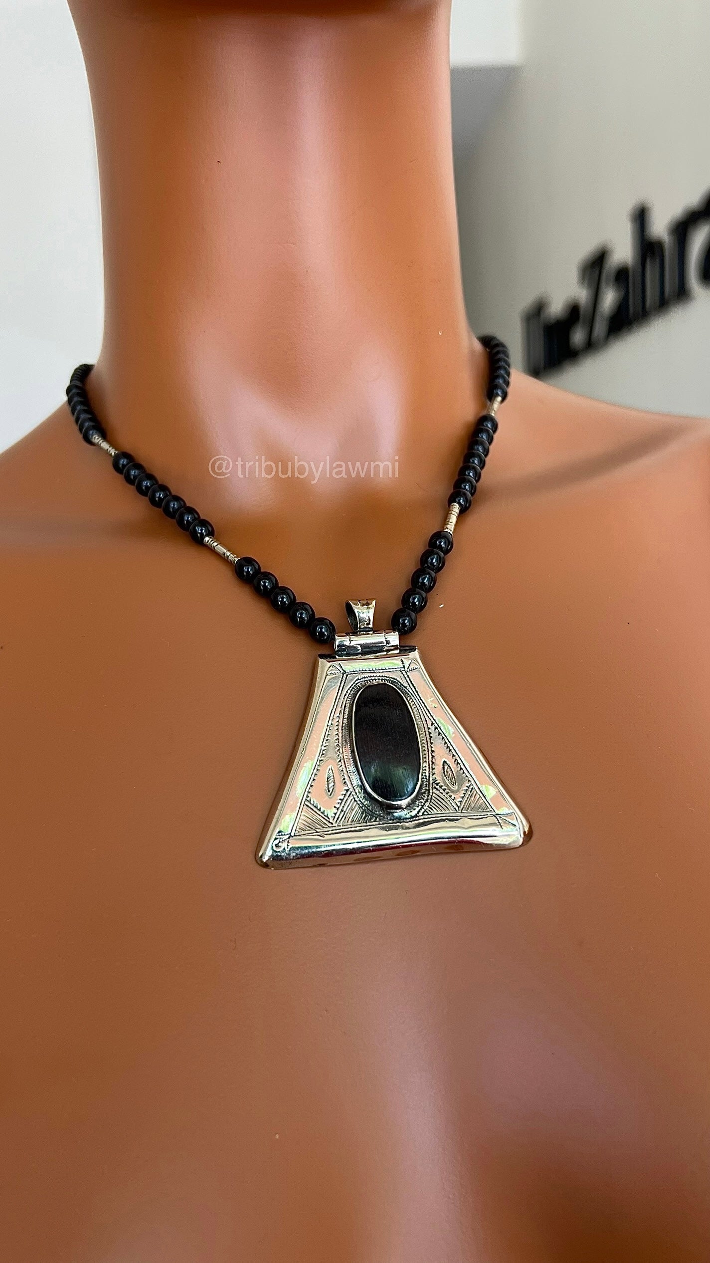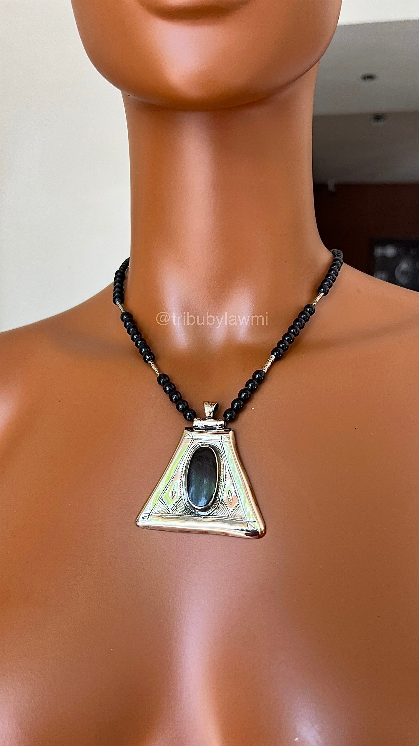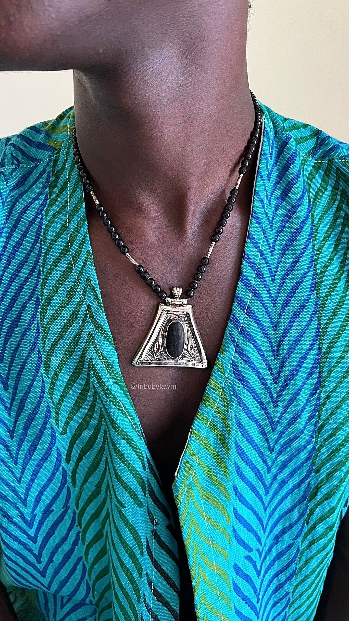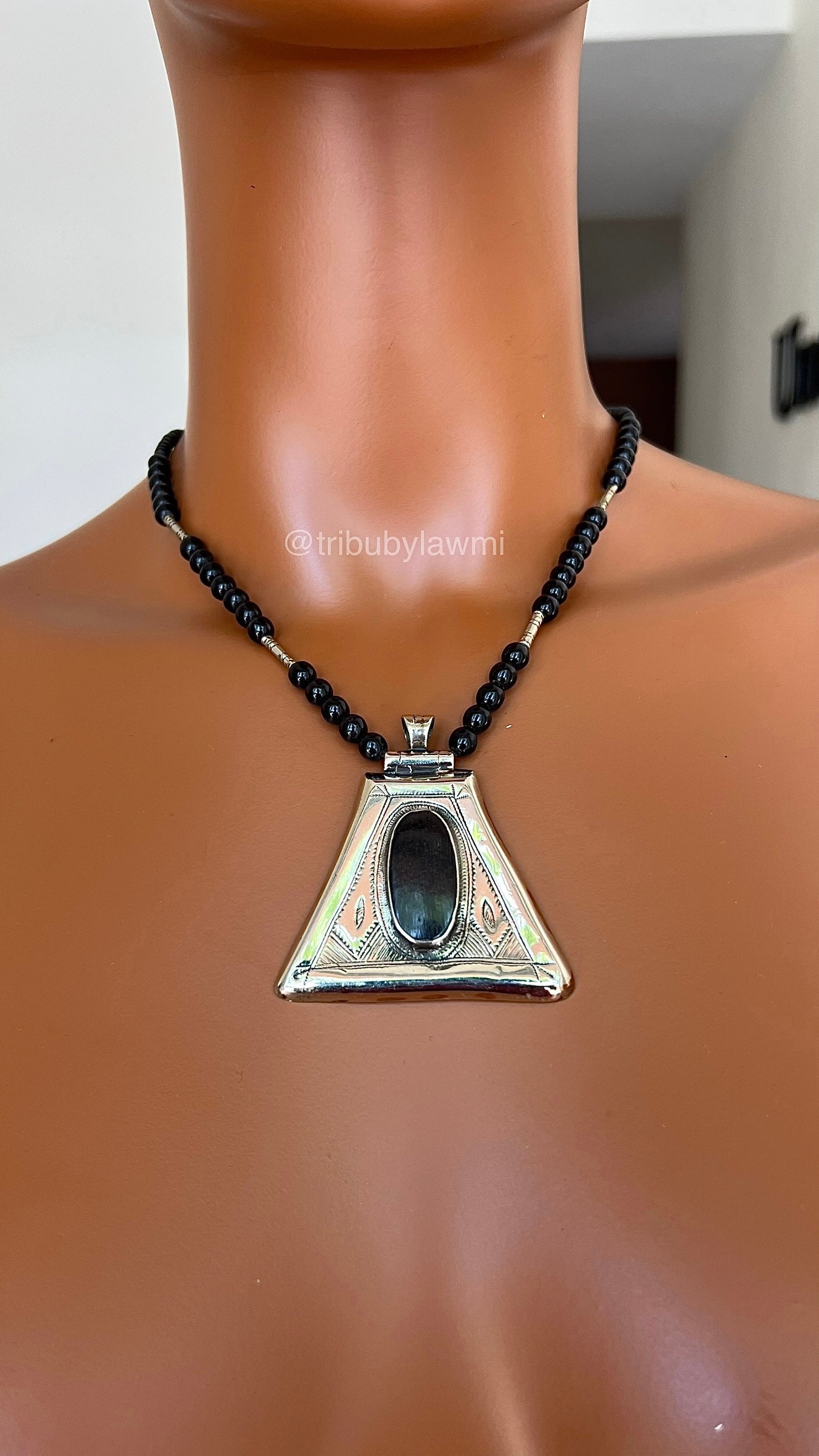 Collier en perles noires ponctué de touches argentées, porté par un pendentif triangulaire en métal finement gravé. En son centre, une pierre ovale sombre attire le regard, mêlant force graphique et héritage artisanal.