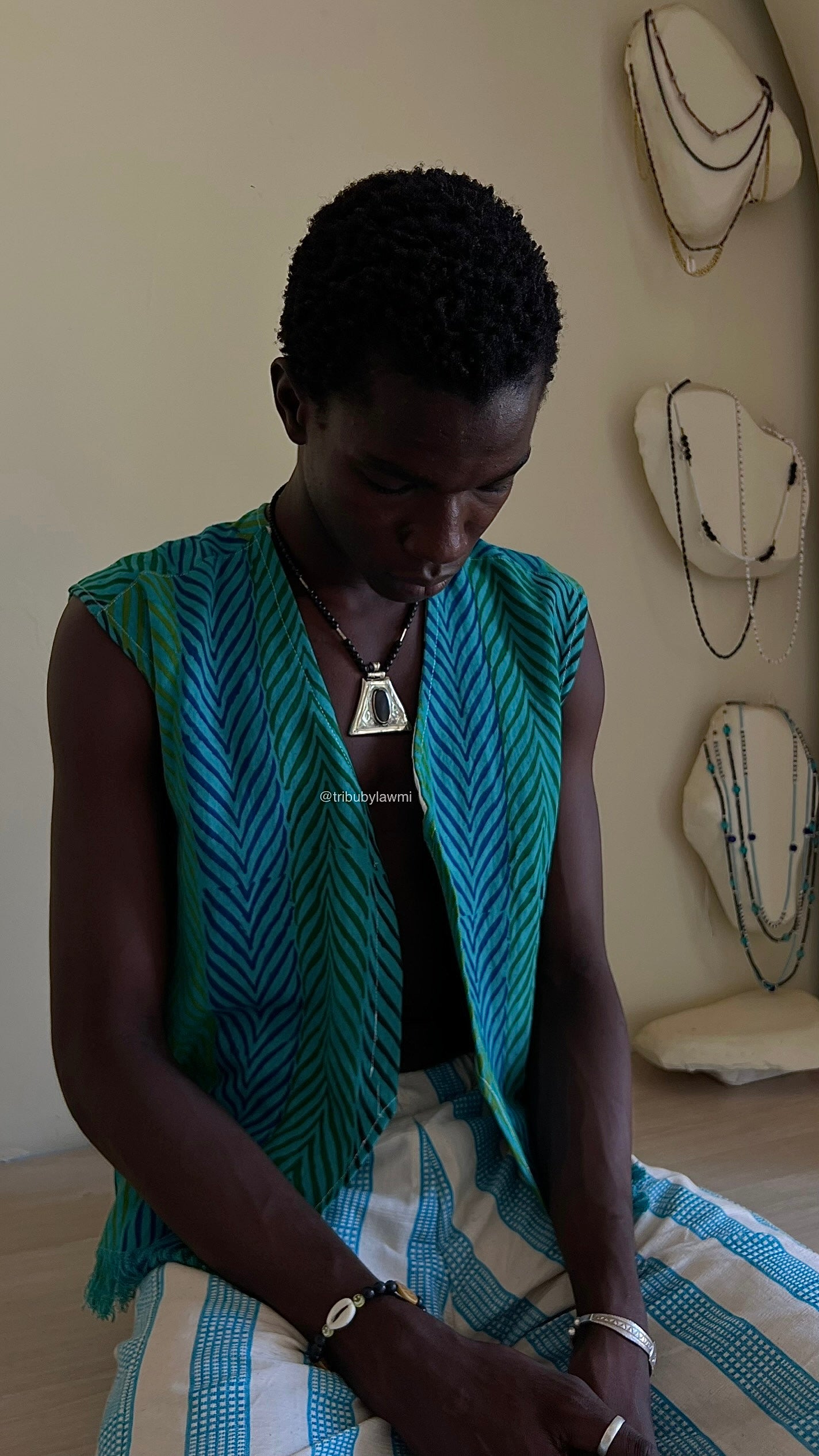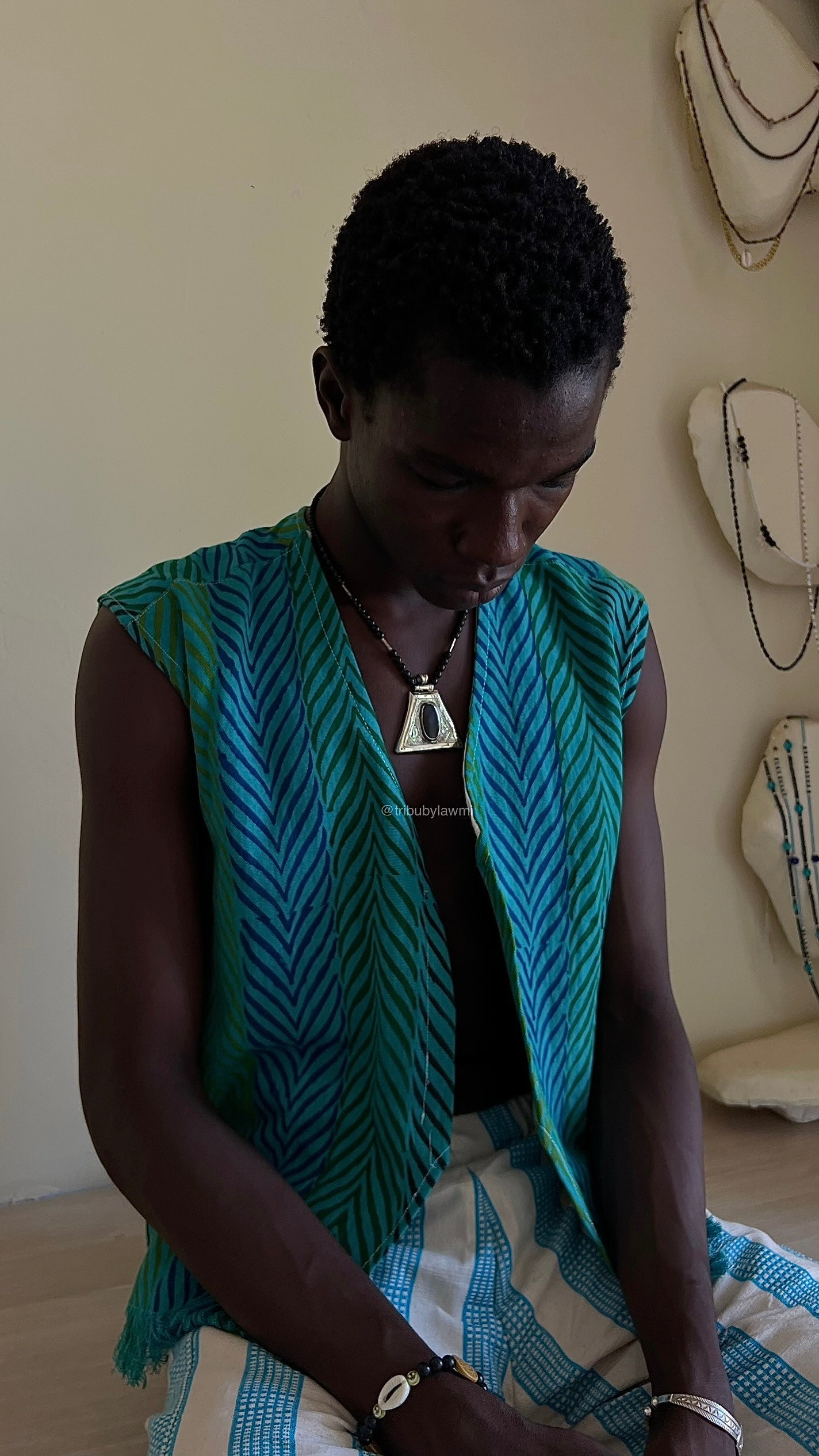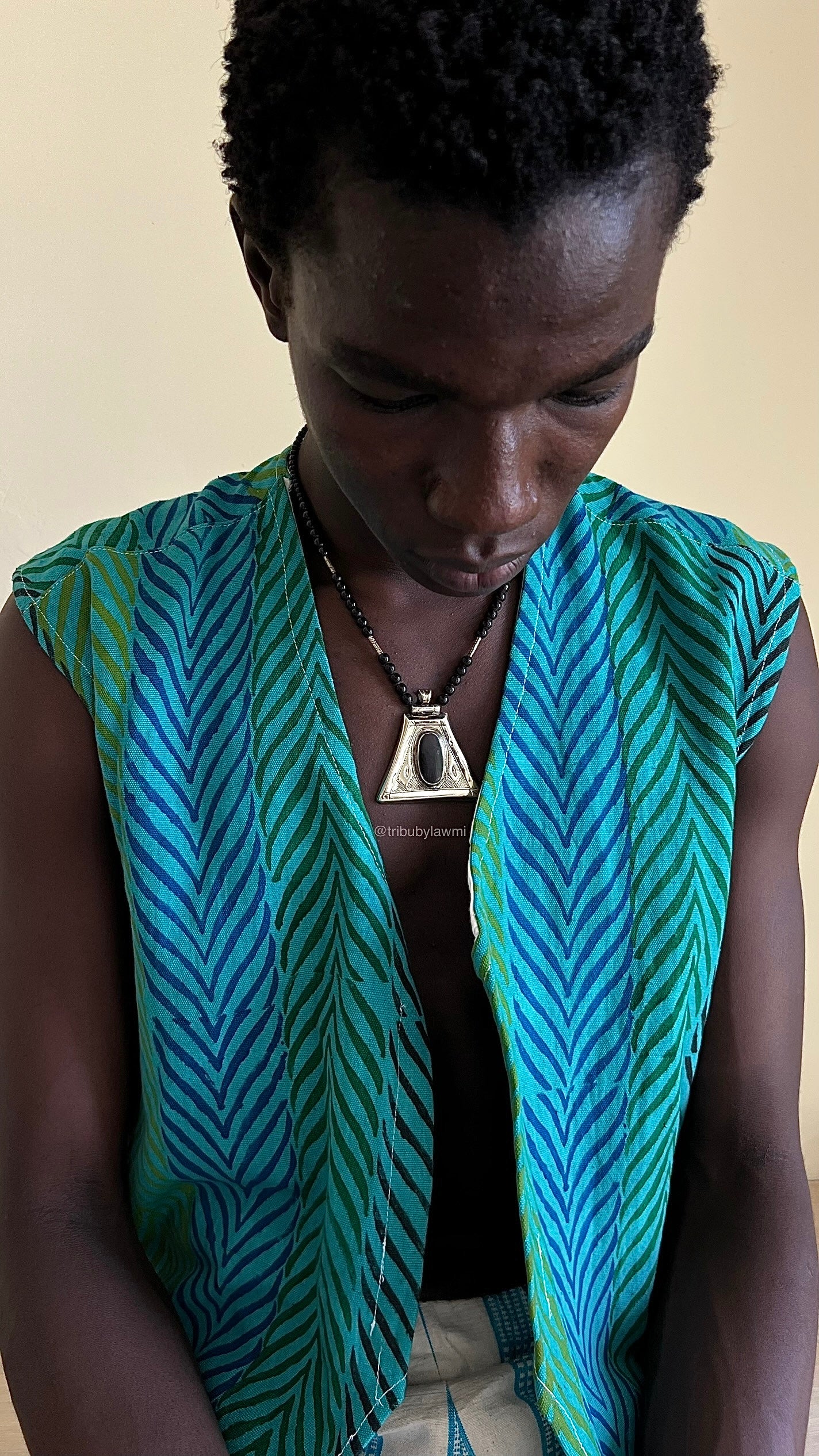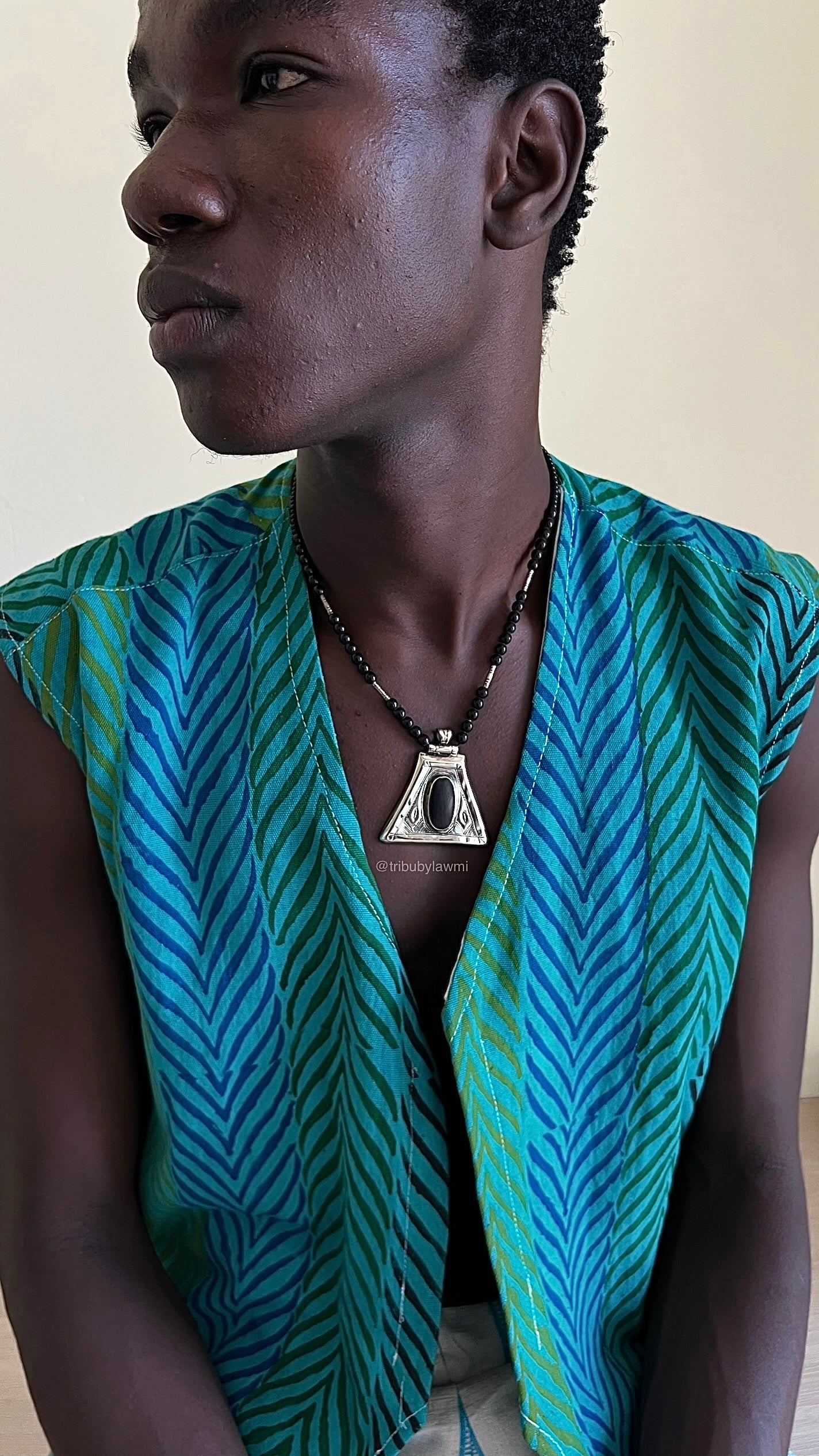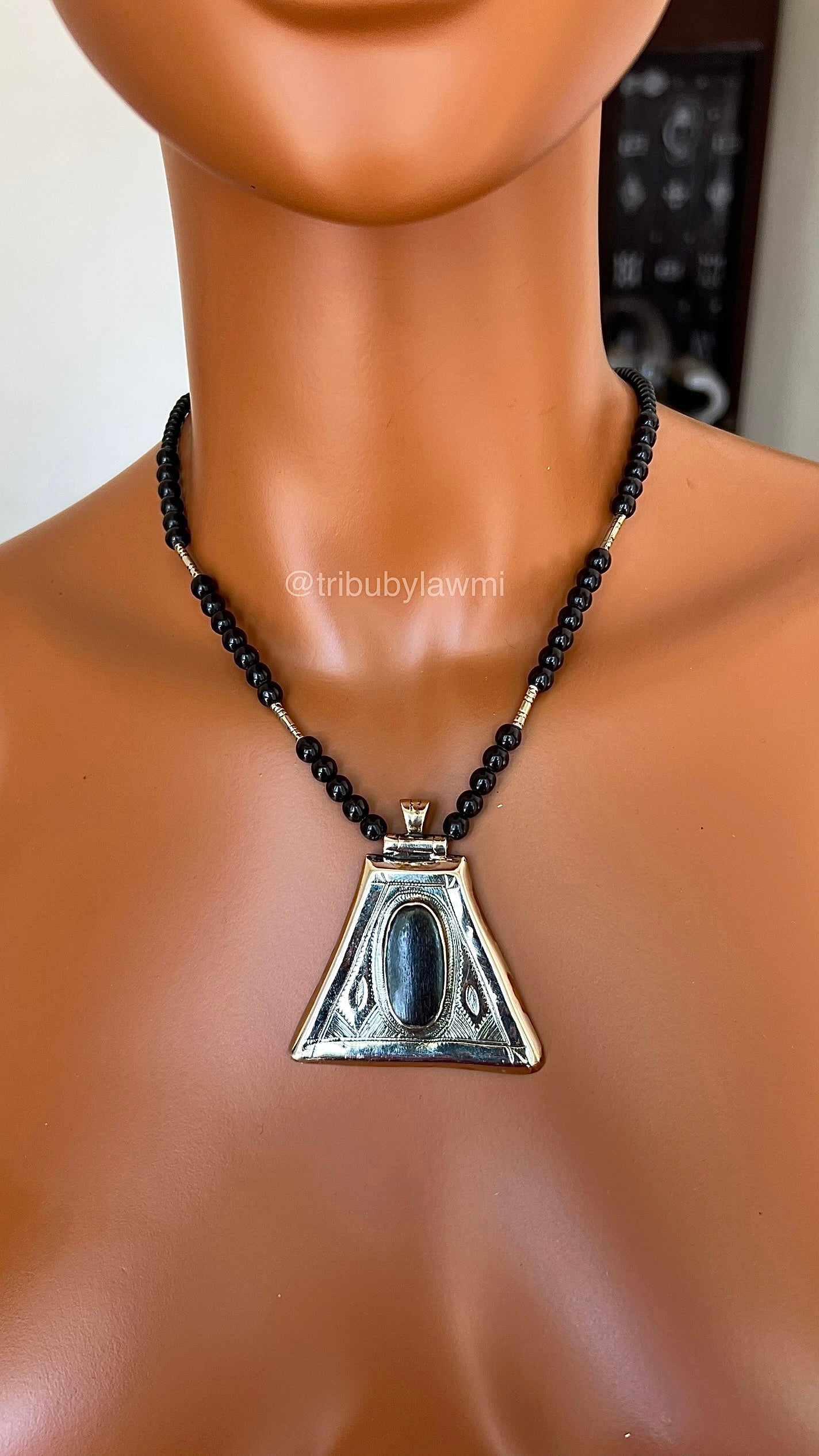 Collier en perles noires ponctué de touches argentées, porté par un pendentif triangulaire en métal finement gravé. En son centre, une pierre ovale sombre attire le regard, mêlant force graphique et héritage artisanal.